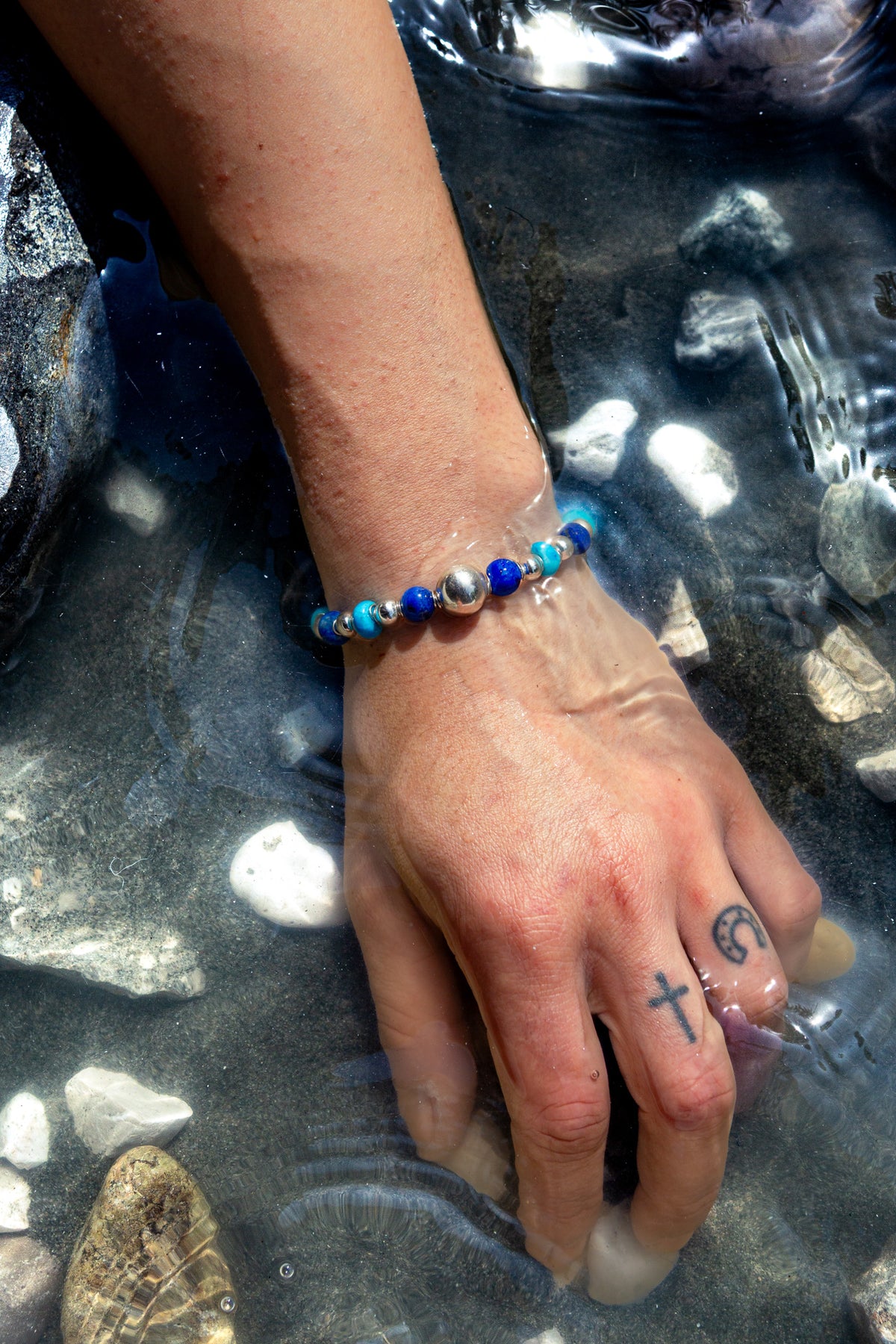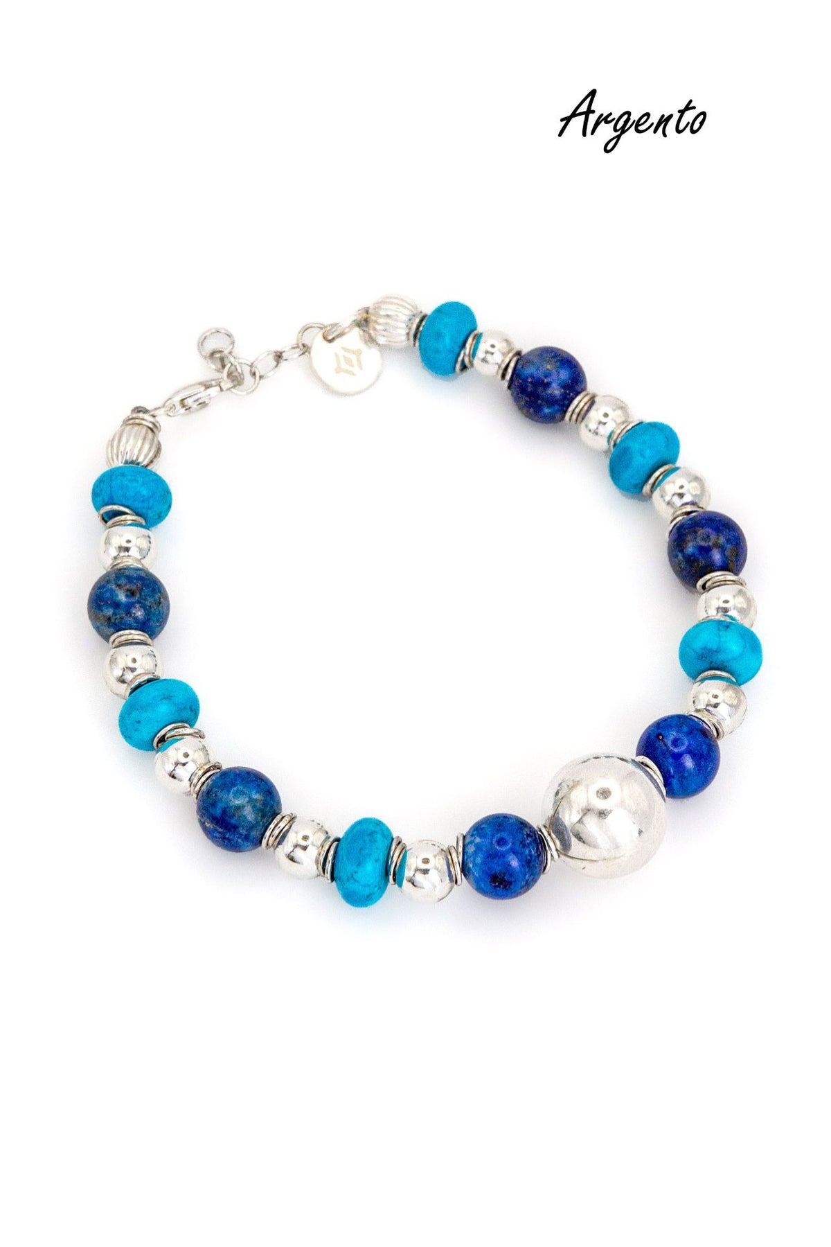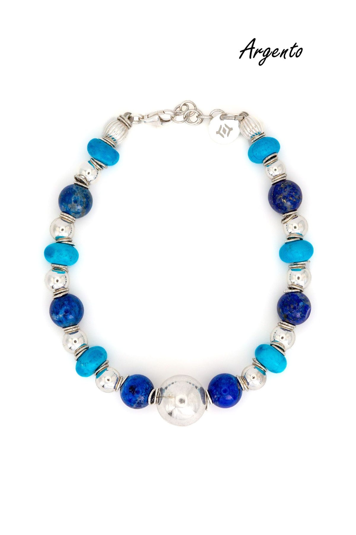 "Nettuno" è un bracciale realizzato con sfere in argento di dimensione 5 millimetri, sfere in pietra naturale: lapislazzulo blu e turchese. Ad alternare ogni sfera vi sono due anelle in argento. Al centro una sfera in argento di diametro 12 millimetri. Il bracciale Nettuno è unisex come tutte le altre nostre creazioni, da indossare da solo o insieme ad altri gioielli Cryady. Ogni creazione Cryady è realizzata artigianalmente con amore e passione. I materiali utilizzati sono certificati in rispetto delle normative vigenti CEE.