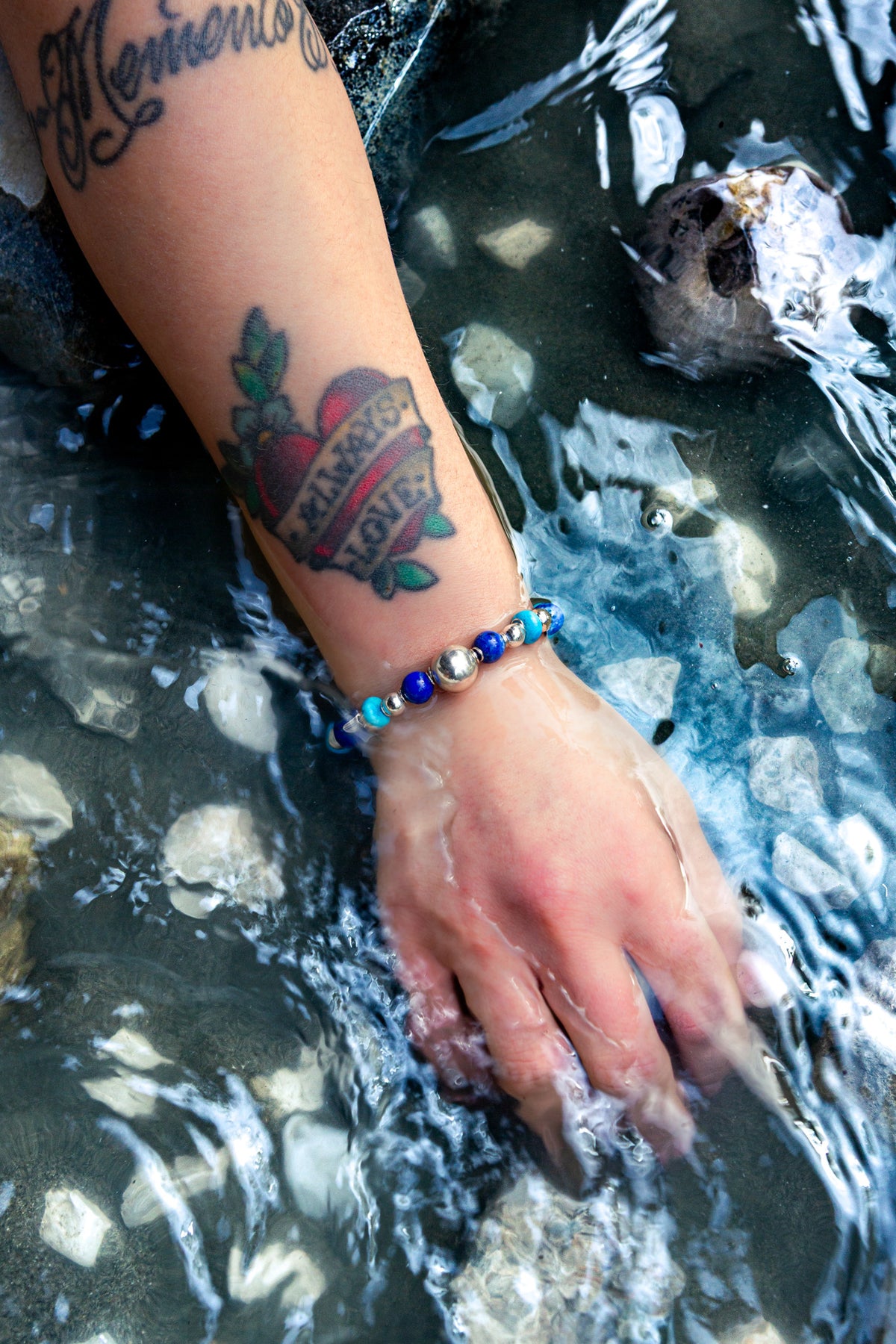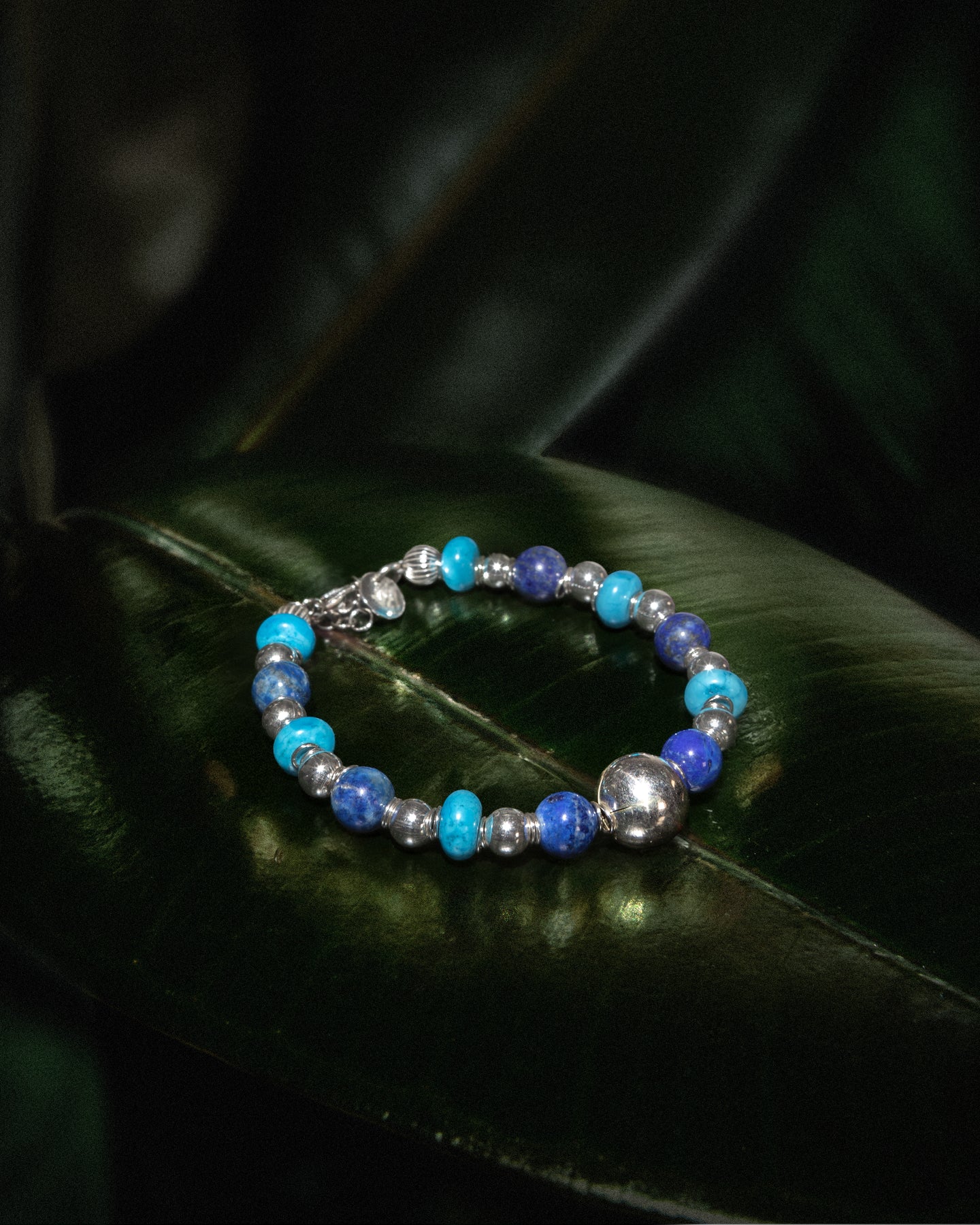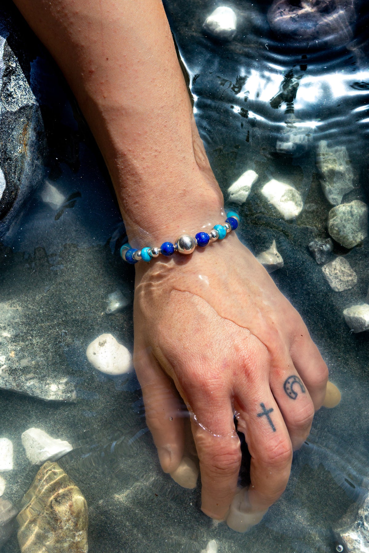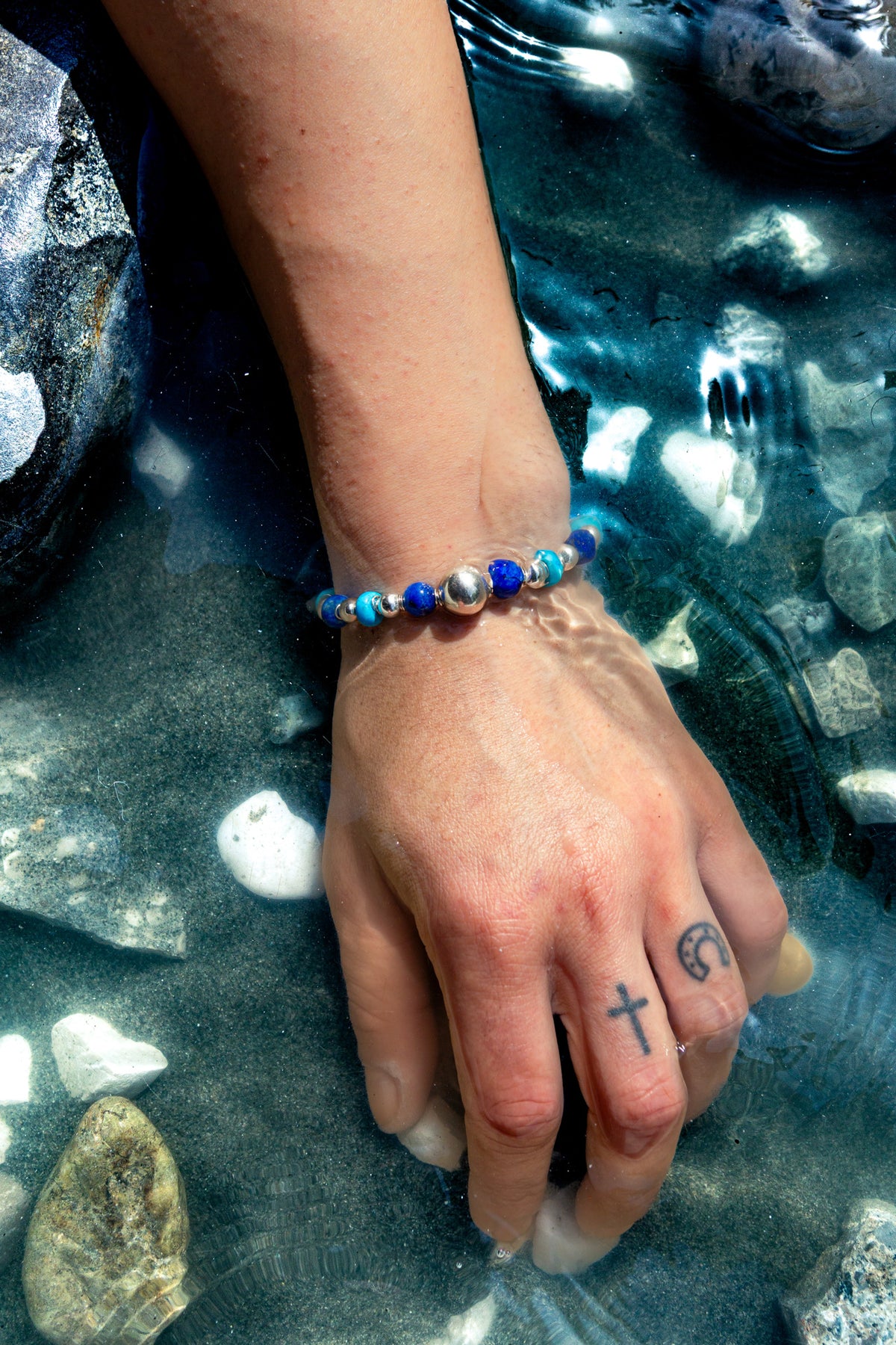 "Nettuno" è un bracciale realizzato con sfere in argento di dimensione 5 millimetri, sfere in pietra naturale: lapislazzulo blu e turchese. Ad alternare ogni sfera vi sono due anelle in argento. Al centro una sfera in argento di diametro 12 millimetri. Il bracciale Nettuno è unisex come tutte le altre nostre creazioni, da indossare da solo o insieme ad altri gioielli Cryady. Ogni creazione Cryady è realizzata artigianalmente con amore e passione. I materiali utilizzati sono certificati in rispetto delle normative vigenti CEE.