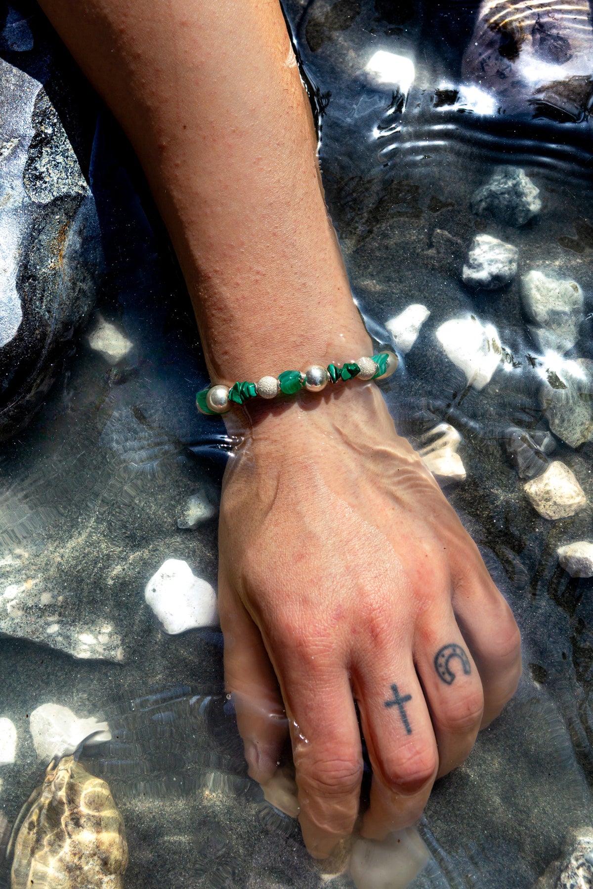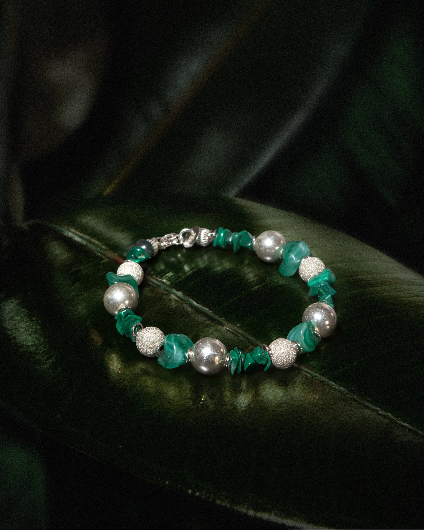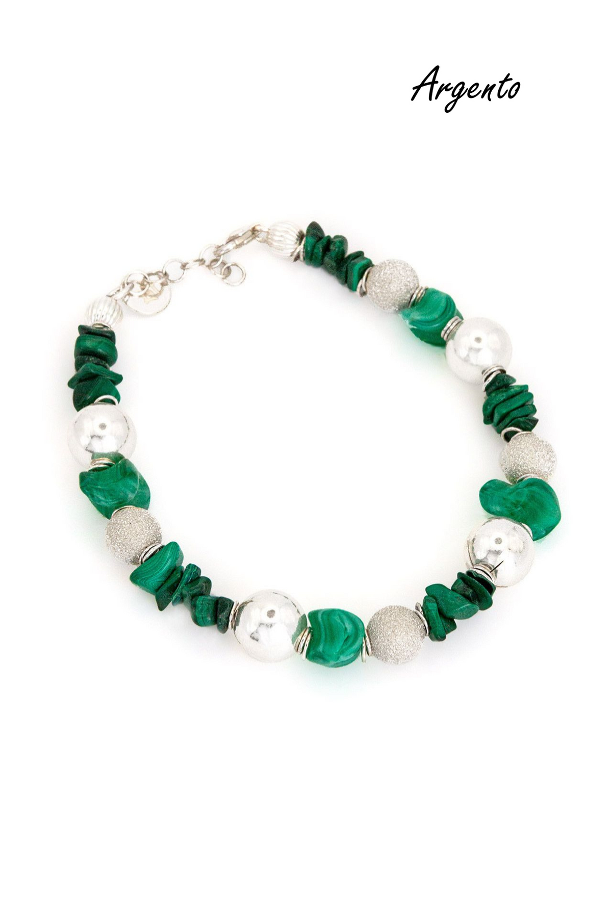 "Pleiadi" è un bracciale realizzato con sfere in argento lisce in millimetri 10 e sfere in argento in millimetri 8 con lavorazione puntinata che rende un effetto brillante su tutta la loro superficie fere. Il colore che caratterizza questo splendido bracciale è il verde grazie alle pietre in malachite e le componenti in cristallo verde con venature bianche dalla forma irregolare. Ad alternare ogni sfera vi sono due anelle in argento. Il bracciale Pleiadi è unisex come tutte le altre nostre creazioni, da indossare da solo o insieme ad altri gioielli Cryady. Ogni creazione Cryady è realizzata artigianalmente con amore e passione. I materiali utilizzati sono certificati in rispetto delle normative vigenti CEE.