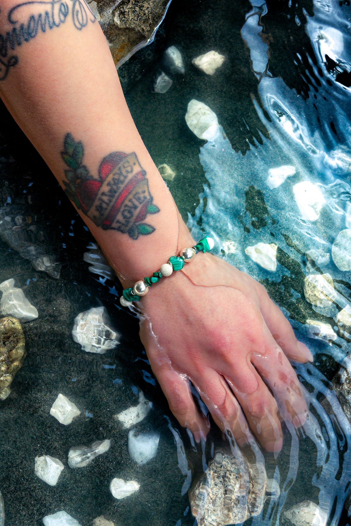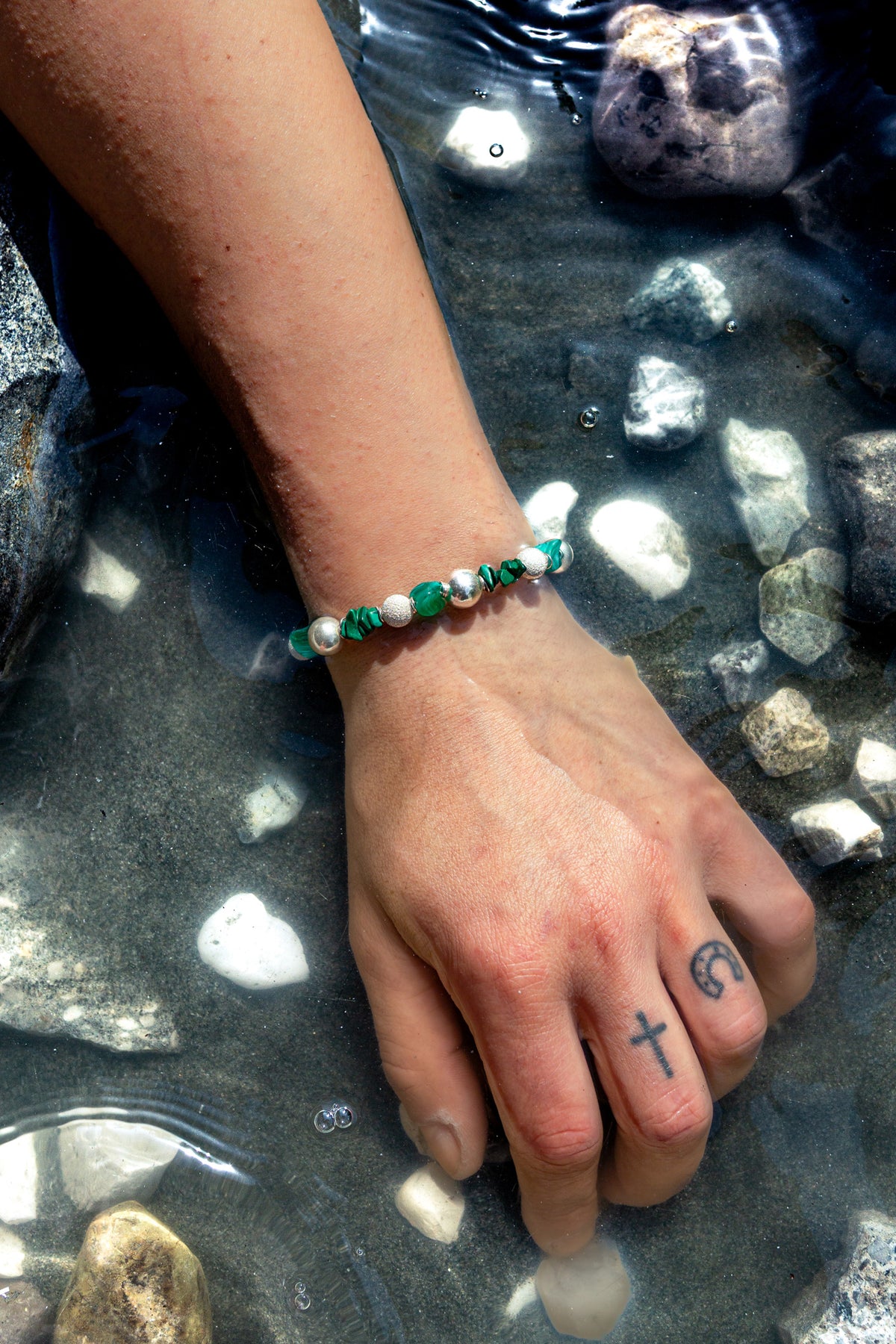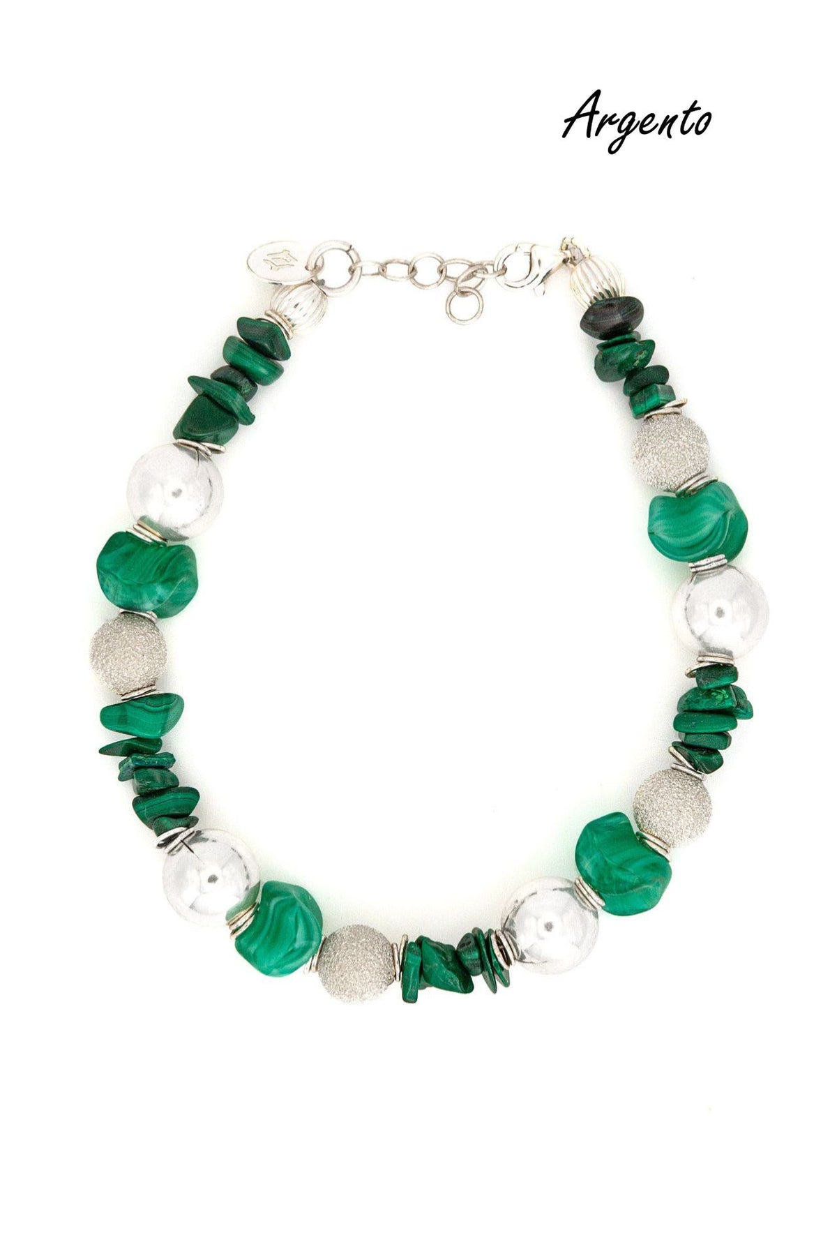 "Pleiadi" è un bracciale realizzato con sfere in argento lisce in millimetri 10 e sfere in argento in millimetri 8 con lavorazione puntinata che rende un effetto brillante su tutta la loro superficie fere. Il colore che caratterizza questo splendido bracciale è il verde grazie alle pietre in malachite e le componenti in cristallo verde con venature bianche dalla forma irregolare. Ad alternare ogni sfera vi sono due anelle in argento. Il bracciale Pleiadi è unisex come tutte le altre nostre creazioni, da indossare da solo o insieme ad altri gioielli Cryady. Ogni creazione Cryady è realizzata artigianalmente con amore e passione. I materiali utilizzati sono certificati in rispetto delle normative vigenti CEE.