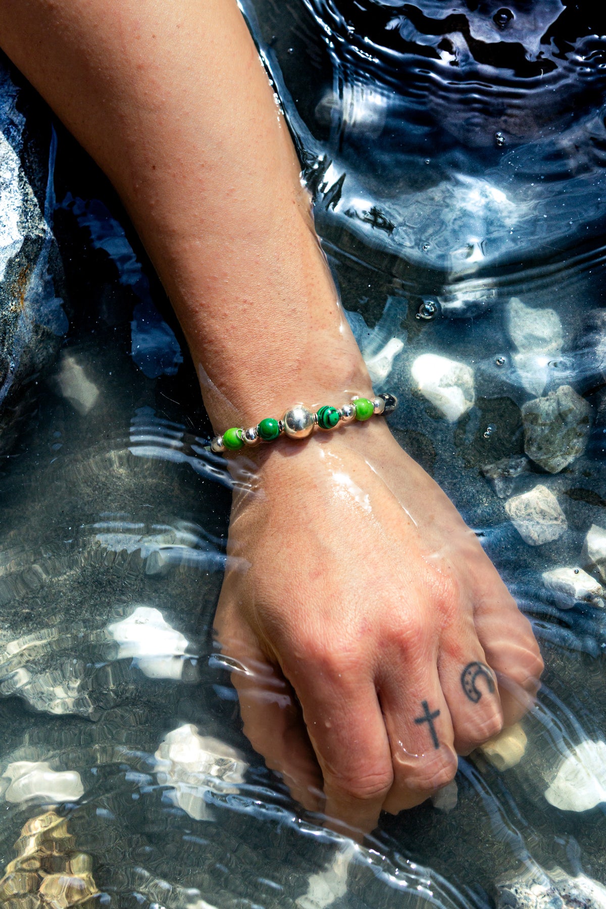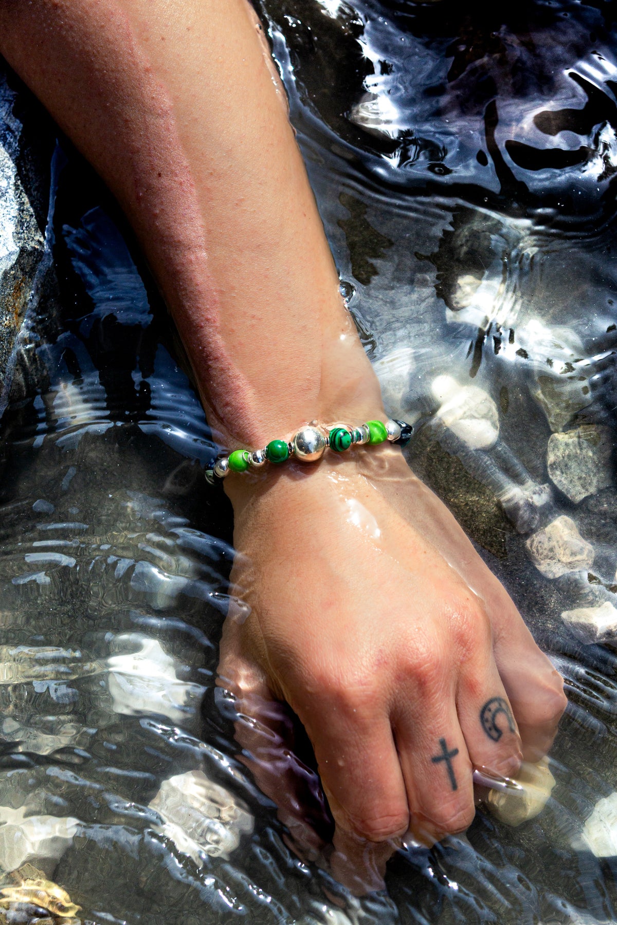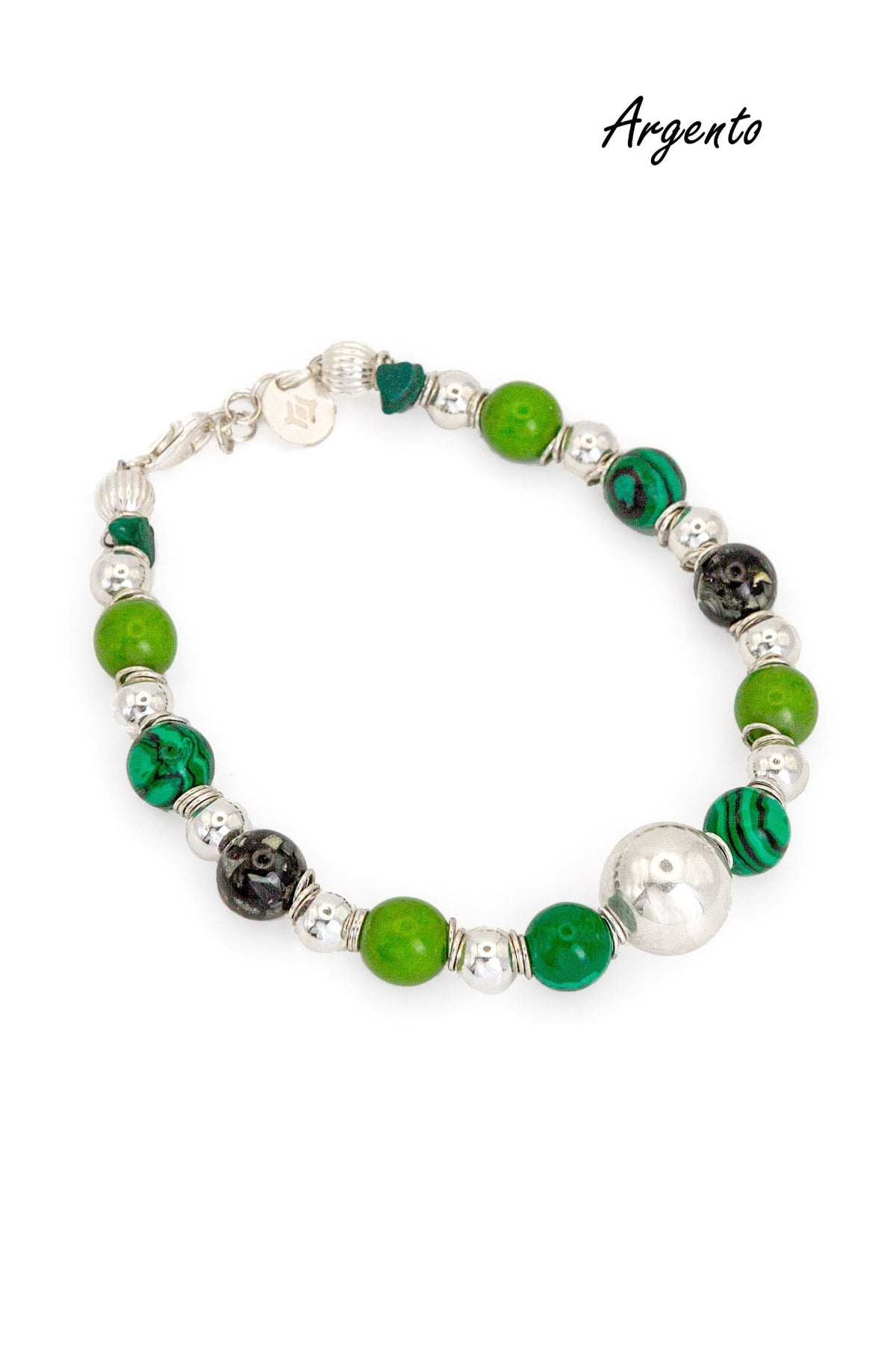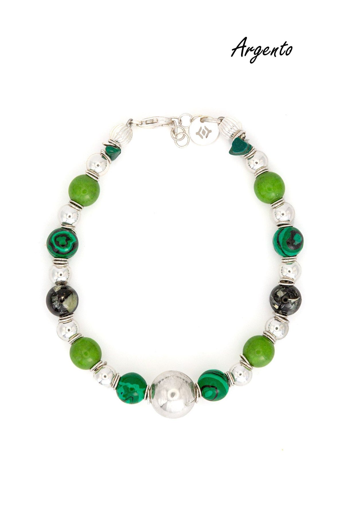 "Saturno" è un bracciale realizzato con sfere in argento di dimensione 5 millimetri, sfere in pietra naturale in malachite verde, cristallo verde lucido e cristallo con lavorazione a scaglie verde e nere. Ad alternare ogni sfera vi sono due anelle in argento. Al centro una sfera in argento di diametro 12 millimetri. Il bracciale Saturno è unisex come tutte le altre nostre creazioni, da indossare da solo o insieme ad altri gioielli Cryady. Ogni creazione Cryady è realizzata artigianalmente con amore e passione. I materiali utilizzati sono certificati in rispetto delle normative vigenti CEE.