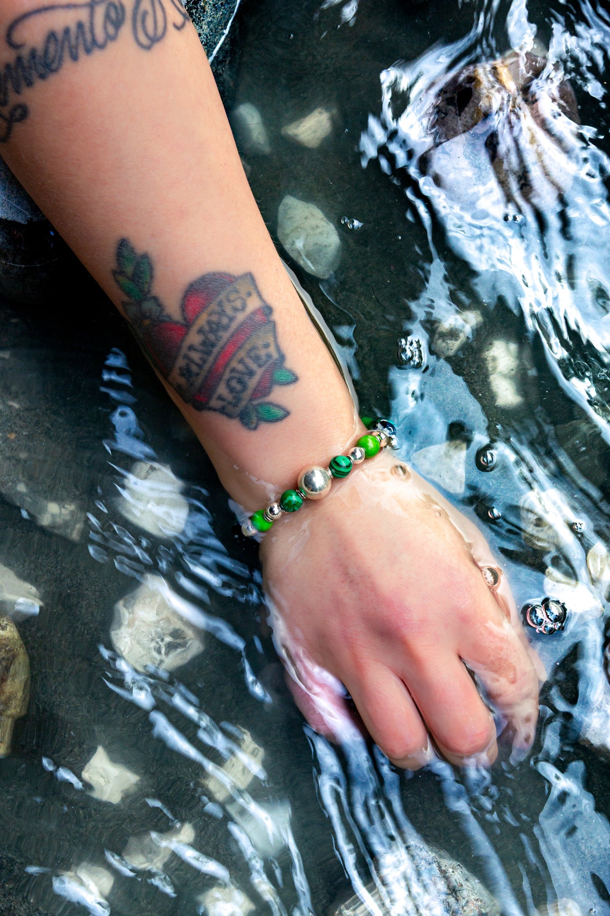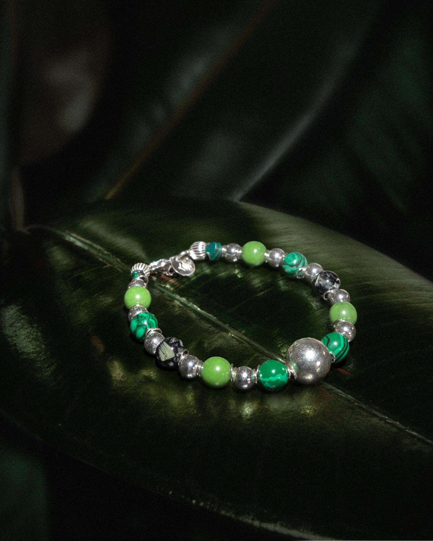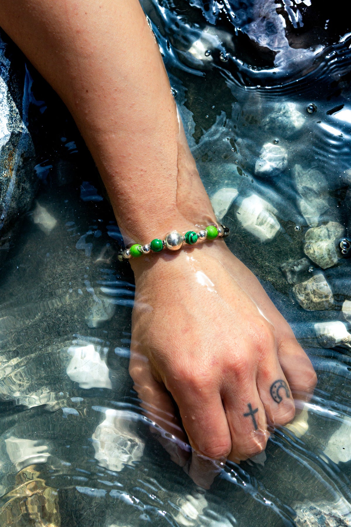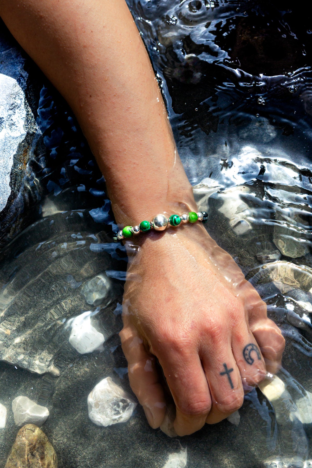 "Saturno" è un bracciale realizzato con sfere in argento di dimensione 5 millimetri, sfere in pietra naturale in malachite verde, cristallo verde lucido e cristallo con lavorazione a scaglie verde e nere. Ad alternare ogni sfera vi sono due anelle in argento. Al centro una sfera in argento di diametro 12 millimetri. Il bracciale Saturno è unisex come tutte le altre nostre creazioni, da indossare da solo o insieme ad altri gioielli Cryady. Ogni creazione Cryady è realizzata artigianalmente con amore e passione. I materiali utilizzati sono certificati in rispetto delle normative vigenti CEE.