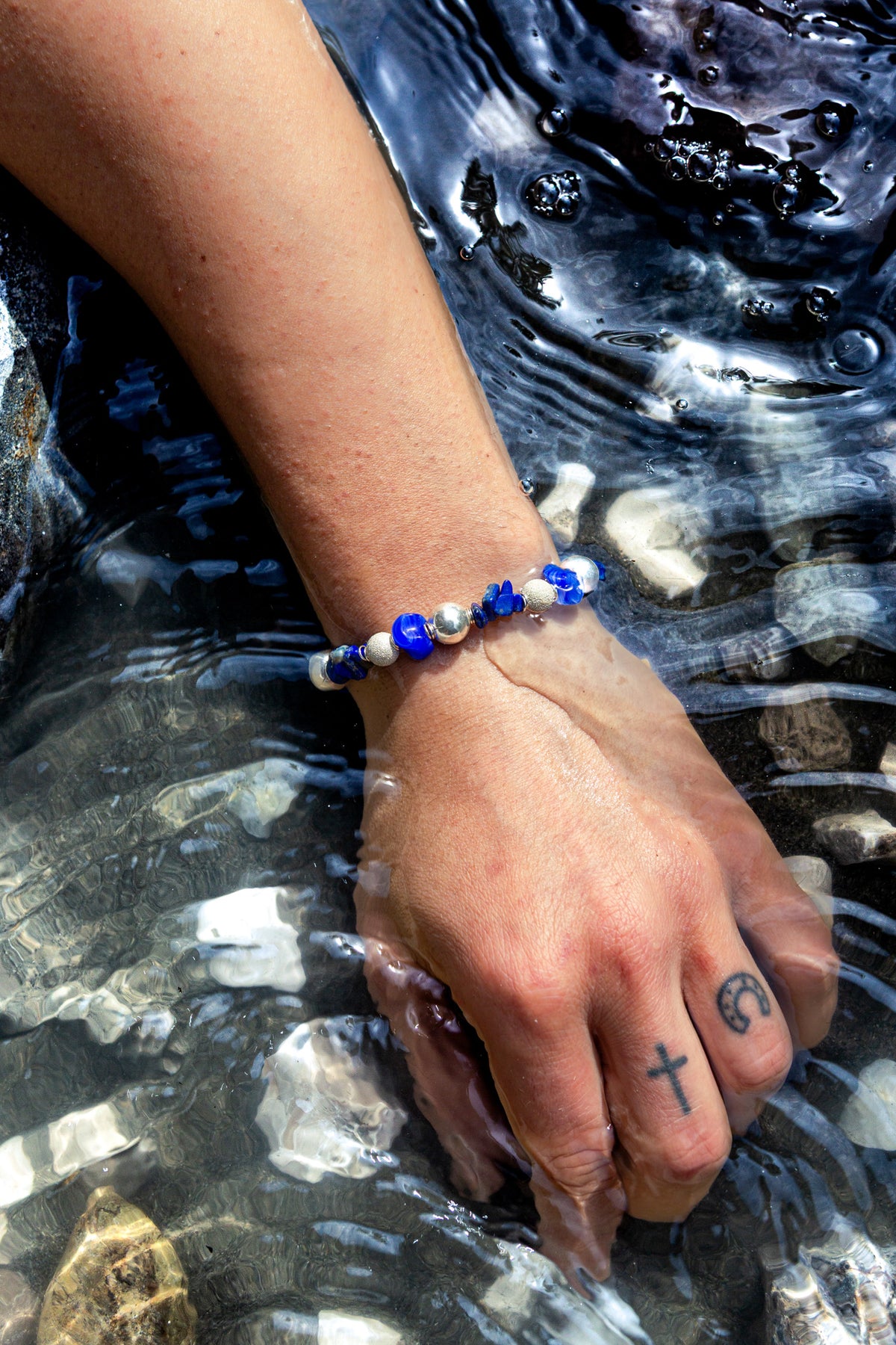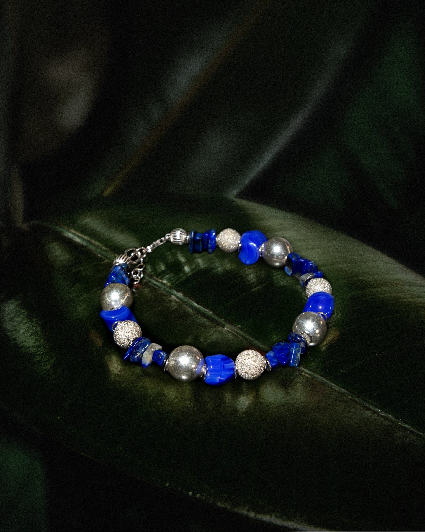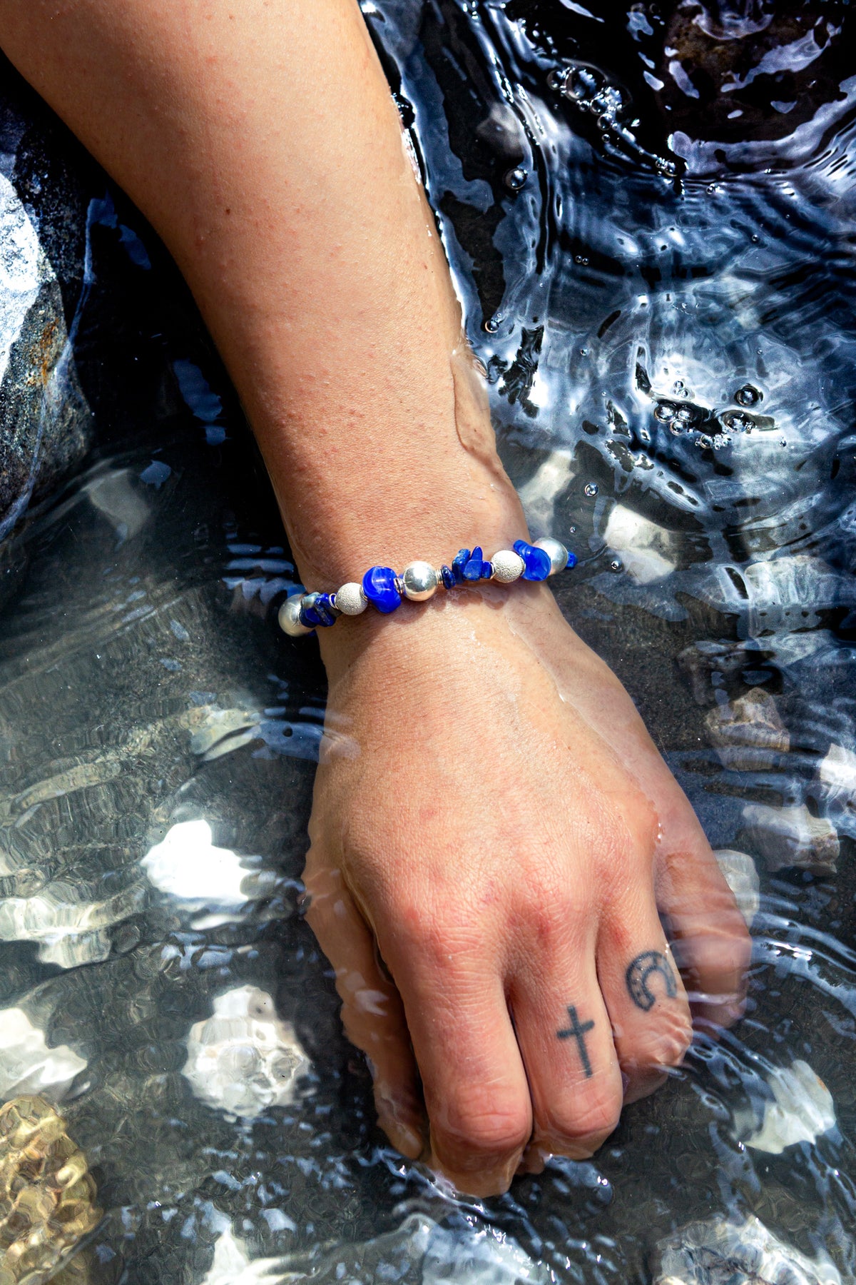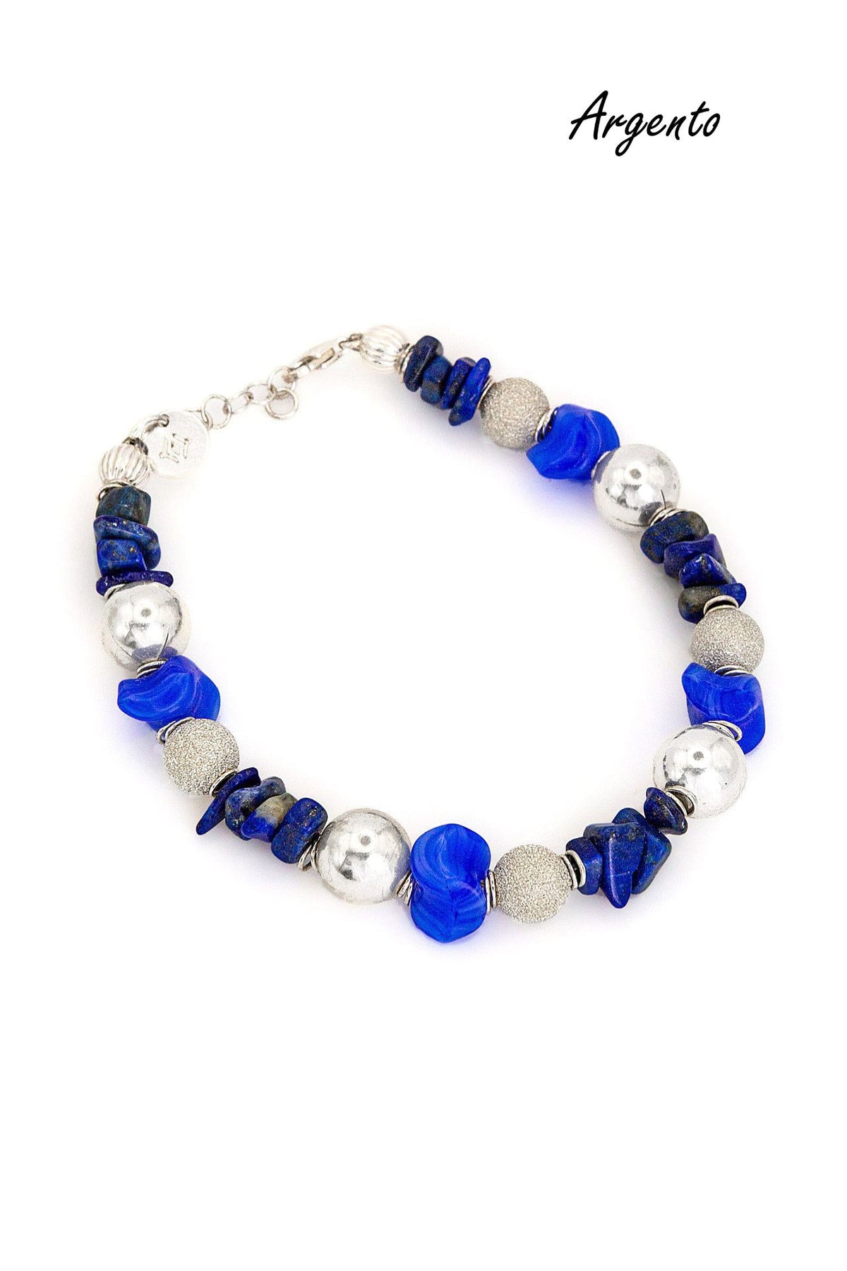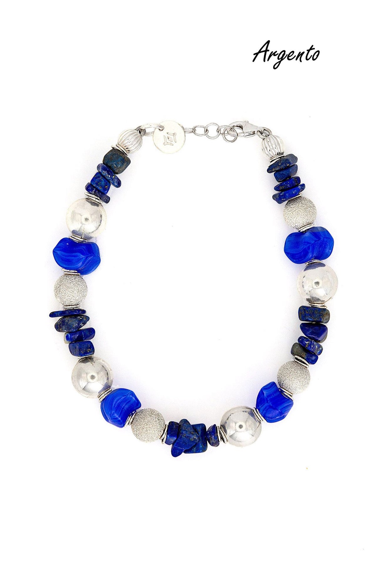 "Urano" è un bracciale realizzato con sfere in argento lisce in millimetri 10 e sfere in argento in millimetri 8 con lavorazione puntinata che rende un effetto brillante su tutta la loro superficie fere. Il colore che caratterizza questo splendido bracciale è il blu grazie alle pietre in lapislazzulo e le componenti in cristallo blu con venature bianche dalla forma irregolare. Ad alternare ogni sfera vi sono due anelle in argento. Il bracciale Urano è unisex come tutte le altre nostre creazioni, da indossare da solo o insieme ad altri gioielli Cryady. Ogni creazione Cryady è realizzata artigianalmente con amore e passione. I materiali utilizzati sono certificati in rispetto delle normative vigenti CEE.