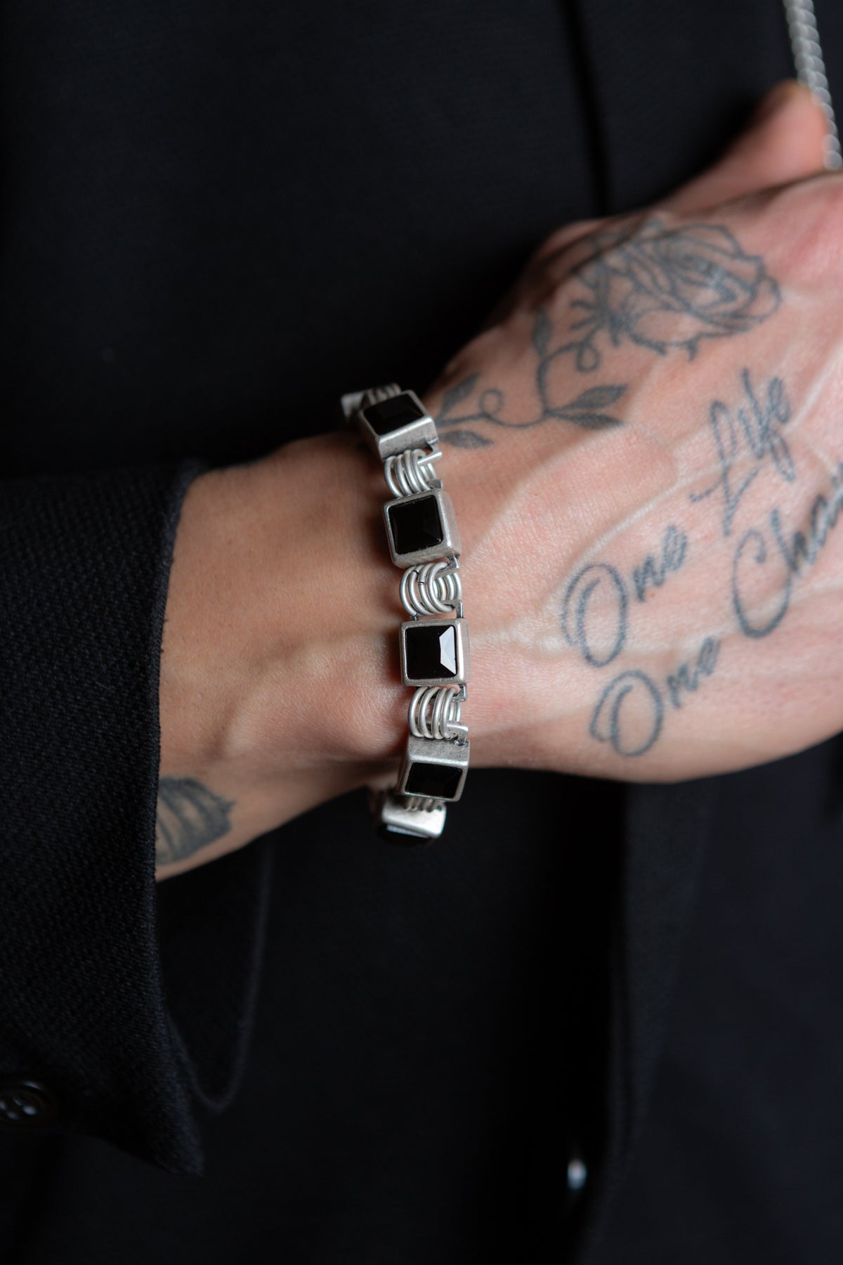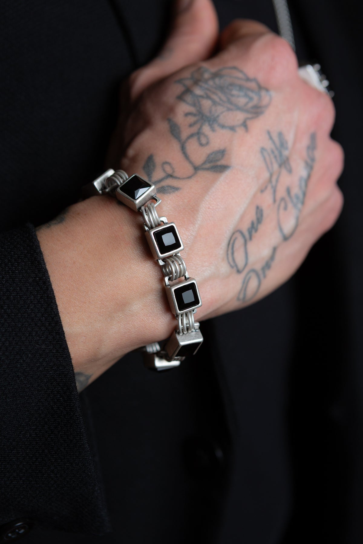 Il bracciale Eternity Nero deve la sua particolarità alle componenti quadrate realizzate a mano al cui centro è incastonata una pietra in cristallo nero quadrato sfaccettato. Il bracciale Eternity Nero è unisex come tutte le altre nostre creazioni, da indossare da solo o insieme ad altri gioielli Cryady. Ogni creazione Cryady è realizzata artigianalmente con amore e passione. I materiali utilizzati sono certificati in rispetto delle normative vigenti CEE.