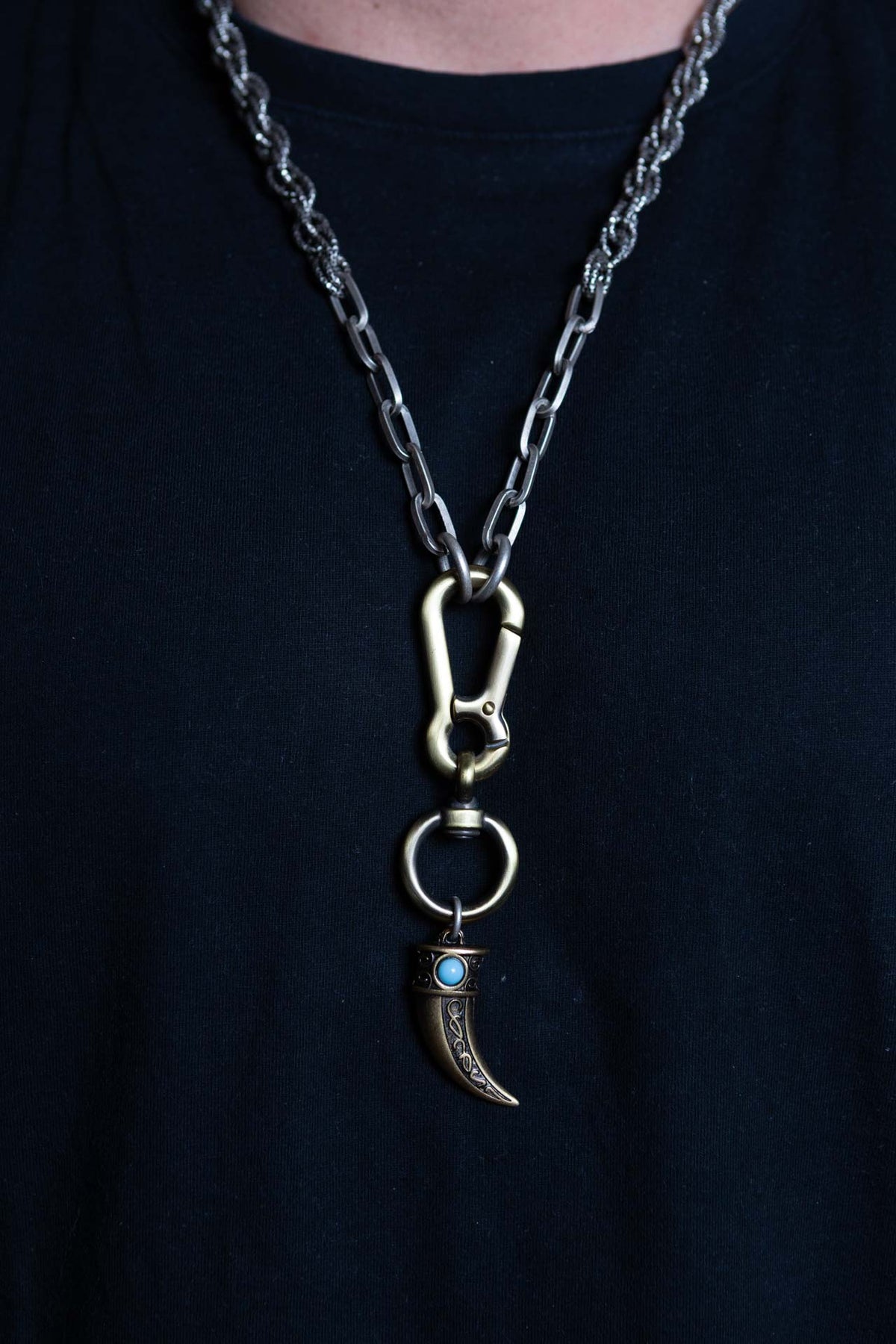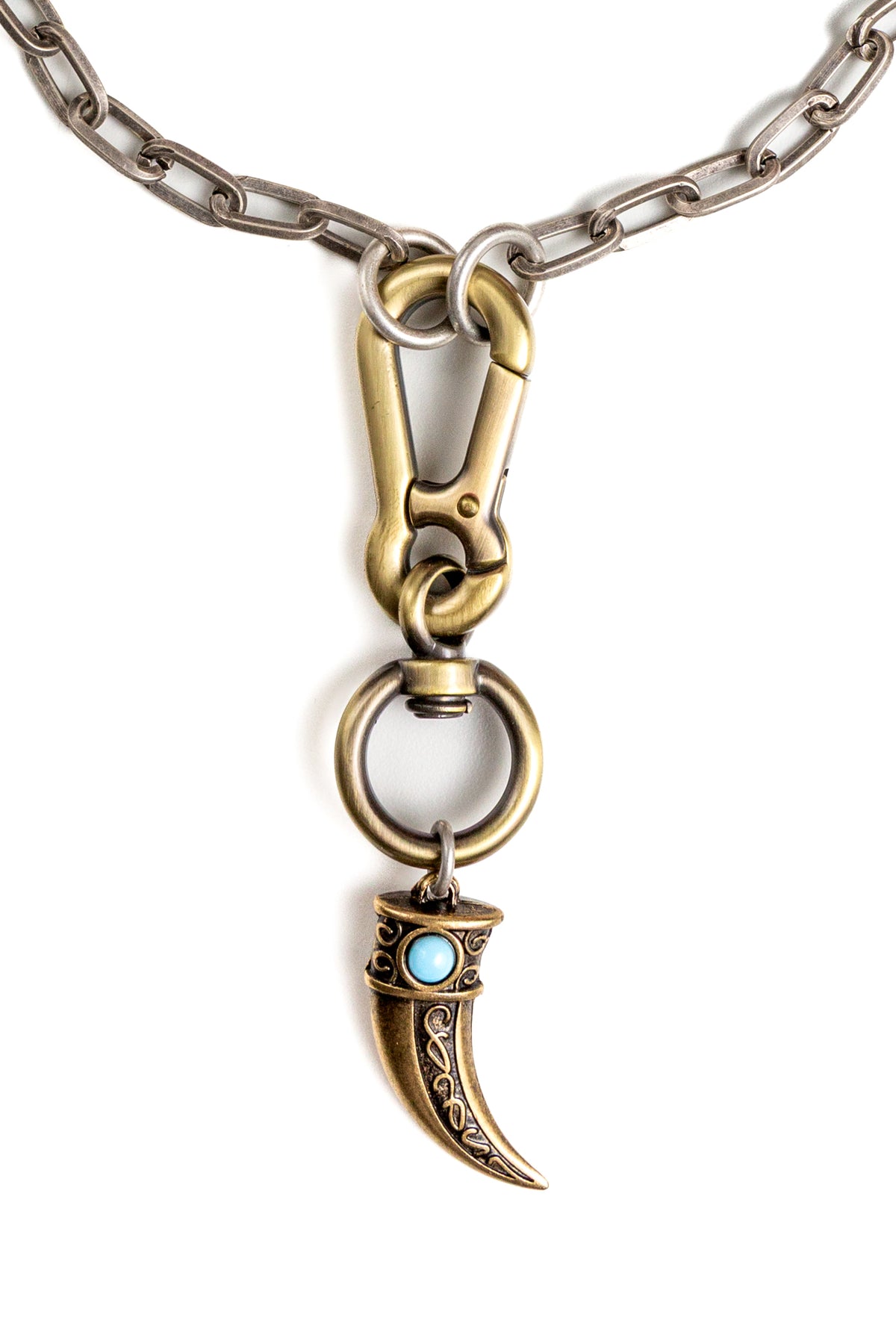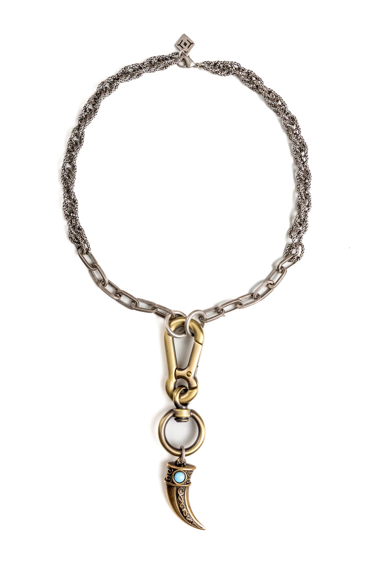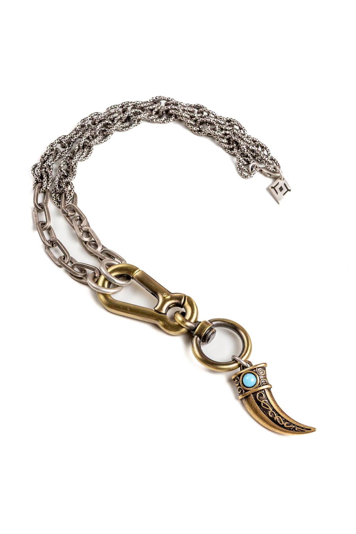 "Carisma" è una collana realizzata con componenti in lega seminaturale (zinco, alluminio) e ottone. Il rivestimento è in argento brunito anallergico e ottone antico lucido. La collana Carisma ha al centro un moschettone sotto al quale è appeso un ciondolo: un corno che ha una pietra su entrambi i lati, da una parte in cristallo bianco e dall'altra in cristallo turchese. La collana Carisma la puoi indossare da sola o assieme ad altri gioielli Cryady. Per uomo e per donna. Ogni creazione Cryady è realizzata artigianalmente con dedizione e passione.