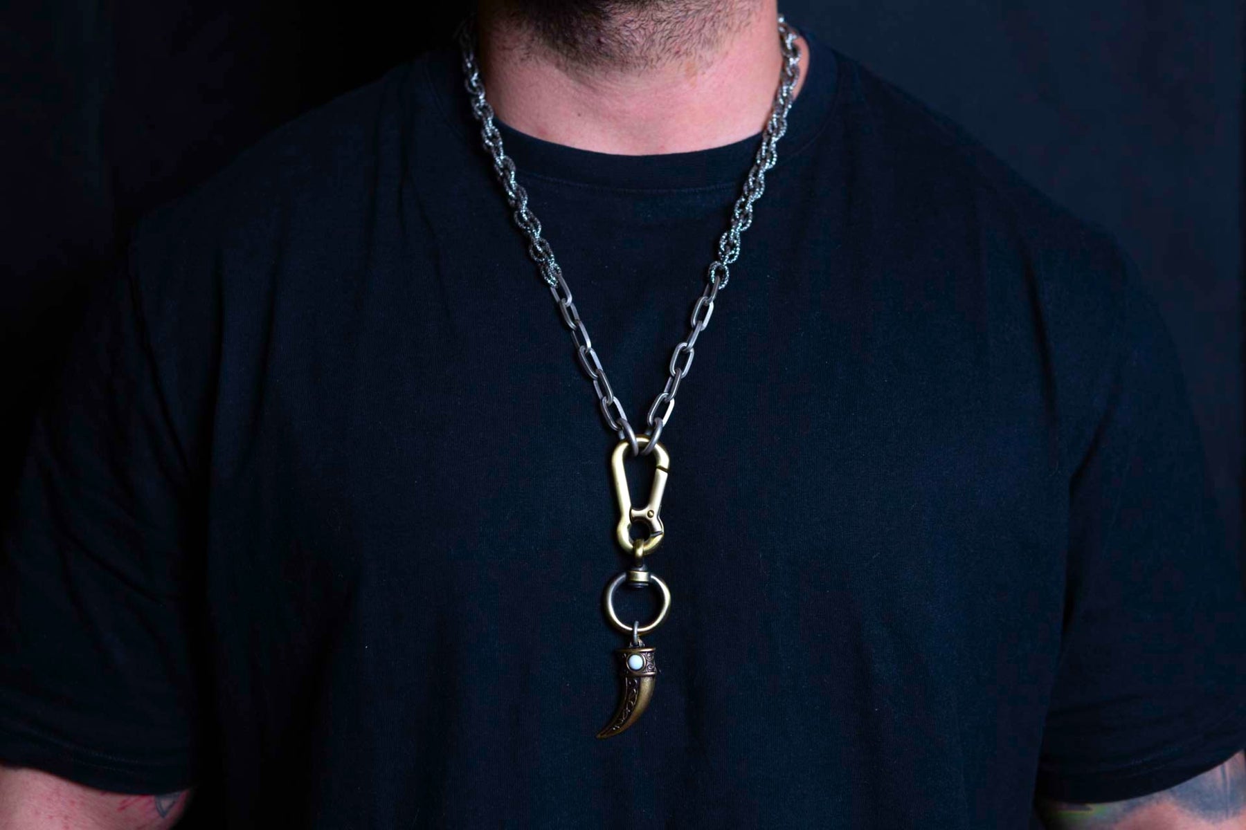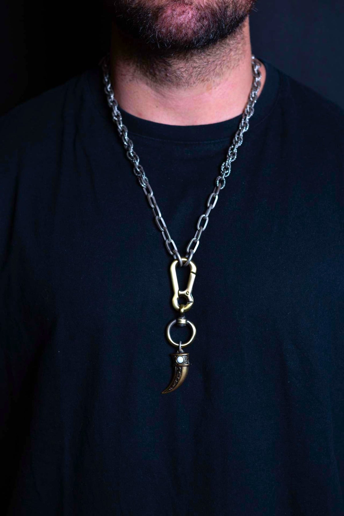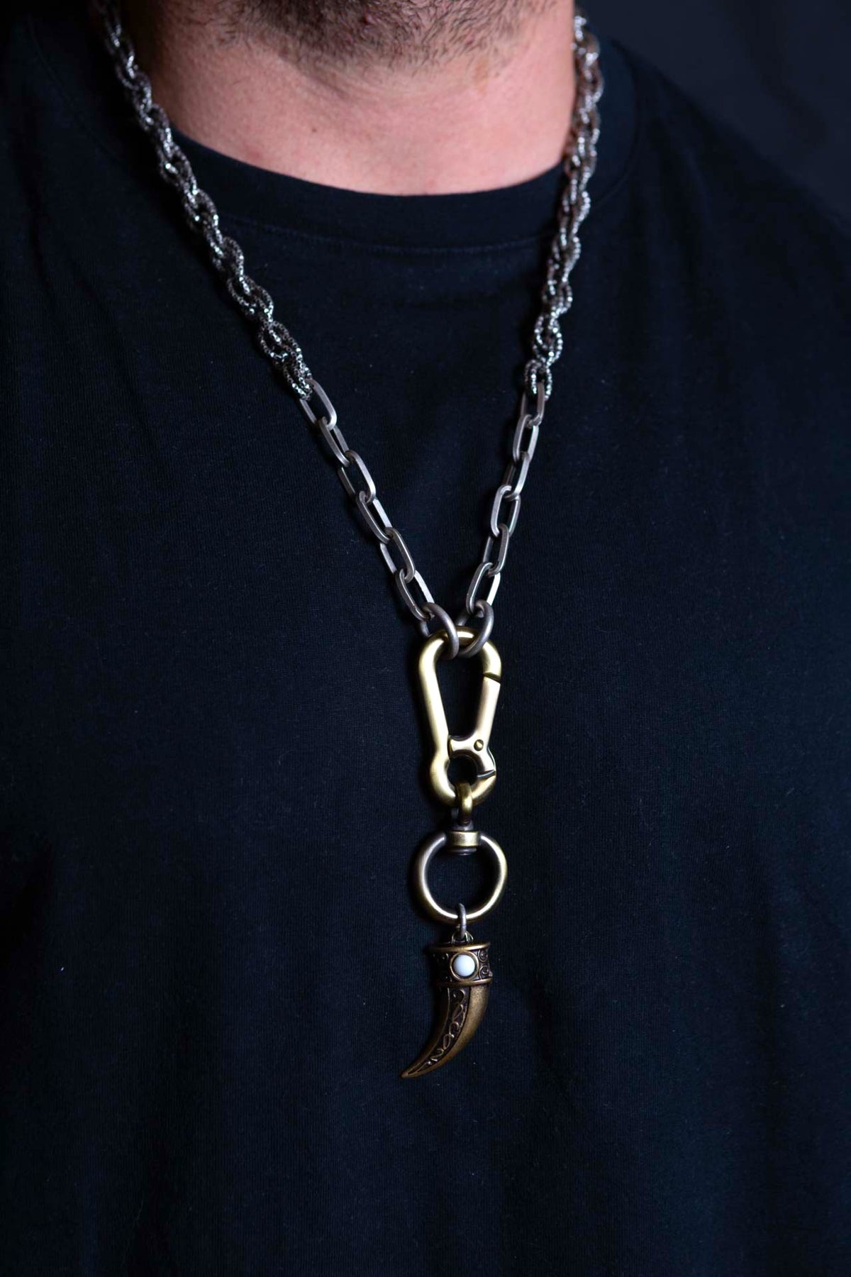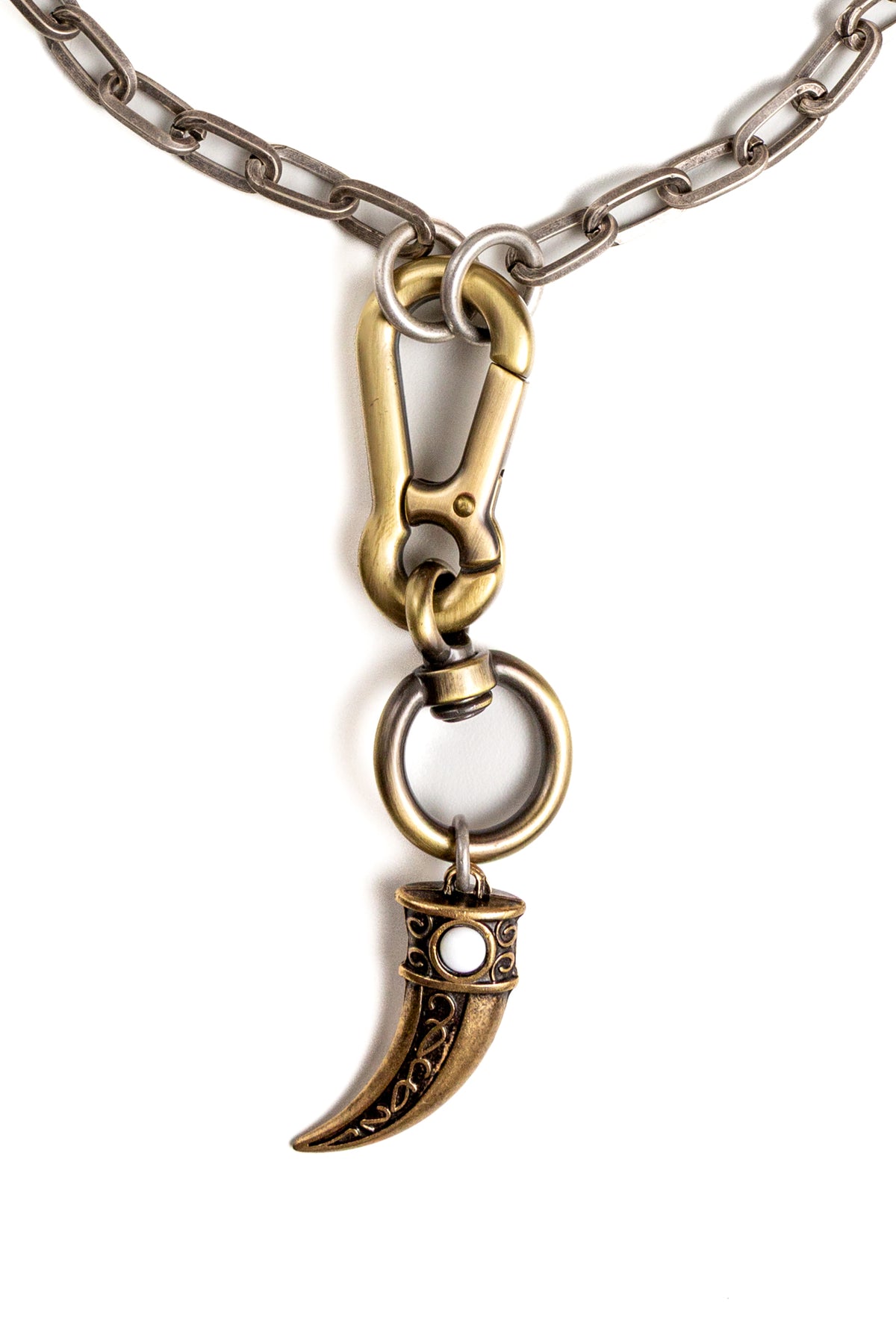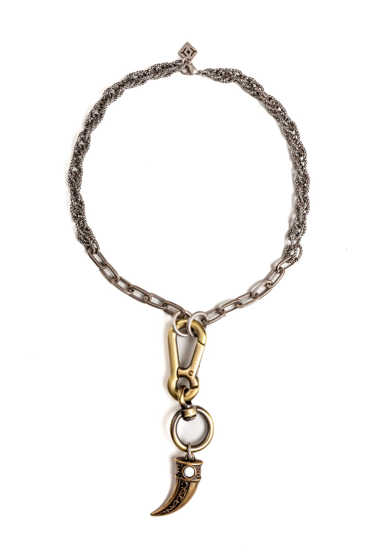 "Carisma" è una collana realizzata con componenti in lega seminaturale (zinco, alluminio) e ottone. Il rivestimento è in argento brunito anallergico e ottone antico lucido. La collana Carisma ha al centro un moschettone sotto al quale è appeso un ciondolo: un corno che ha una pietra su entrambi i lati, da una parte in cristallo bianco e dall'altra in cristallo turchese. La collana Carisma la puoi indossare da sola o assieme ad altri gioielli Cryady. Per uomo e per donna. Ogni creazione Cryady è realizzata artigianalmente con dedizione e passione.