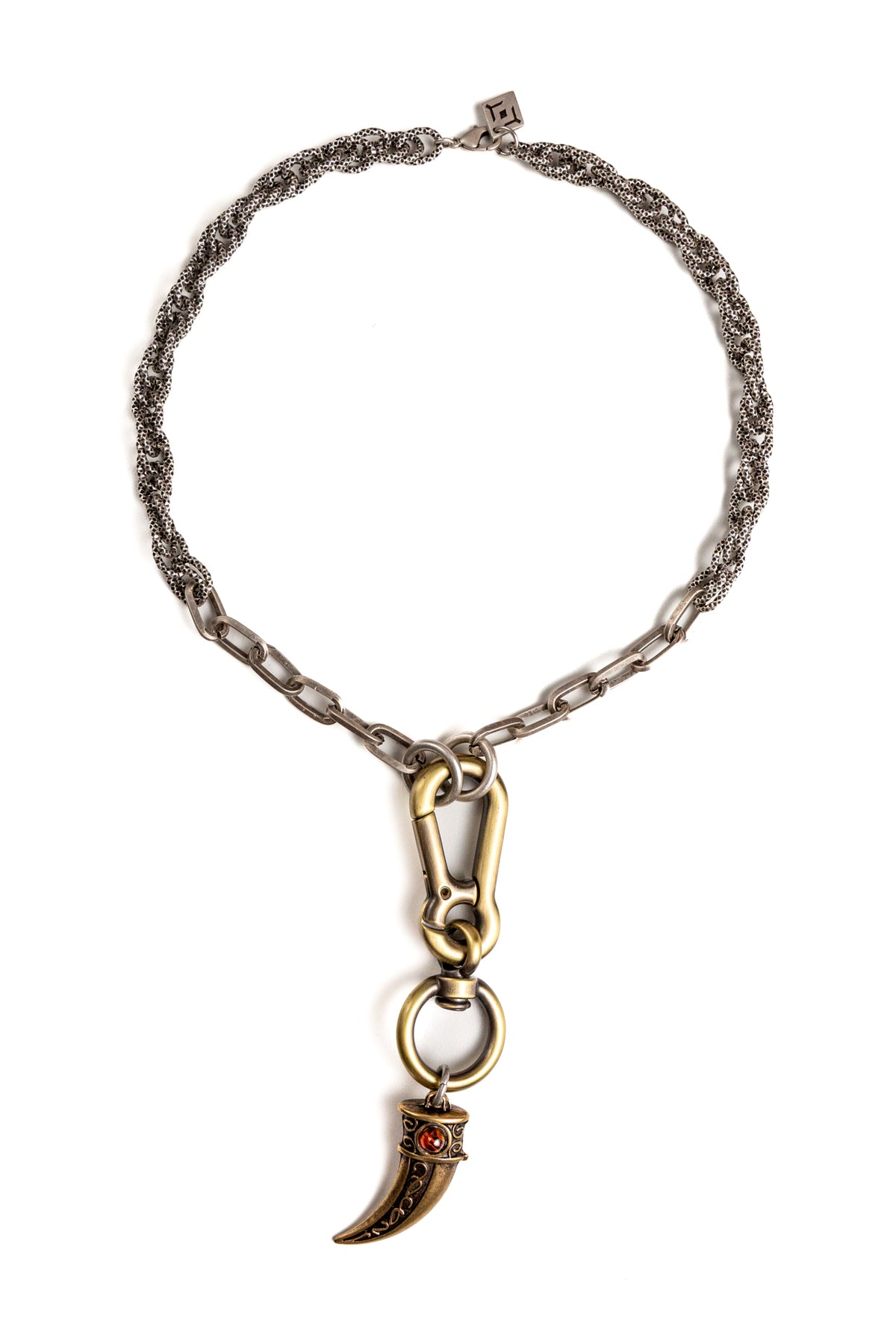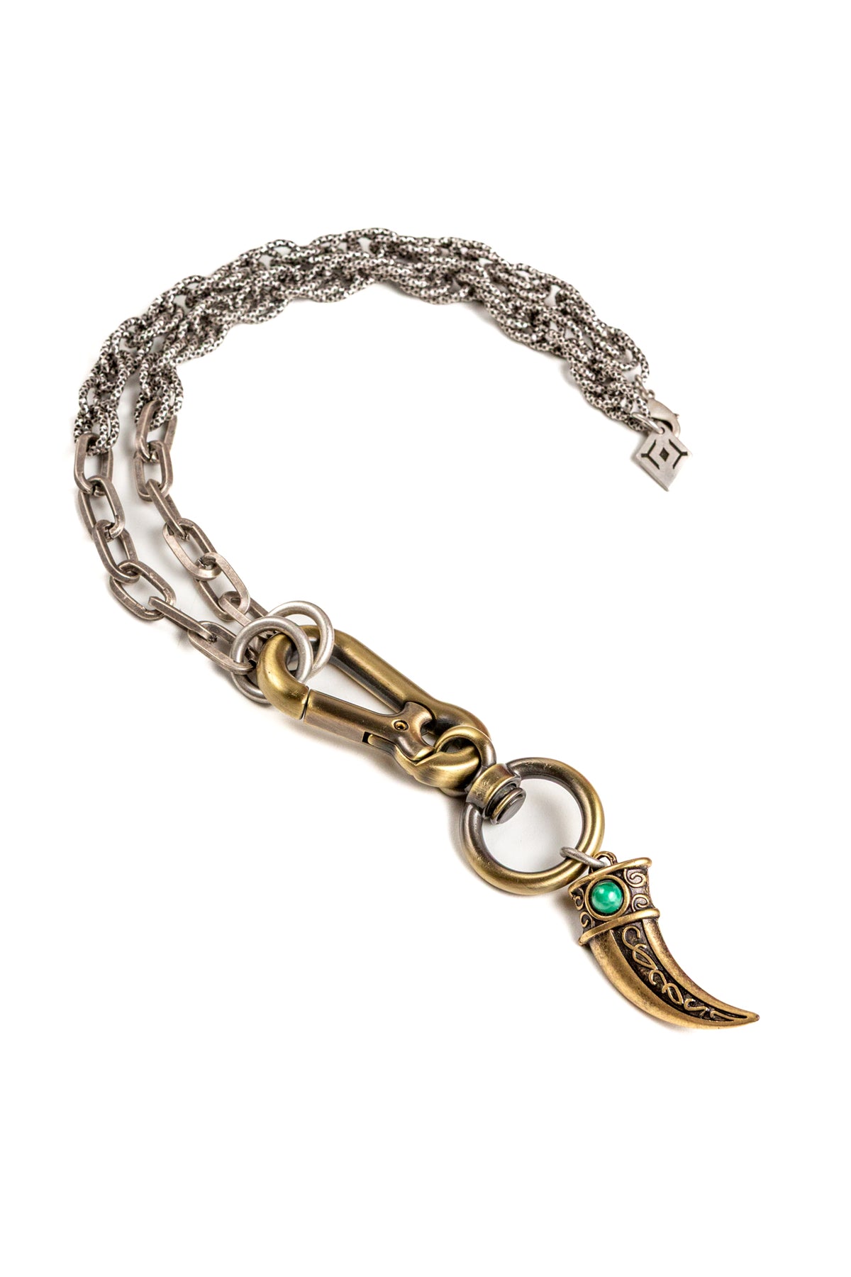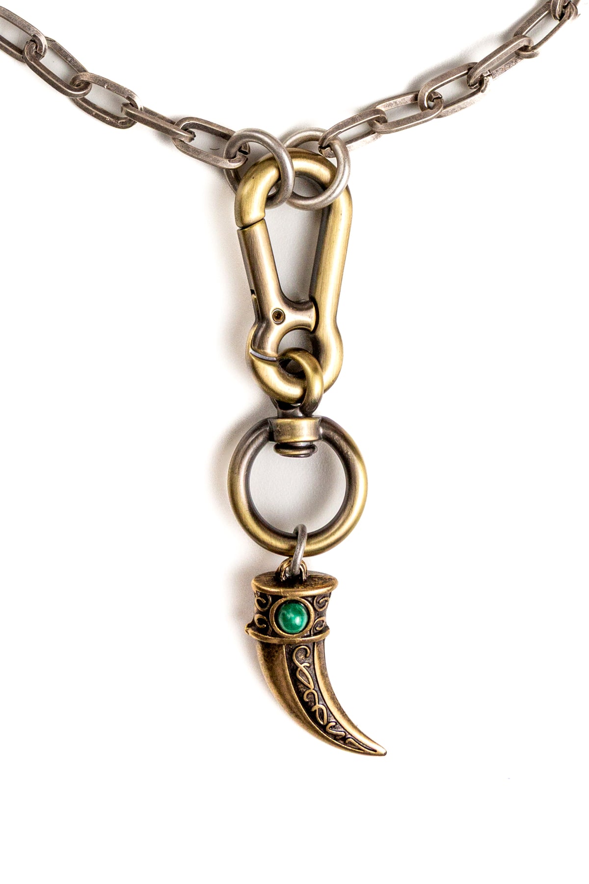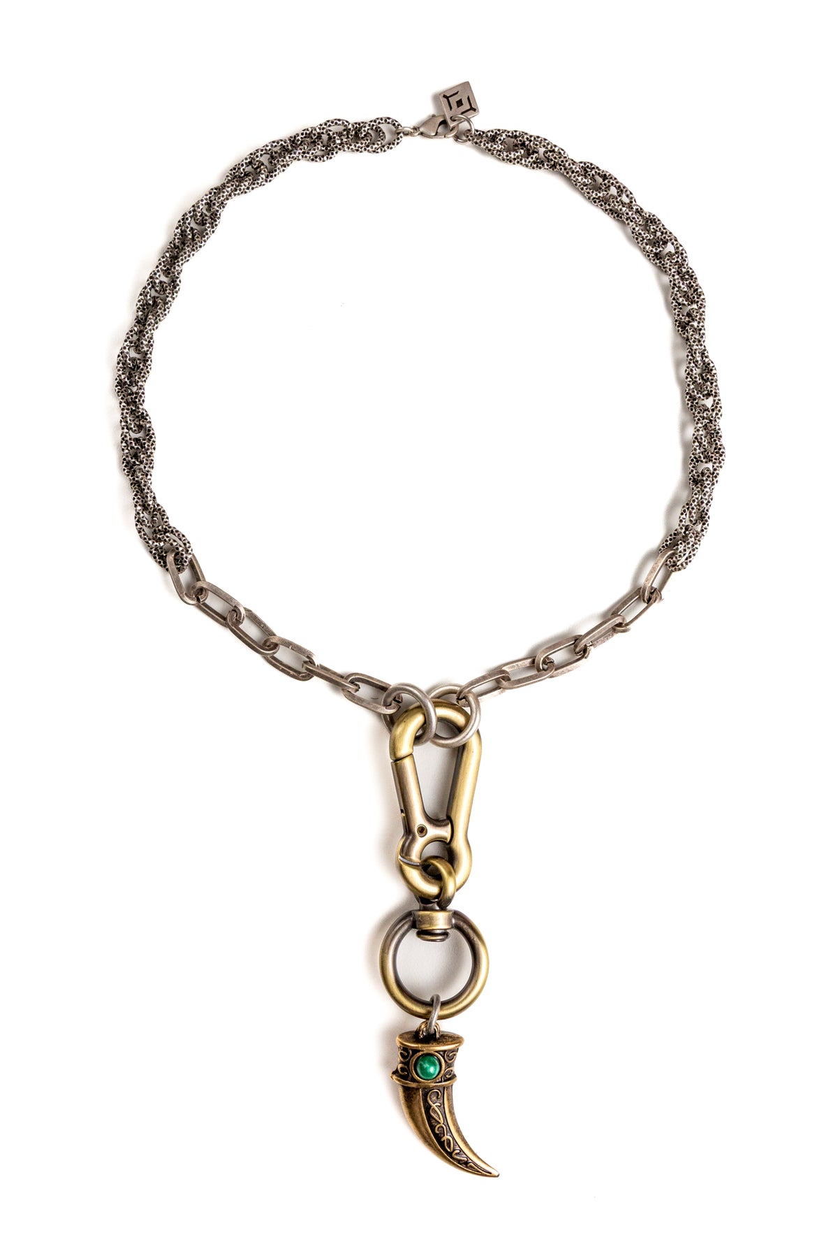 "Intrigo" è una collana realizzata con componenti in lega seminaturale (zinco, alluminio) e ottone. Il rivestimento è in argento brunito anallergico e ottone antico lucido. La collana Intrigo ha al centro un moschettone sotto al quale è appeso un ciondolo: un corno che ha pietre naturali su entrambi i lati, da una parte ambra e dall'altra malachite. La collana Intrigo la puoi indossare da sola o assieme ad altri gioielli Cryady. Per uomo e per donna. Ogni creazione Cryady è realizzata artigianalmente con dedizione e passione.
