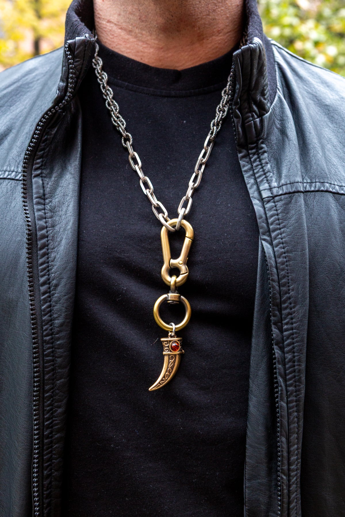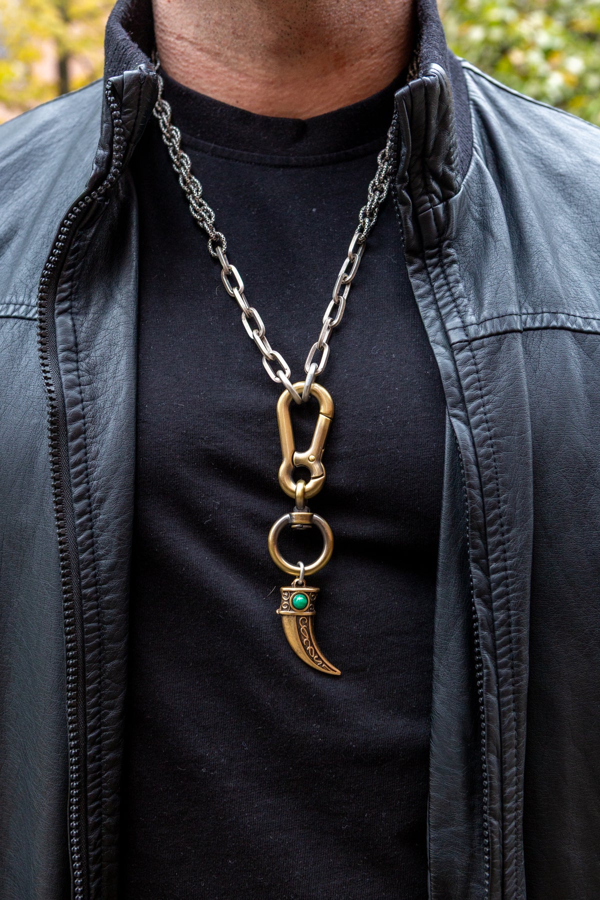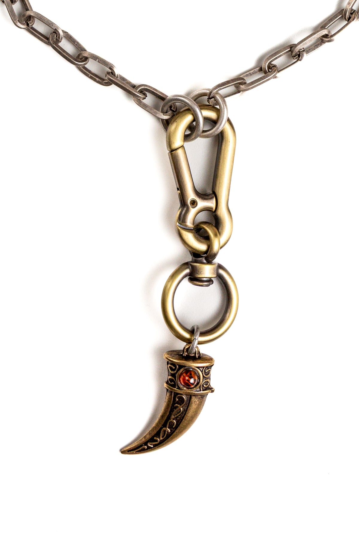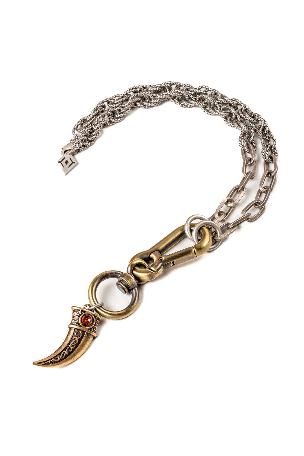 "Intrigo" è una collana realizzata con componenti in lega seminaturale (zinco, alluminio) e ottone. Il rivestimento è in argento brunito anallergico e ottone antico lucido. La collana Intrigo ha al centro un moschettone sotto al quale è appeso un ciondolo: un corno che ha pietre naturali su entrambi i lati, da una parte ambra e dall'altra malachite. La collana Intrigo la puoi indossare da sola o assieme ad altri gioielli Cryady. Per uomo e per donna. Ogni creazione Cryady è realizzata artigianalmente con dedizione e passione.