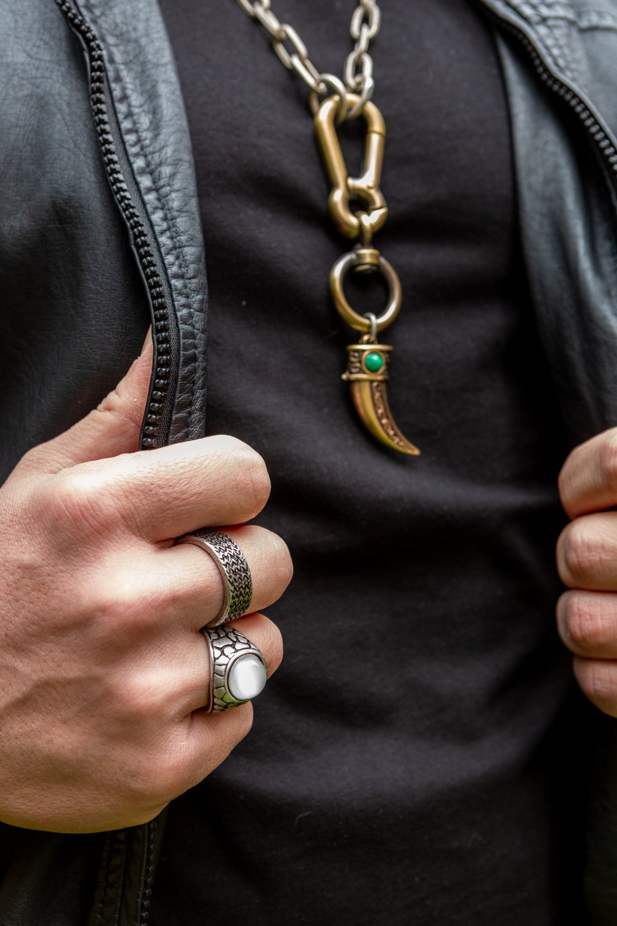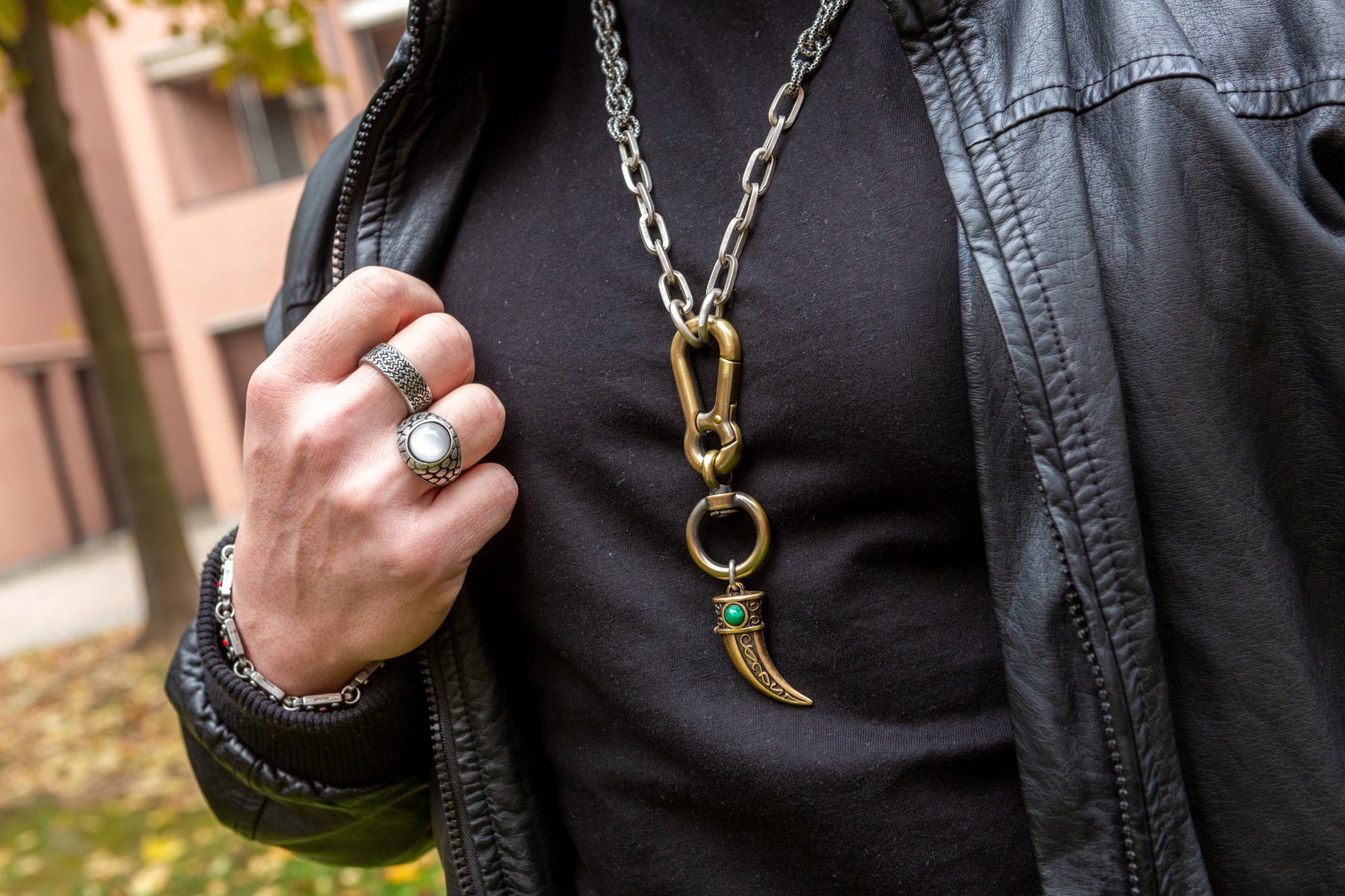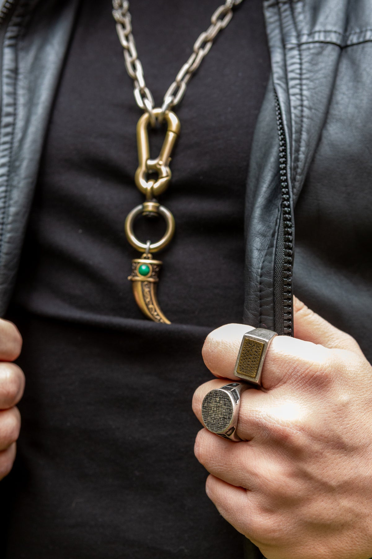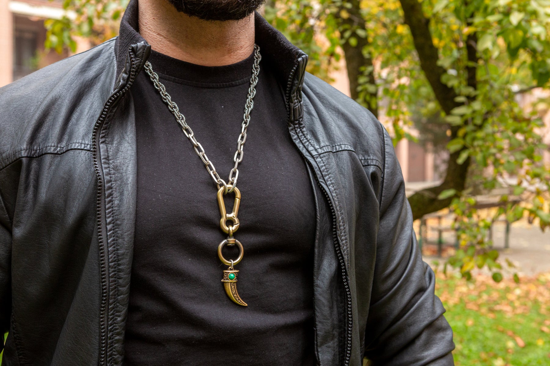 "Intrigo" è una collana realizzata con componenti in lega seminaturale (zinco, alluminio) e ottone. Il rivestimento è in argento brunito anallergico e ottone antico lucido. La collana Intrigo ha al centro un moschettone sotto al quale è appeso un ciondolo: un corno che ha pietre naturali su entrambi i lati, da una parte ambra e dall'altra malachite. La collana Intrigo la puoi indossare da sola o assieme ad altri gioielli Cryady. Per uomo e per donna. Ogni creazione Cryady è realizzata artigianalmente con dedizione e passione.