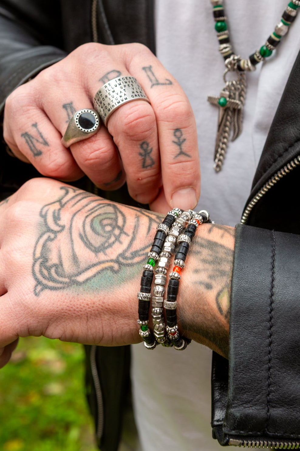 Anello liscio bagnato in argento invecchiato anallergico e trattamento anti-macchia e parte centrale con piastrino circolare e smalto nero.