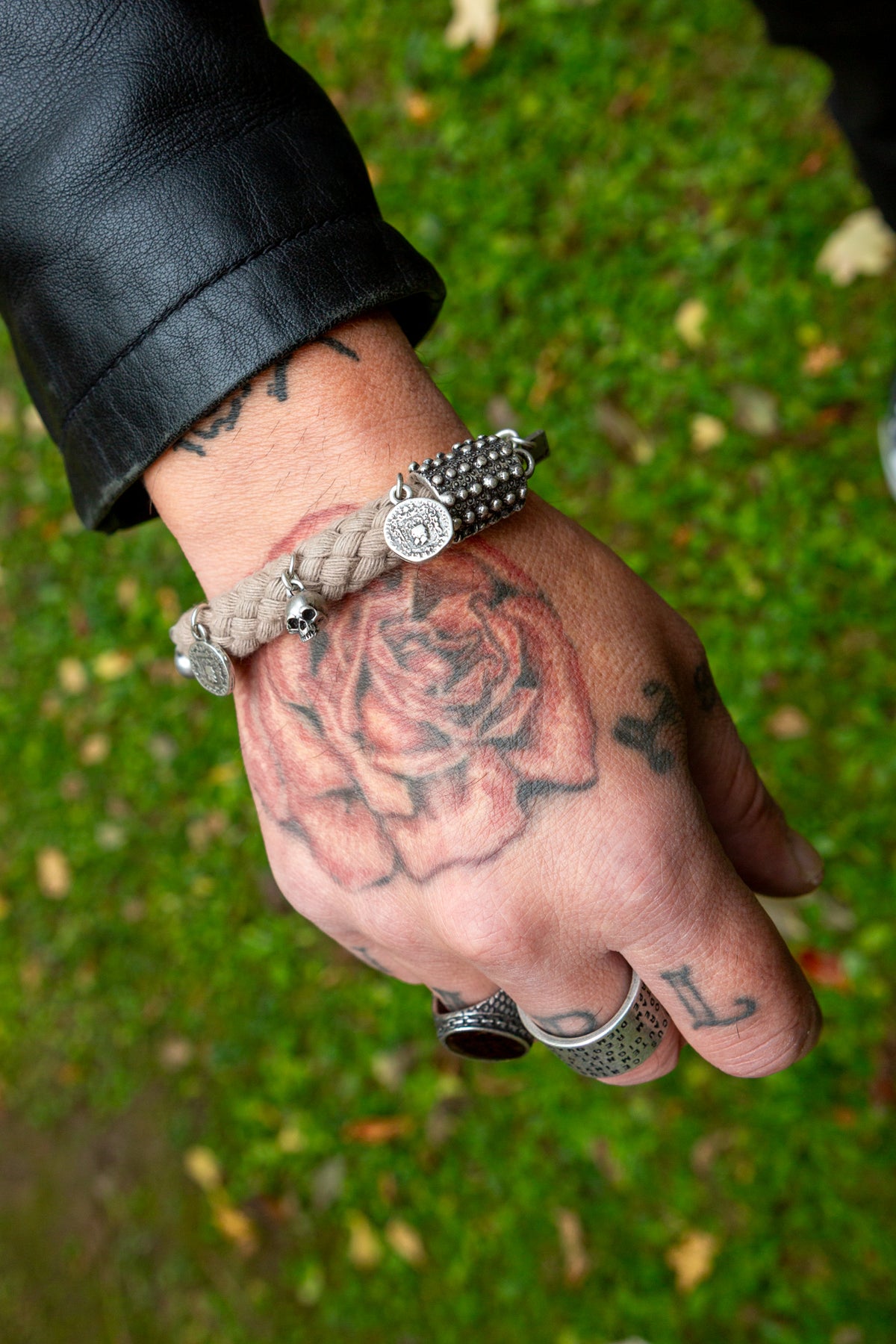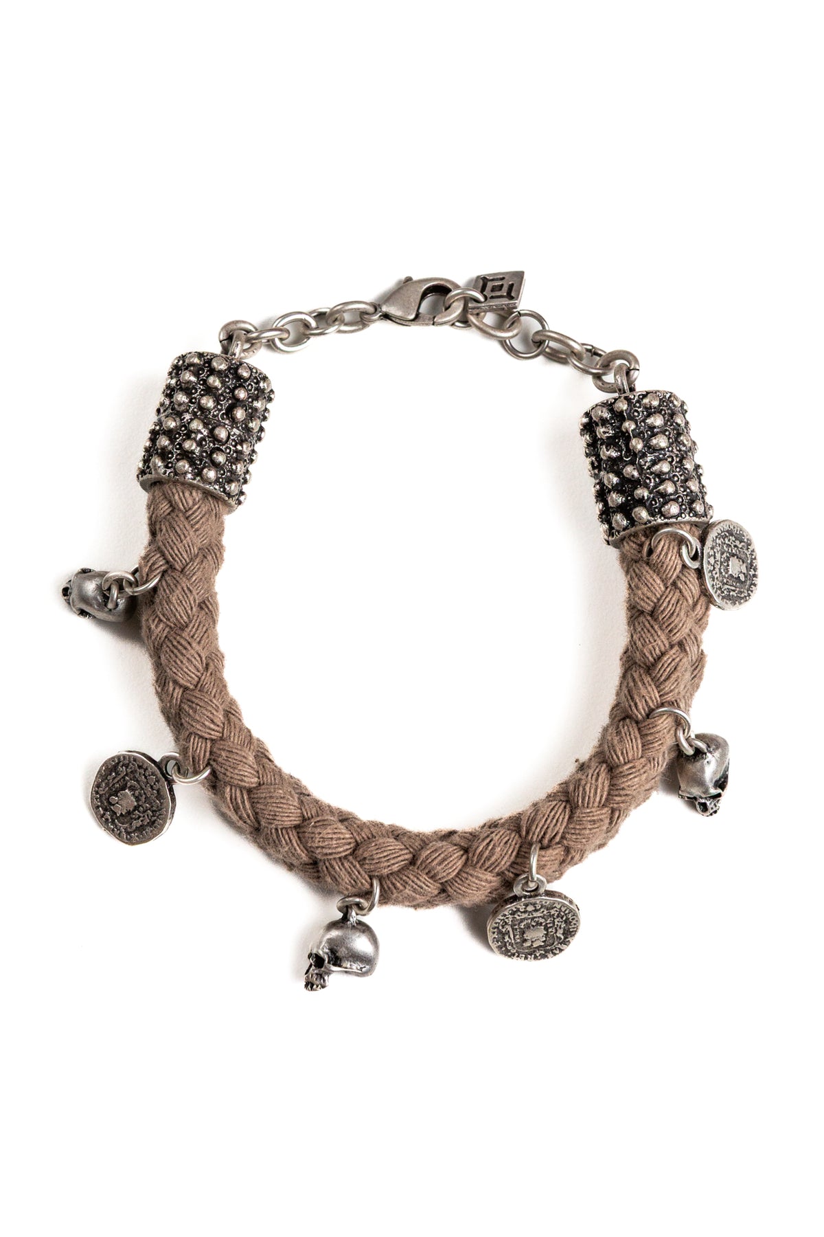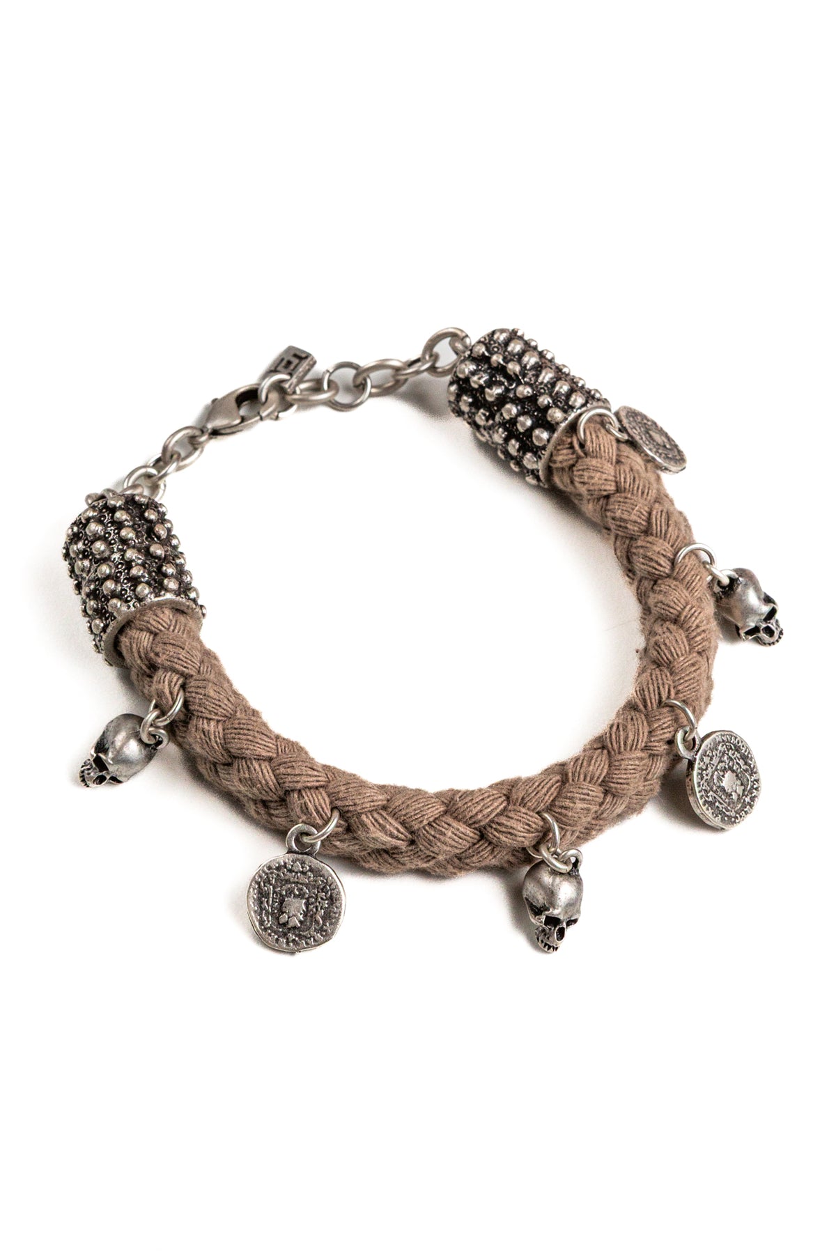 Il bracciale “Kronos” deve la sua unicità al connubio tra cordone intrecciato ed ai ciondoli presenti su tutto il perimetro: sono piccoli teschi tridimensionali e monete della stessa dimensione.