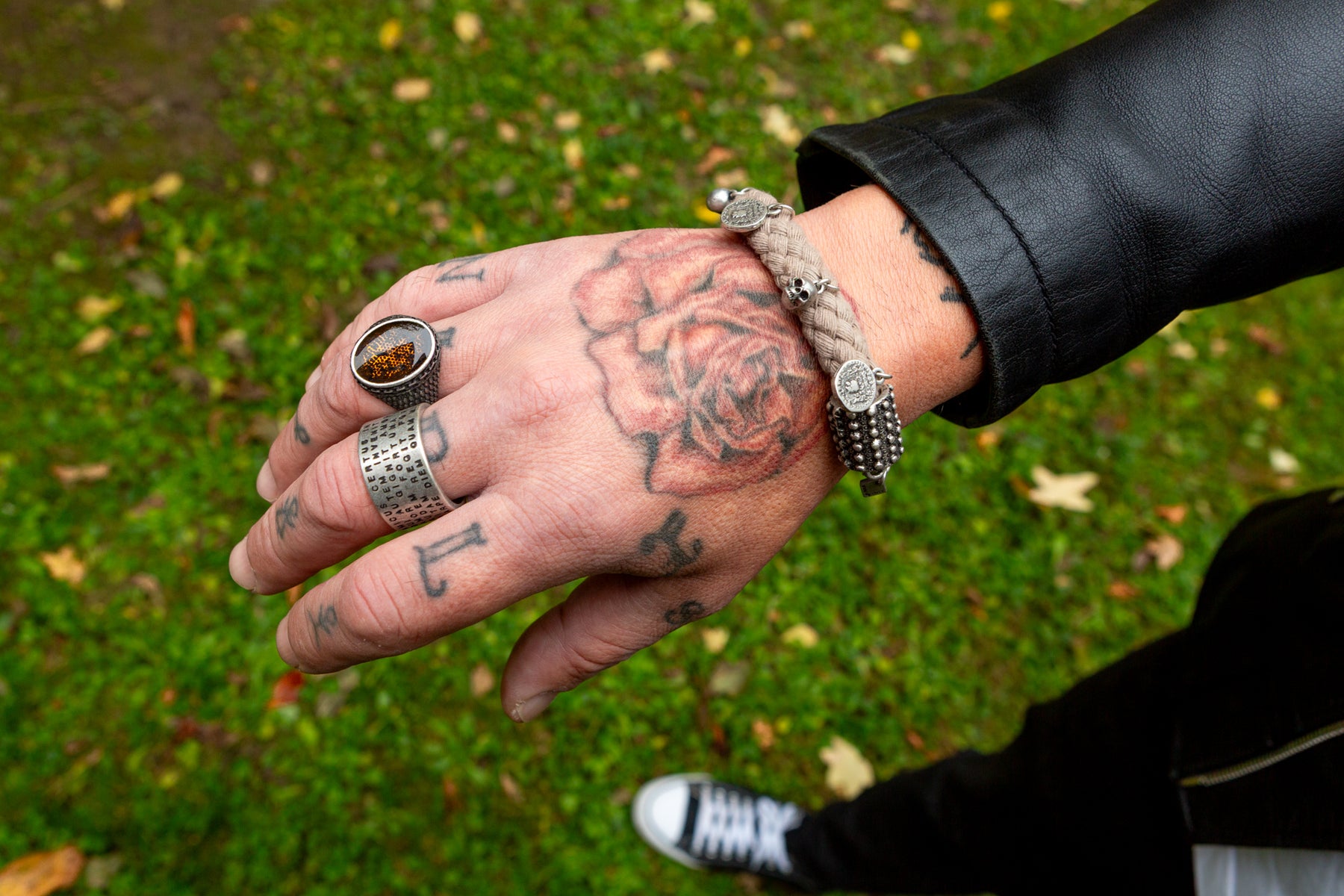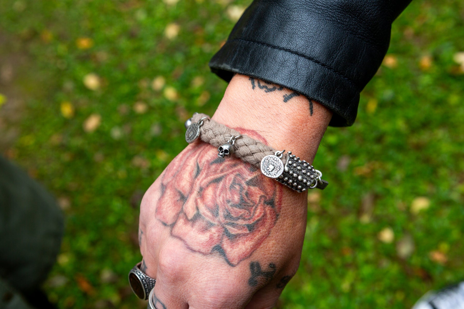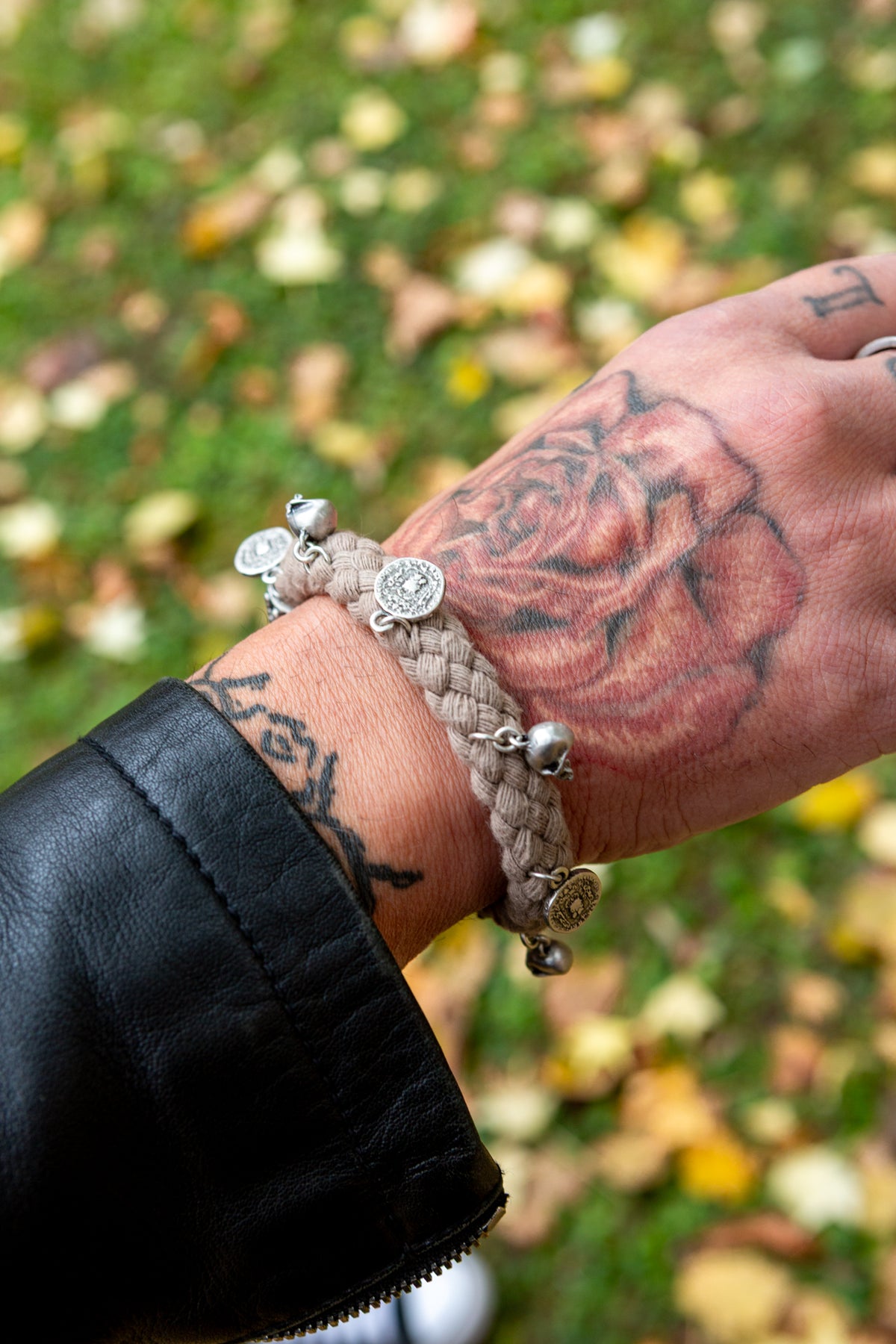 Il bracciale “Kronos” deve la sua unicità al connubio tra cordone intrecciato ed ai ciondoli presenti su tutto il perimetro: sono piccoli teschi tridimensionali e monete della stessa dimensione.