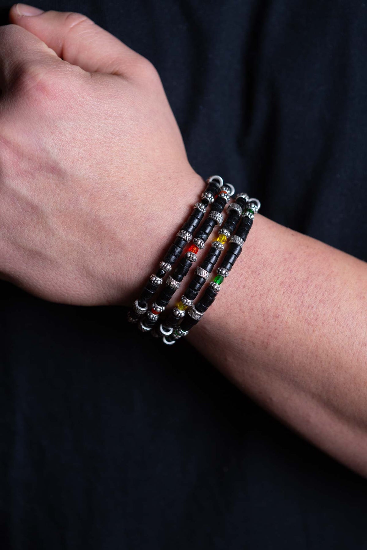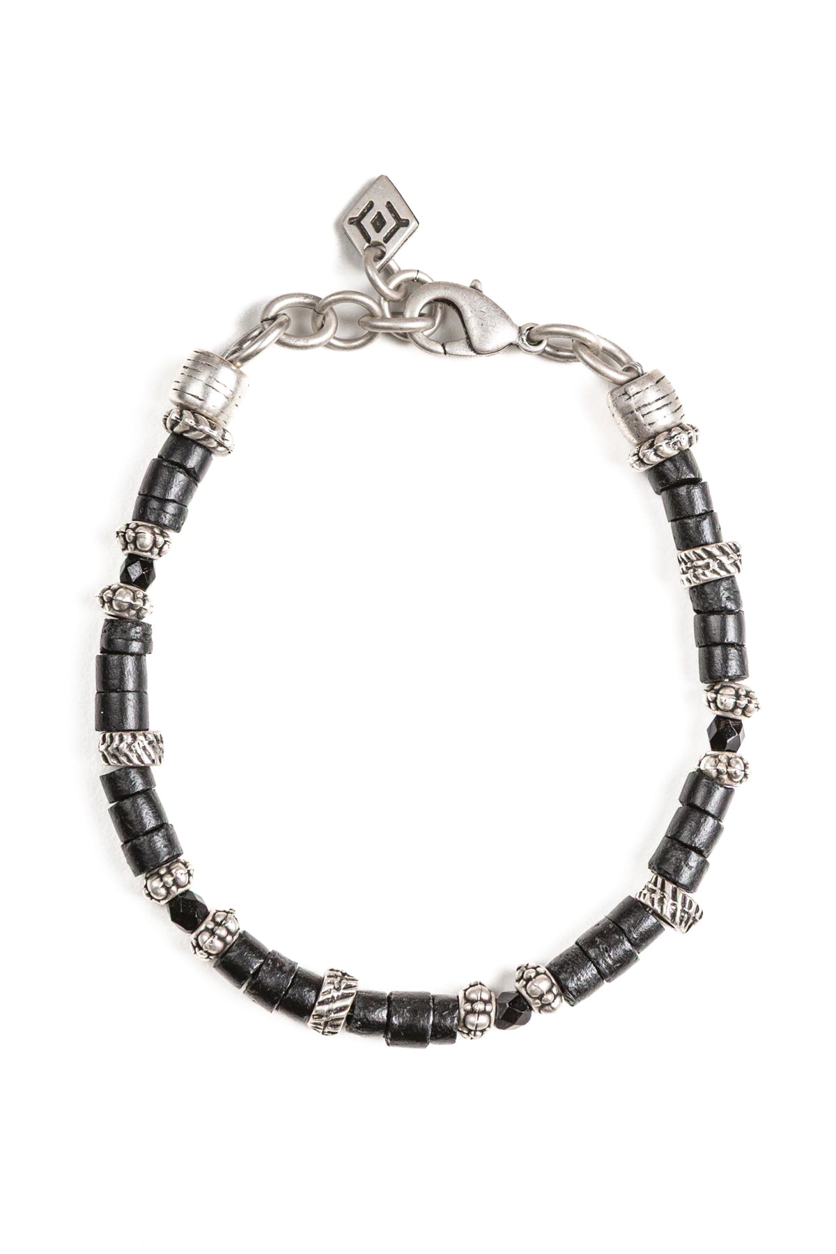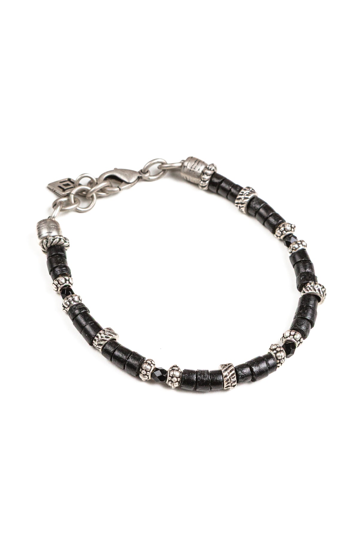 Il bracciale Enrique deve la sua unicità al connubio fra le rondelle in legno nero, abbinate a piccole sfere sfaccettate in cristallo nero e alle componenti in lega di zinco e alluminio galvanizzate in argento antico anallergico. Questo gioiello può essere abbinato a tutti i look: da quello classico per renderlo unico ad uno stile casual o rock.