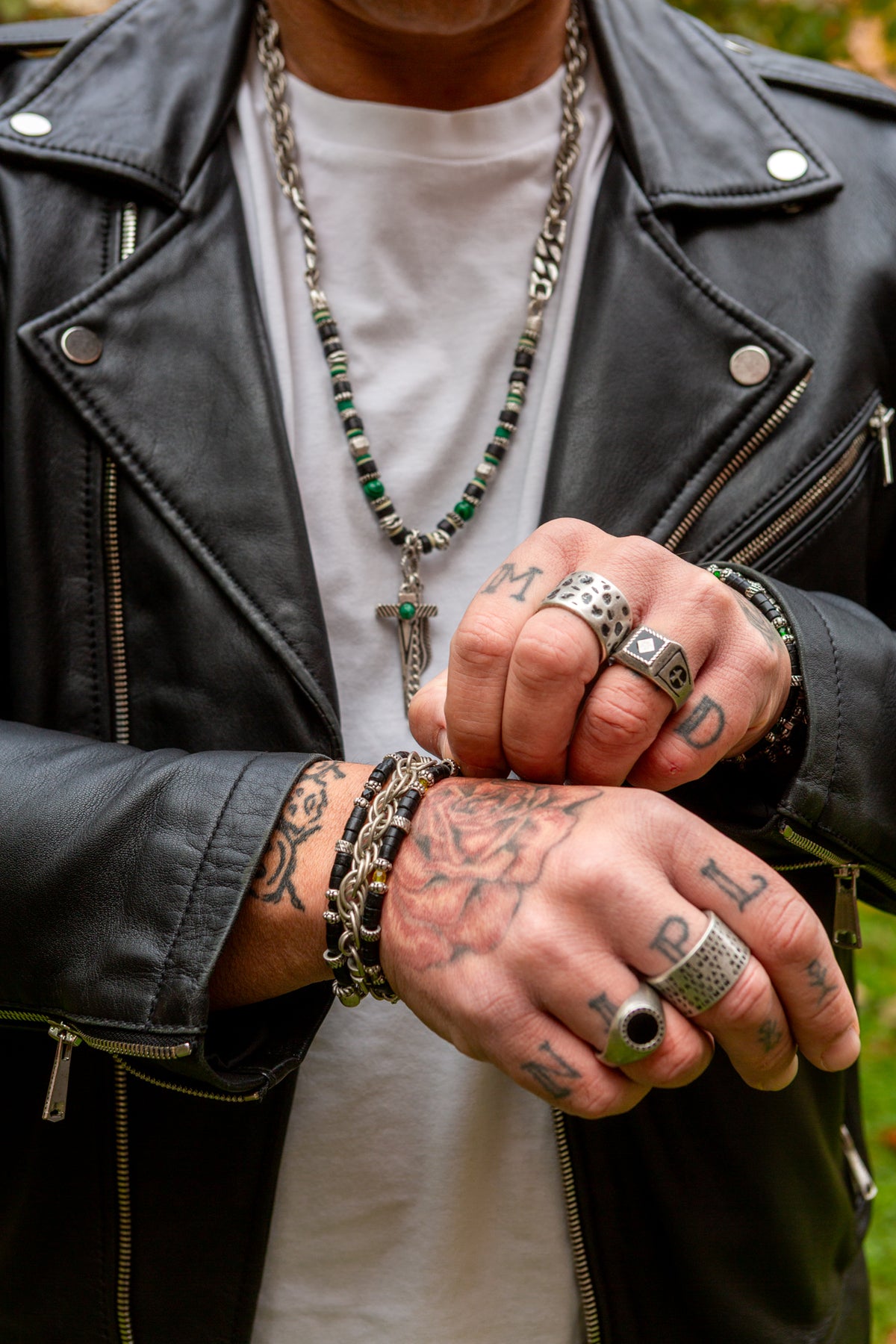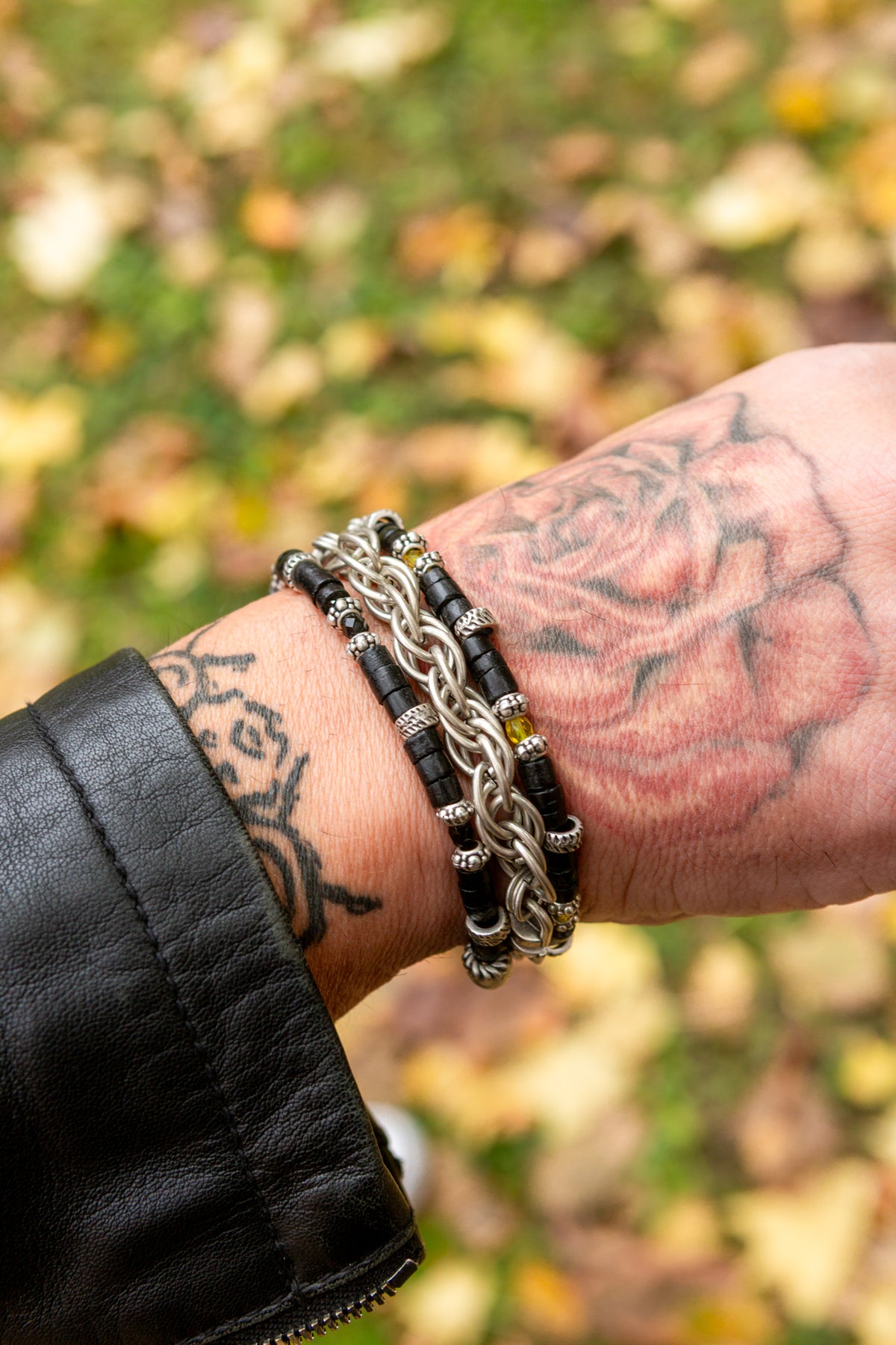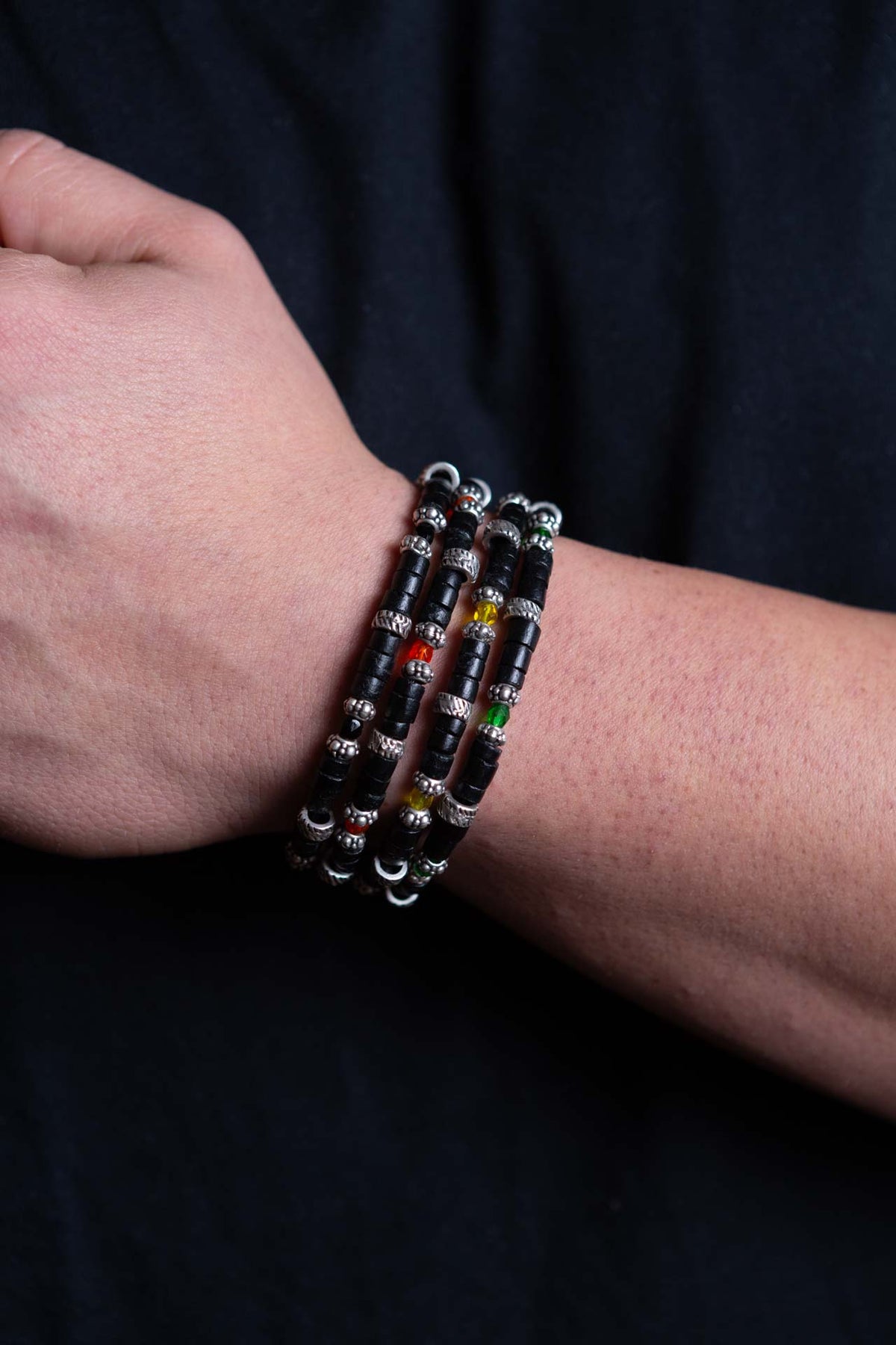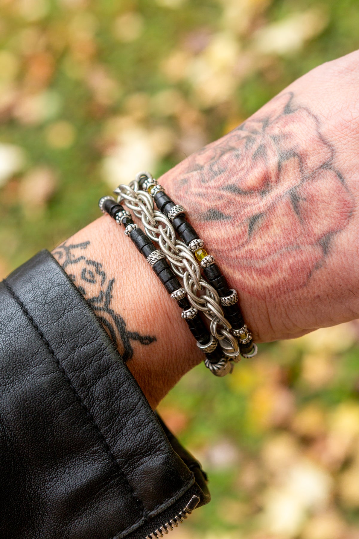 Il bracciale Enrique deve la sua unicità al connubio fra le rondelle in legno nero, abbinate a piccole sfere sfaccettate in cristallo nero e alle componenti in lega di zinco e alluminio galvanizzate in argento antico anallergico. Questo gioiello può essere abbinato a tutti i look: da quello classico per renderlo unico ad uno stile casual o rock.