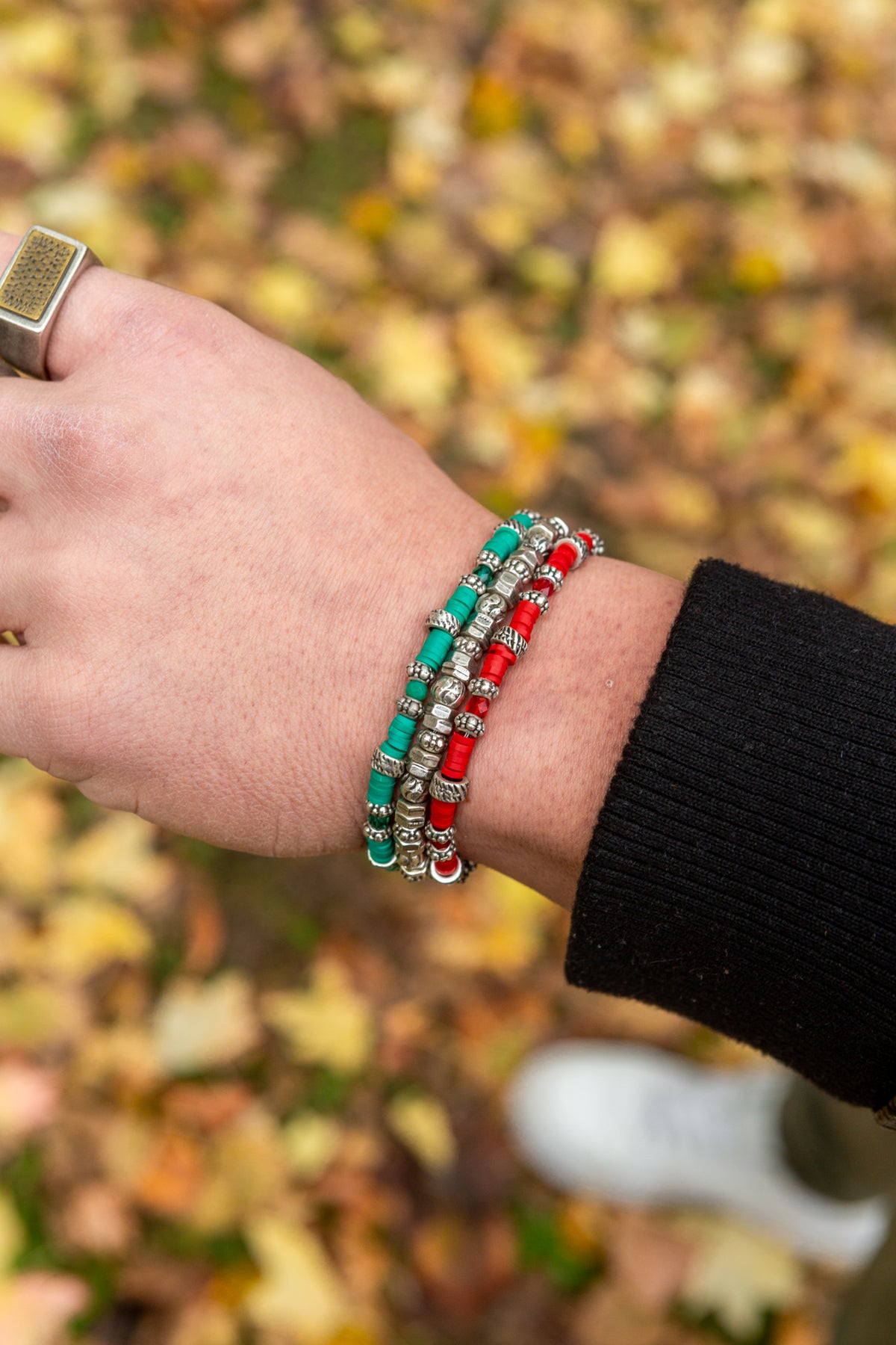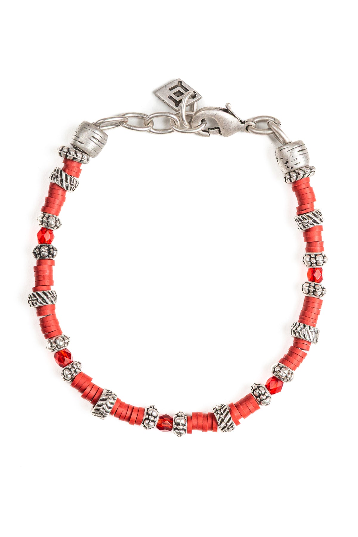 Il colore rosso è l'assoluto protagonista del bracciale Hio Rosso, infatti rondelle in fimo bianco e sfere in cristallo rosso sfaccettate sono alternate alle componenti in lega di zinco e alluminio galvanizzate in argento antico anallergico. Questo gioiello può essere abbinato a tutti i look: da quello classico per renderlo unico ad uno stile casual o rock.