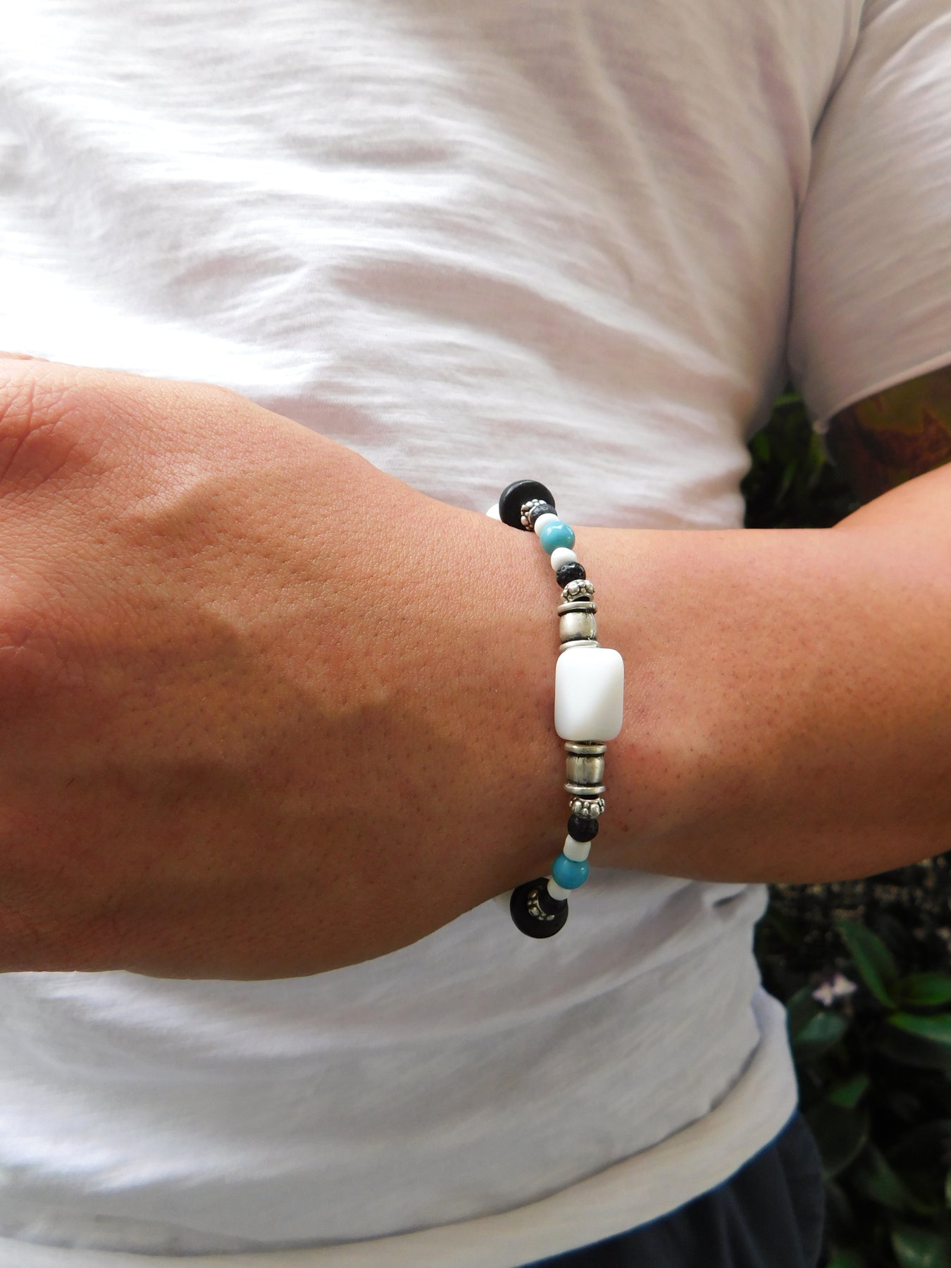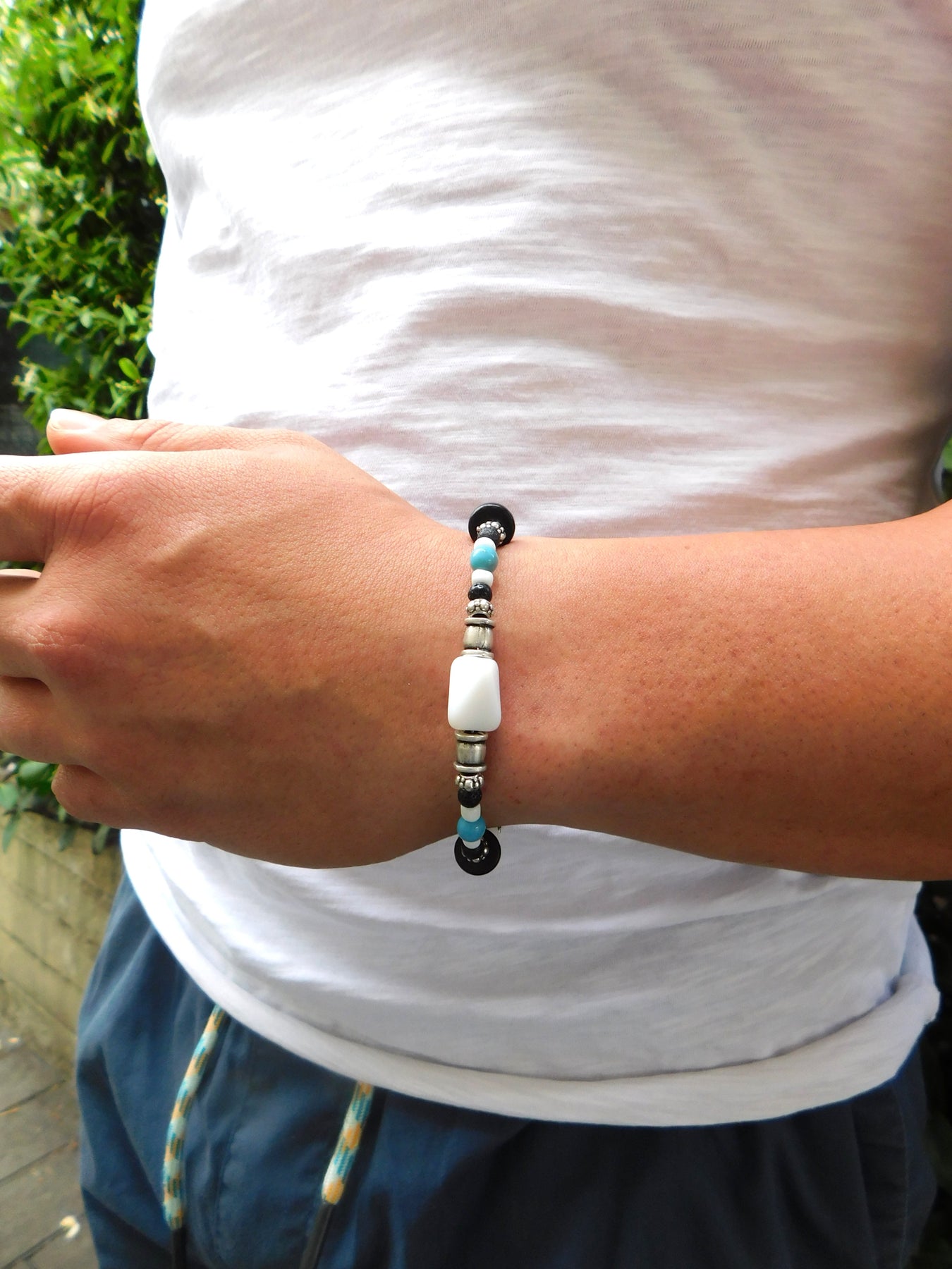 Il bracciale Salinas è realizzato con cristalli turchesi, cristalli bianchi, sfere in pietra lavica nera, legno nero, alternati a componenti in lega di zinco e alluminio rivestito in argento antico anallergico. Il bracciale Salinas è unisex come tutte le altre nostre creazioni, da indossare da solo o insieme ad altri gioielli Cryady. Ogni creazione Cryady è realizzata artigianalmente con amore e passione. I materiali utilizzati sono certificati in rispetto delle normative vigenti CEE.