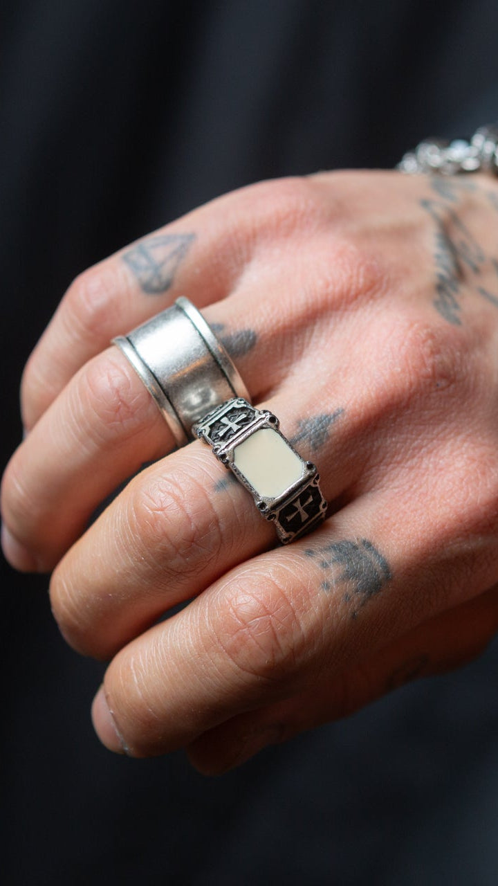 Der White Throne-Ring ist ein Schmuckstück, das von der mittelalterlichen Fernsehserie Games of Thrones inspiriert wurde. Die vier seitlichen Kreuze sind die typischen Kreuze, die diese historische Periode, das Mittelalter, charakterisieren. Um diesen Ring noch spezieller zu machen, wollte Cryady ihn mit zentraler weißer Emaille auf einer halbrechteckigen Basis veredeln. Echtes Made in Italy wird in diesem Ring hervorragend repräsentiert, bei dem unsere Handwerker auf jedes einzelne Detail geachtet haben.