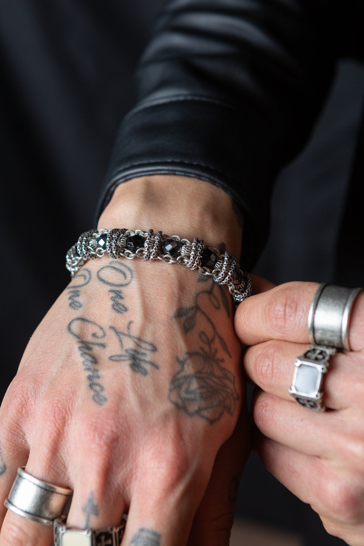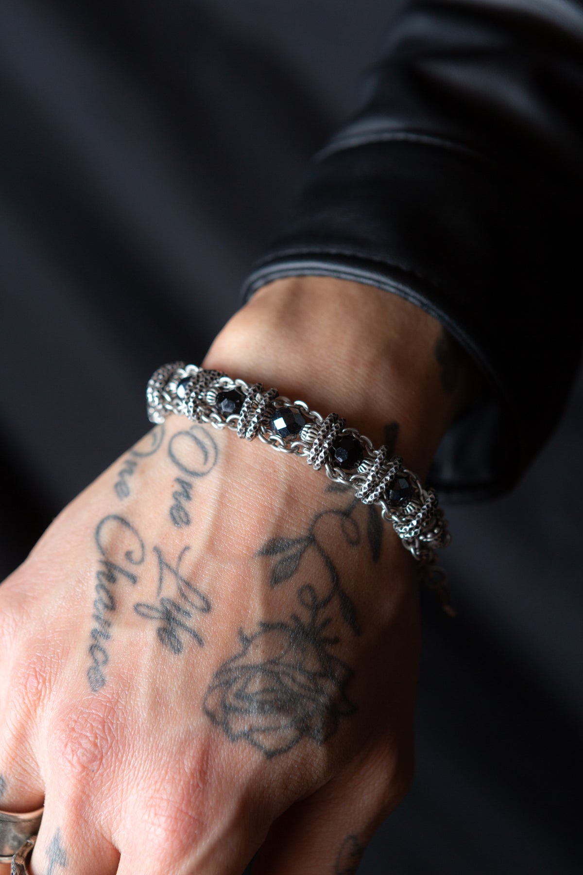 A rendere unico questo bracciale è il connubio tra le pietre in cristallo nero e in cristallo color ematite, abbinate alle nostre componenti in lega seminaturale di zinco e alluminio, galvanizzate in argento invecchiato e catene differenti intrecciate.
