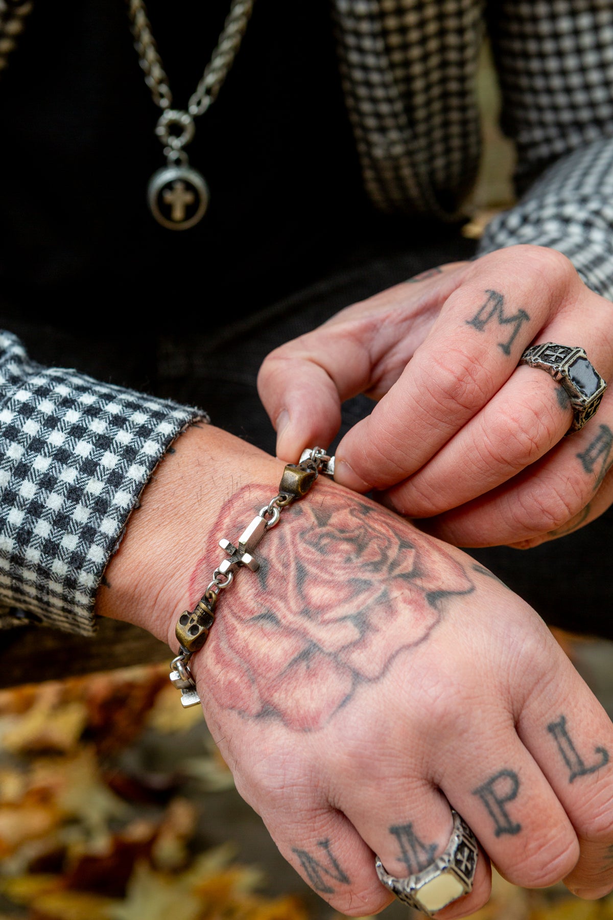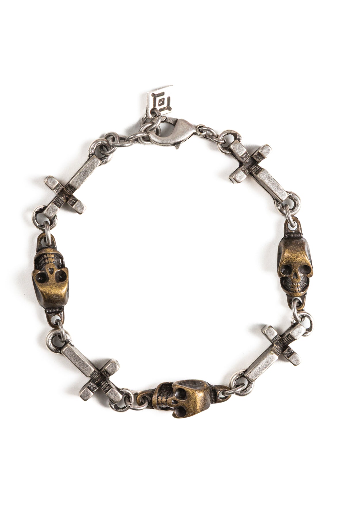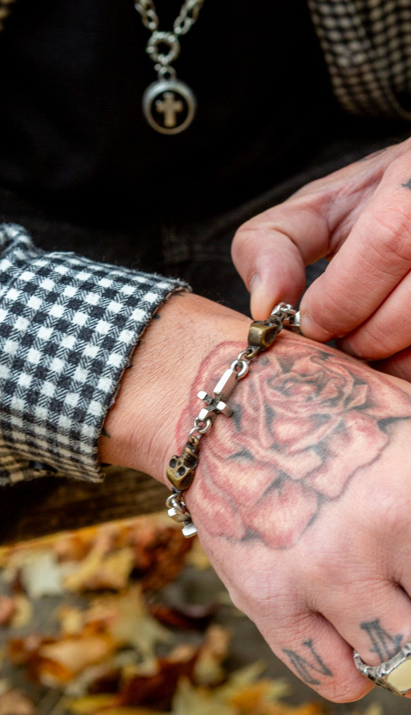 Uno dei bracciali dallo stile più rock della collezione Cryady è il bracciale Infierno in cui i teschi e croci si susseguono per poter abbracciare il polso alternandosi le une agli altri. Il teschio può rappresentare la vittoria della Morte sulla vita e la fugacità dell’esistenza tuttavia l’impatto negativo del messaggio può essere temperato dalla fede nella Vita oltre la Morte. Solitamente quando si riesce a cambiare la propria vita positivamente ci si tatua un teschio il quale rappresenta la vita passata che si è lasciata alle spalle. La croce è tra i simboli più controversi e utilizzati per esprimere il profondo legame con la propria spiritualità. La croce infatti a seconda delle diverse culture e dei diversi modi di raffigurarla presenta significati differenti. Chi decide di tatuarsi questo simbolo va oltre la voglia di avere qualcosa di stiloso sul proprio corpo ma desidera avere un richiamo al desiderio di contatto con il divino e l’universo che risiede in ognuno di noi.