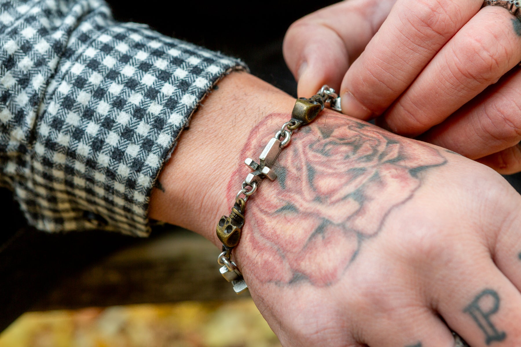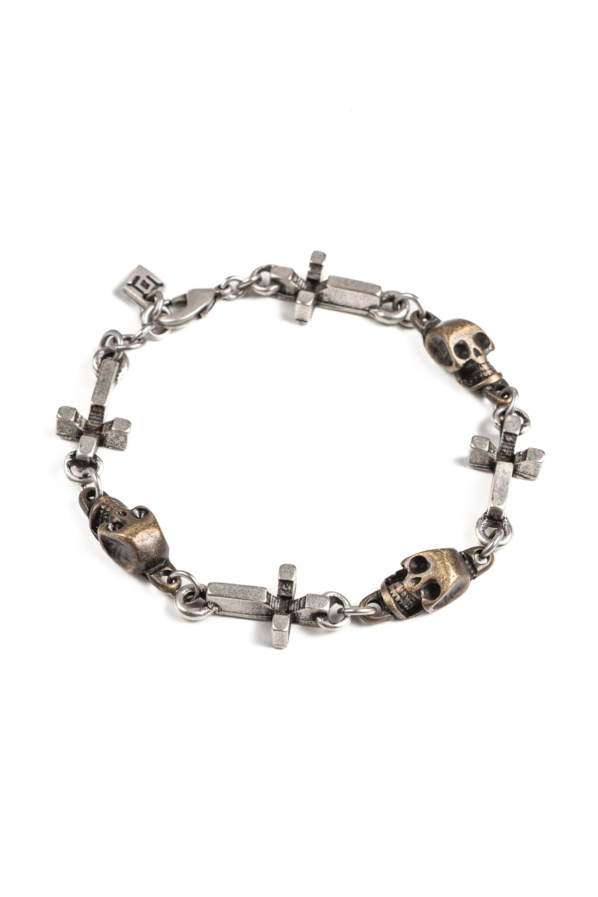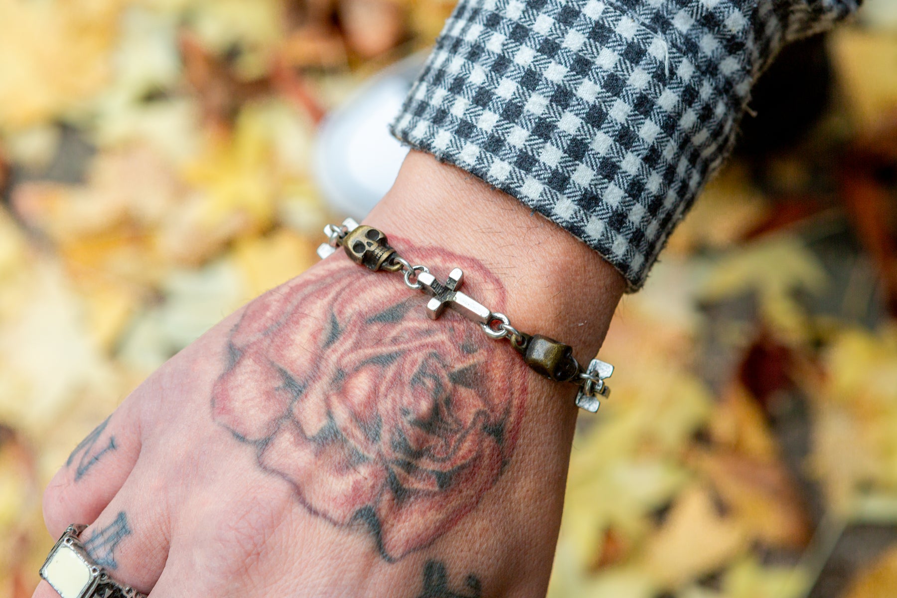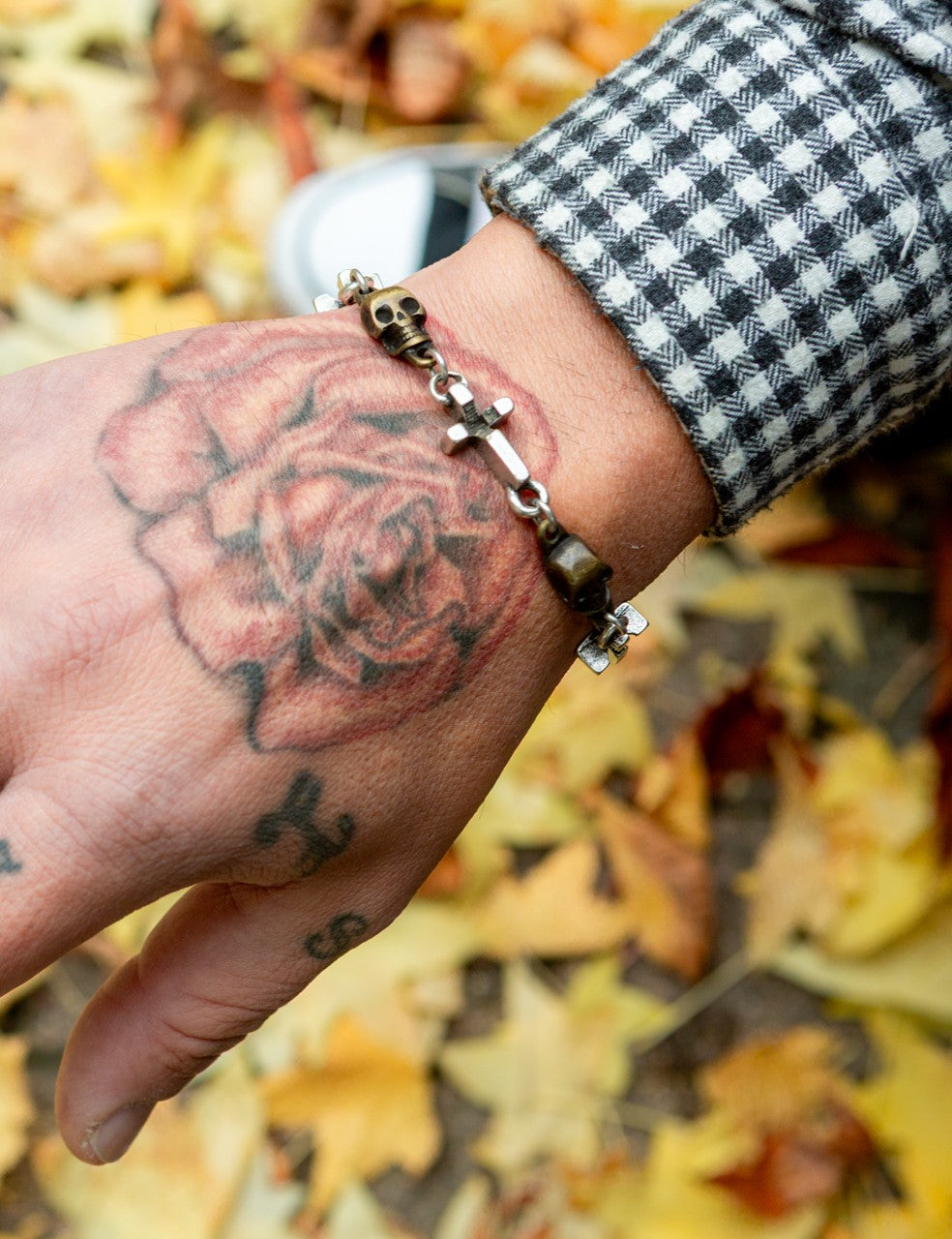 Uno dei bracciali dallo stile più rock della collezione Cryady è il bracciale Infierno in cui i teschi e croci si susseguono per poter abbracciare il polso alternandosi le une agli altri. Il teschio può rappresentare la vittoria della Morte sulla vita e la fugacità dell’esistenza tuttavia l’impatto negativo del messaggio può essere temperato dalla fede nella Vita oltre la Morte. Solitamente quando si riesce a cambiare la propria vita positivamente ci si tatua un teschio il quale rappresenta la vita passata che si è lasciata alle spalle. La croce è tra i simboli più controversi e utilizzati per esprimere il profondo legame con la propria spiritualità. La croce infatti a seconda delle diverse culture e dei diversi modi di raffigurarla presenta significati differenti. Chi decide di tatuarsi questo simbolo va oltre la voglia di avere qualcosa di stiloso sul proprio corpo ma desidera avere un richiamo al desiderio di contatto con il divino e l’universo che risiede in ognuno di noi.