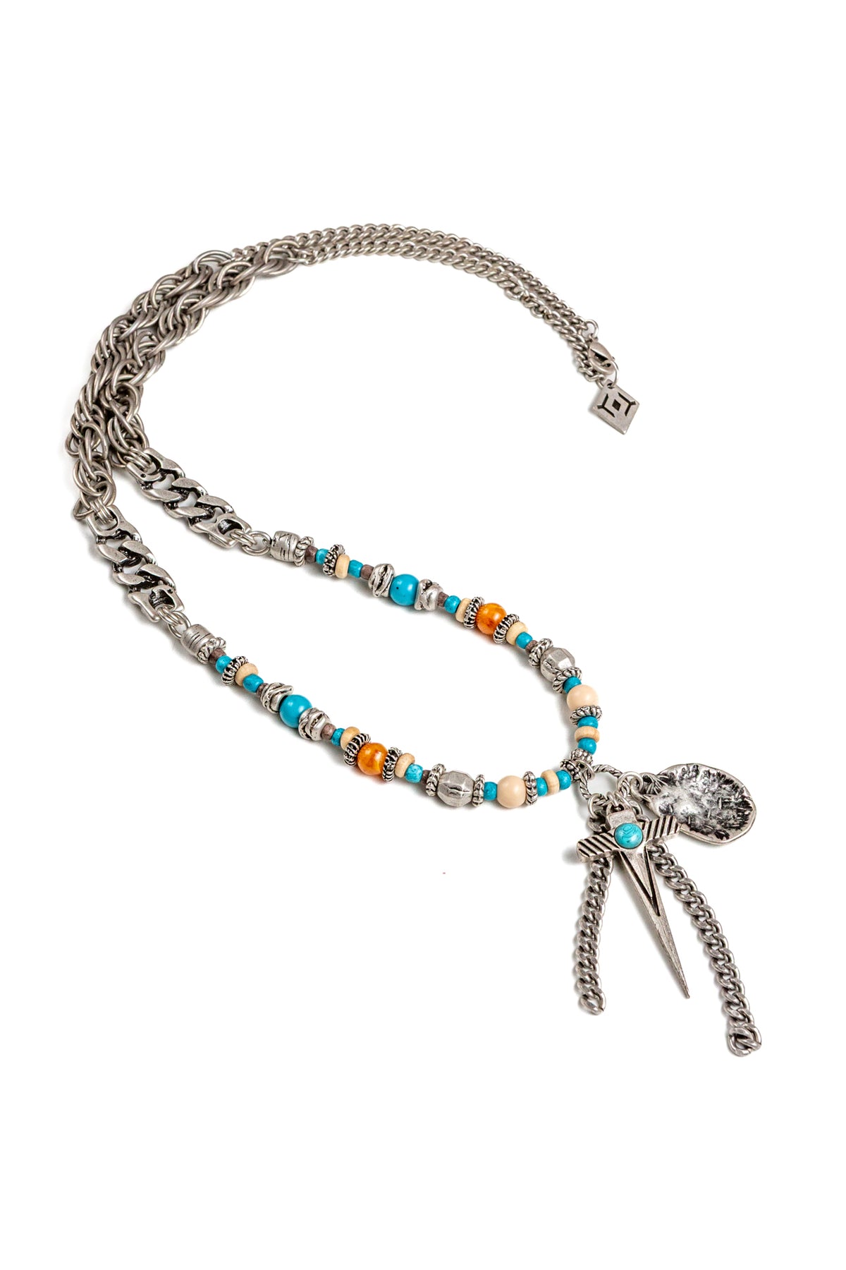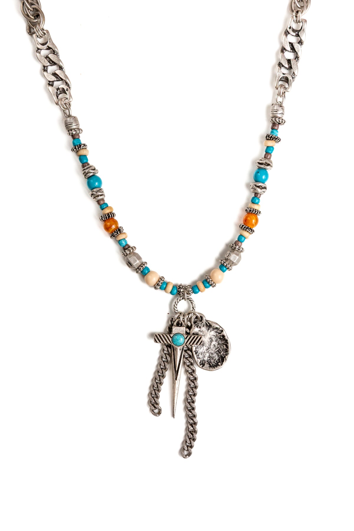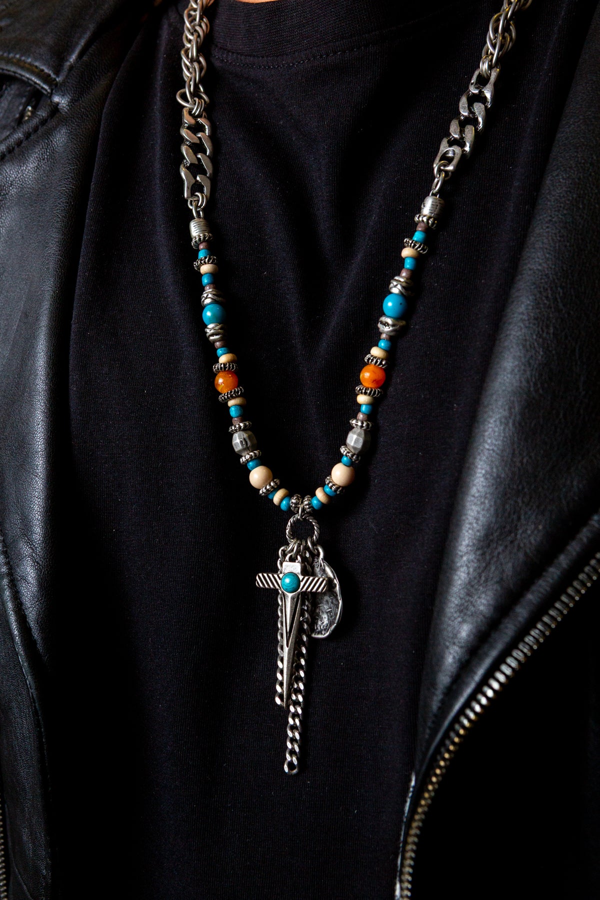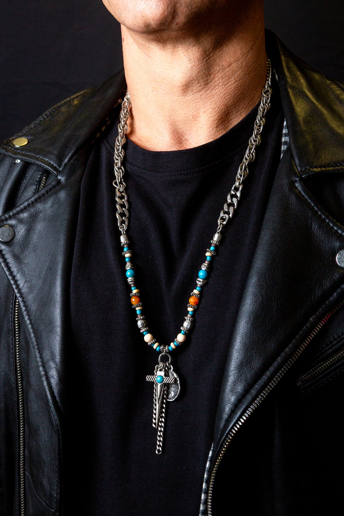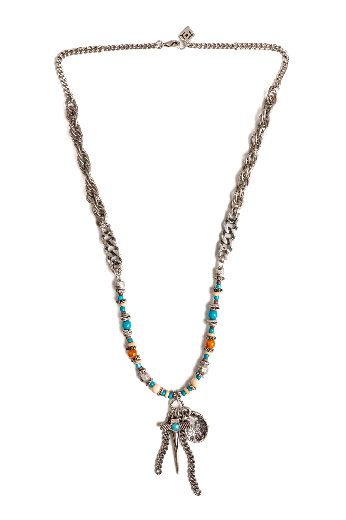 "Amleto" è una collana realizzata con componenti in lega seminaturale (zinco, alluminio) e ottone. Il rivestimento è in argento brunito anallergico. Le componenti in metallo sono alternate da elementi in cristallo turchese e ambrato, piccoli sassi color turchese ed rondelle in legno. Al centro due fili di catena e due ciondoli: una piastrina martellata e una spada con incastonata una pietra turchese. La collana Amleto la puoi indossare da sola o assieme ad altri gioielli Cryady. Per uomo e per donna. Ogni creazione Cryady è realizzata artigianalmente con dedizione e passione.