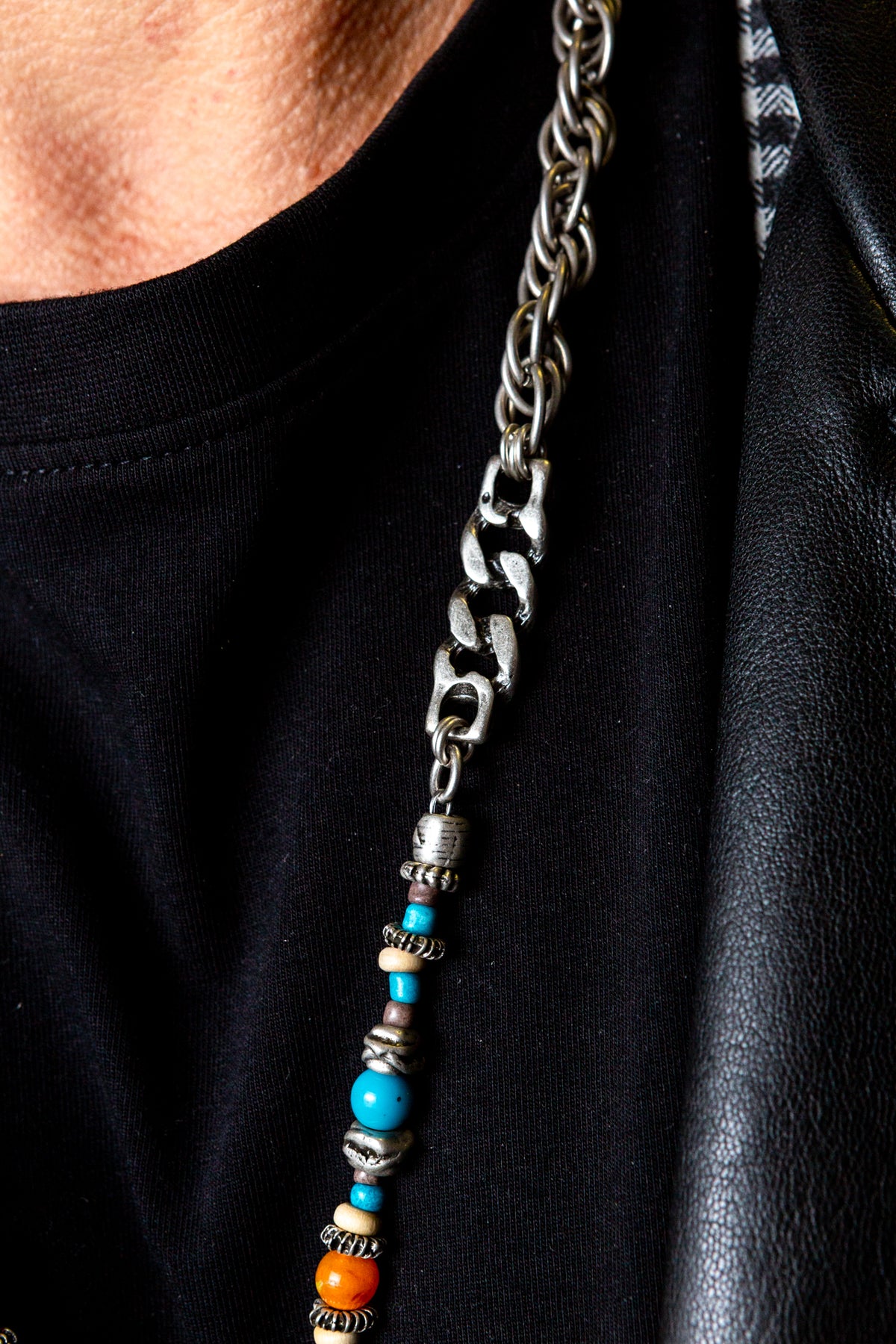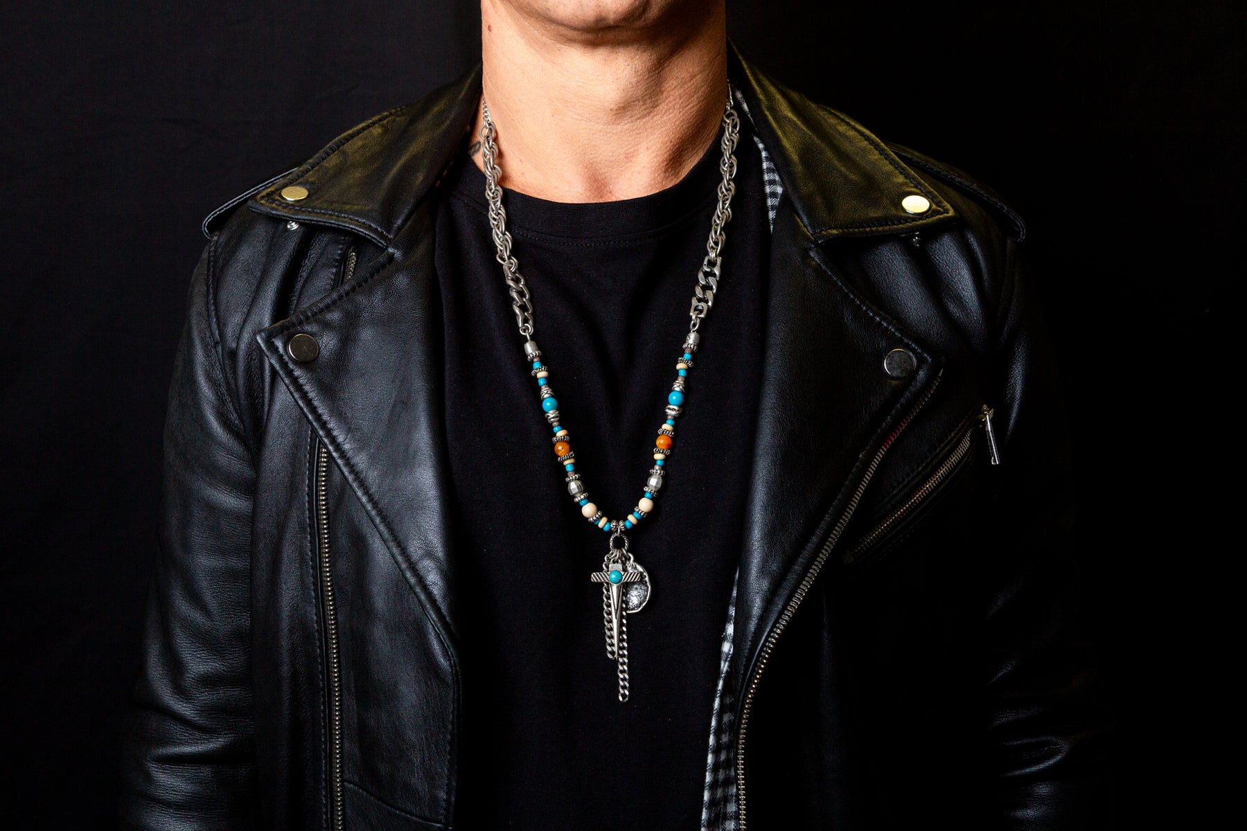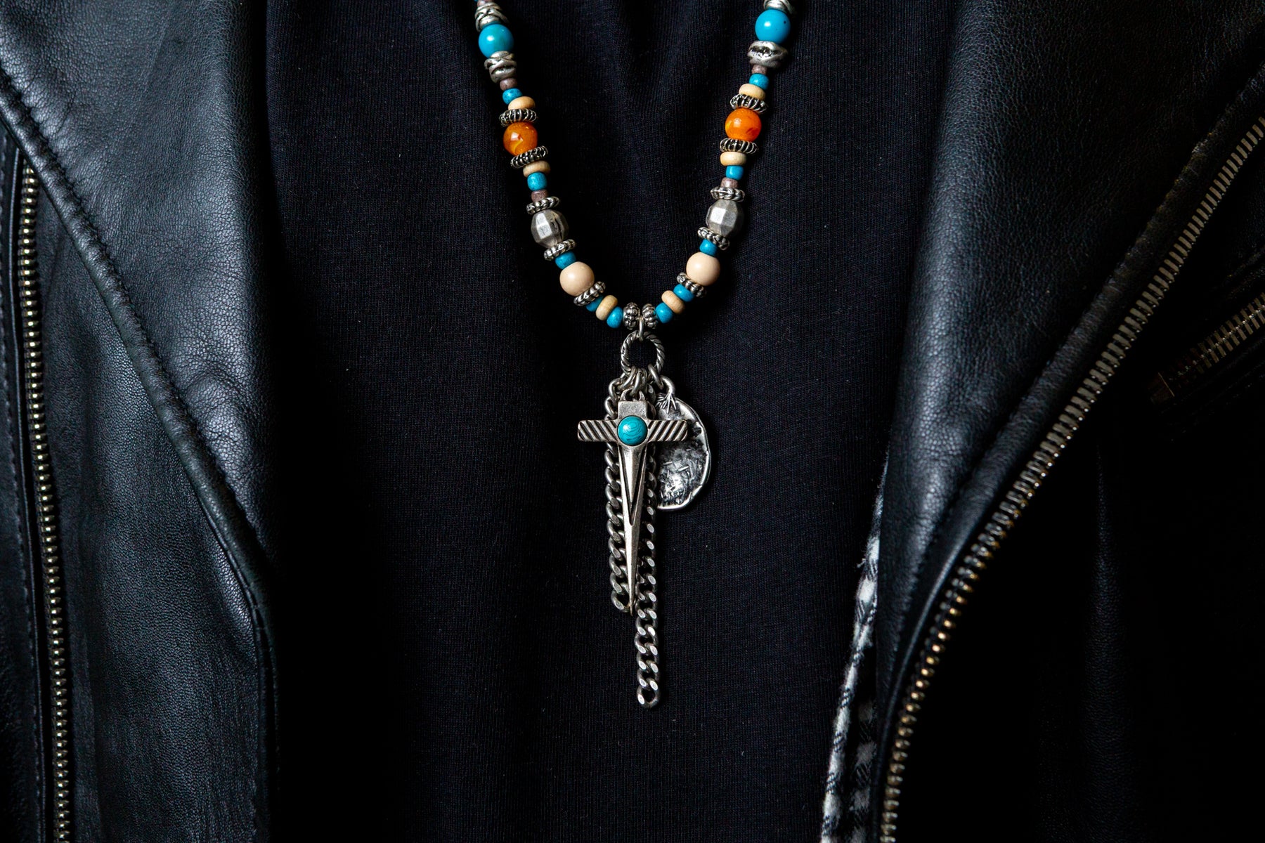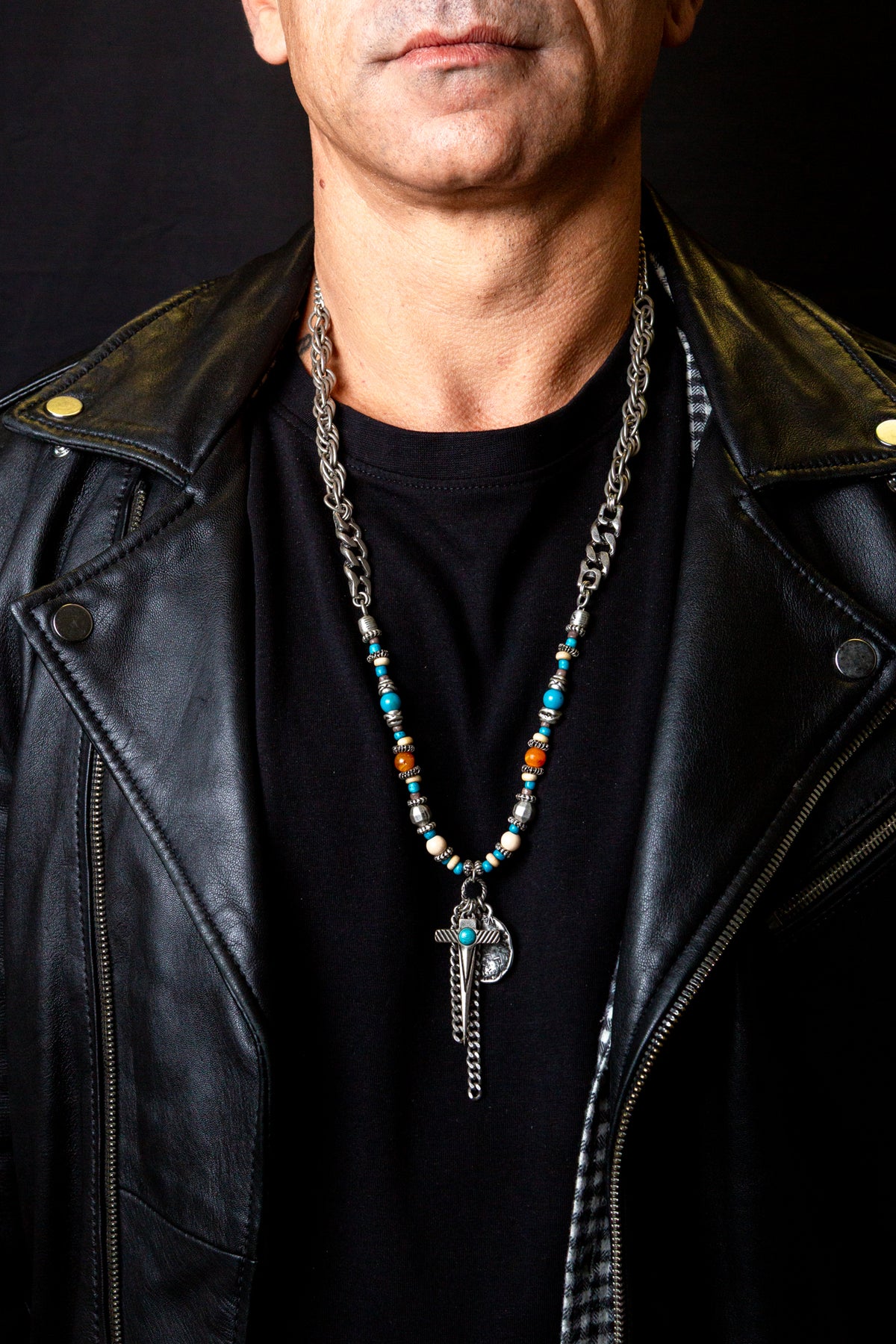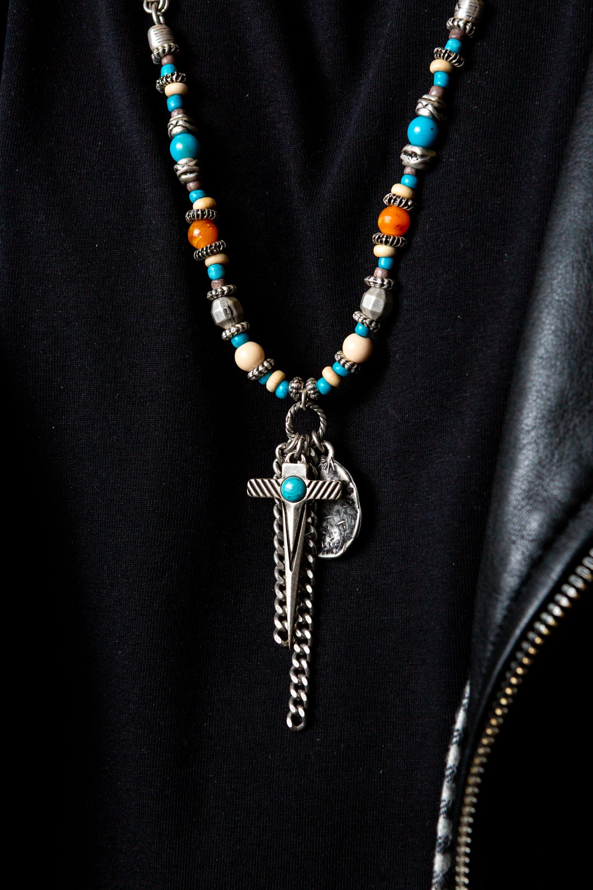 "Amleto" è una collana realizzata con componenti in lega seminaturale (zinco, alluminio) e ottone. Il rivestimento è in argento brunito anallergico. Le componenti in metallo sono alternate da elementi in cristallo turchese e ambrato, piccoli sassi color turchese ed rondelle in legno. Al centro due fili di catena e due ciondoli: una piastrina martellata e una spada con incastonata una pietra turchese. La collana Amleto la puoi indossare da sola o assieme ad altri gioielli Cryady. Per uomo e per donna. Ogni creazione Cryady è realizzata artigianalmente con dedizione e passione.