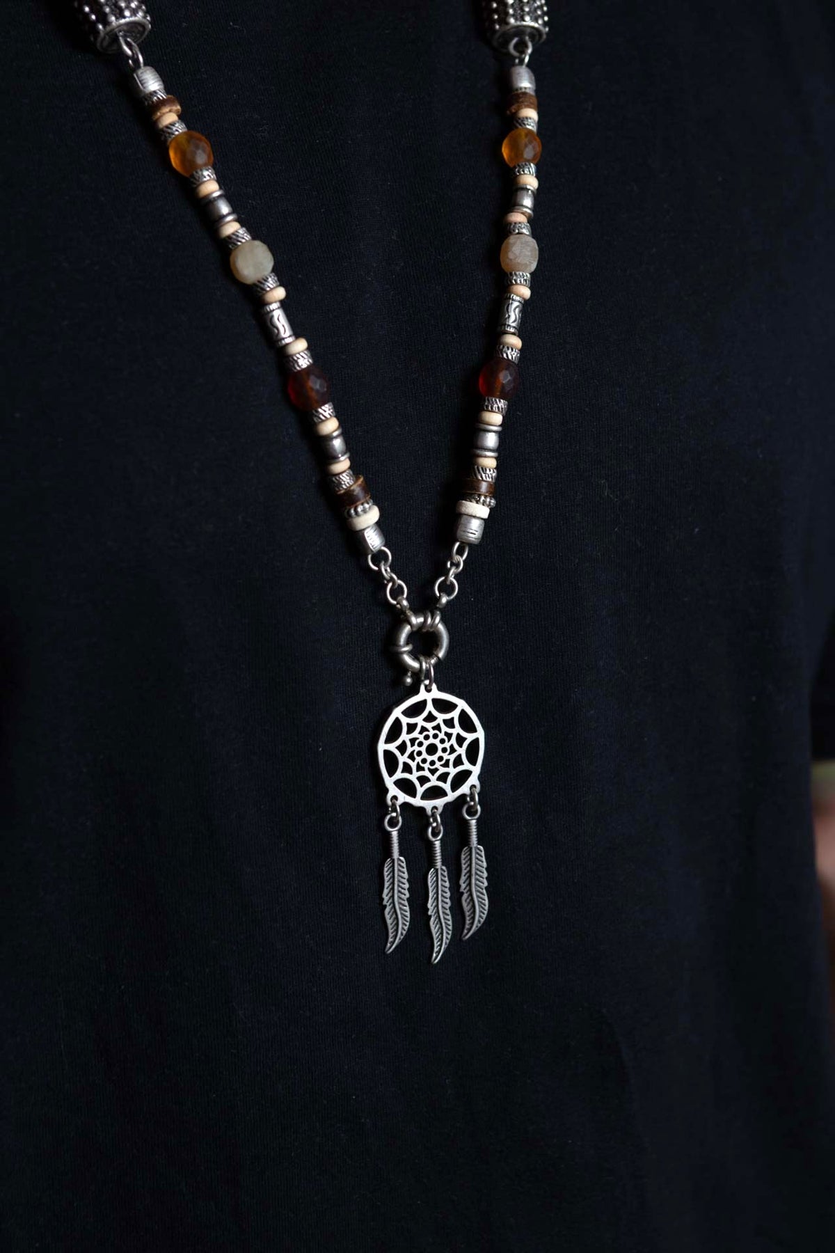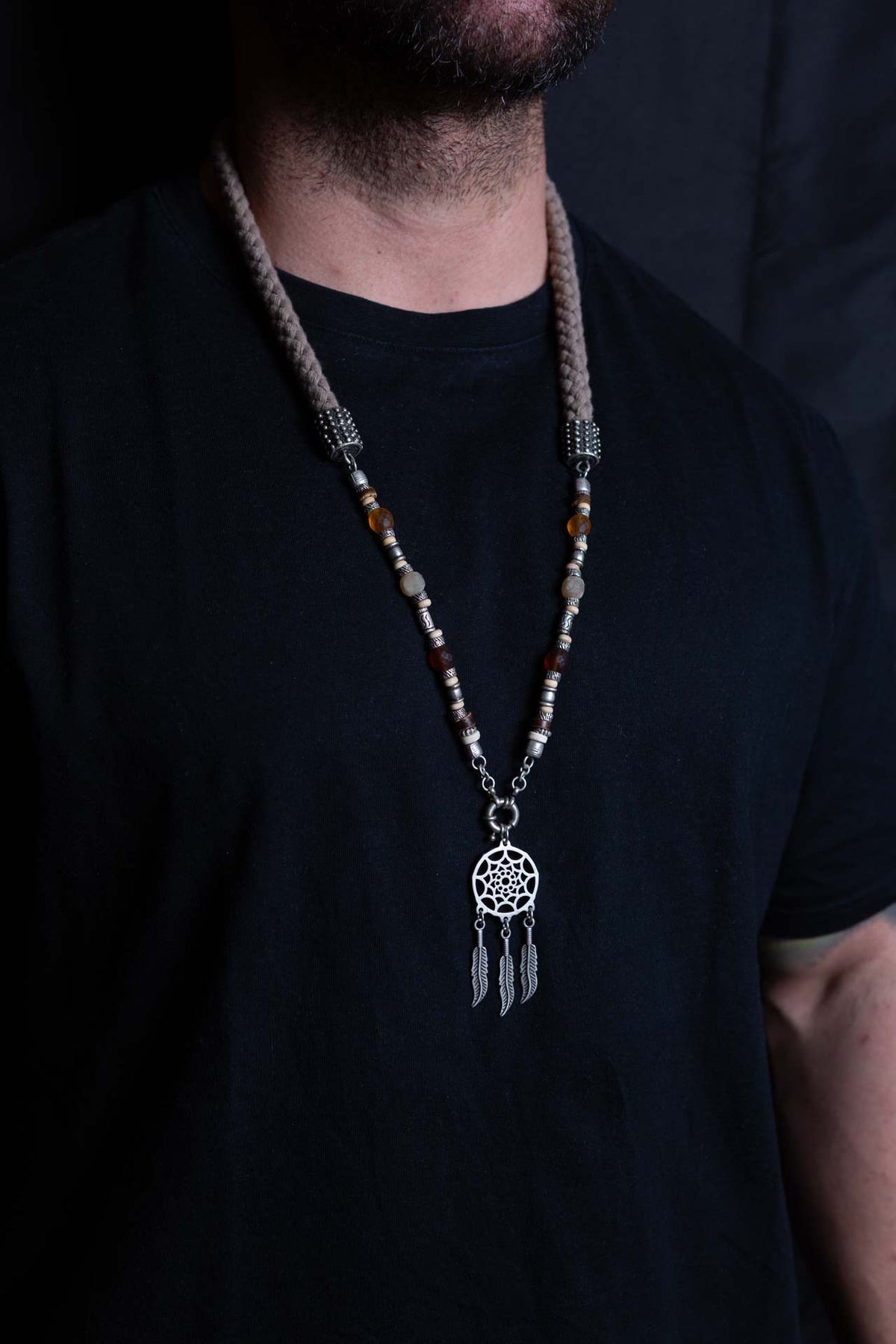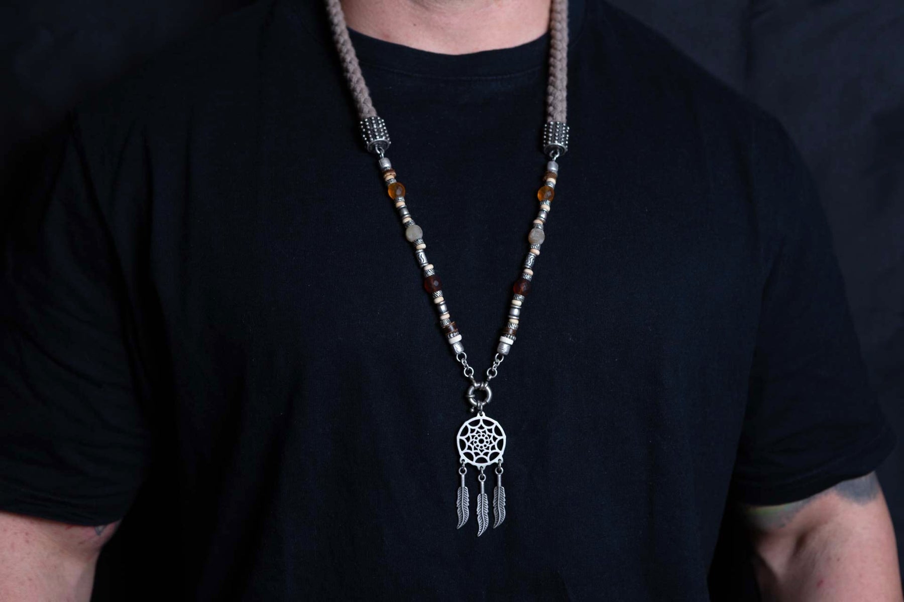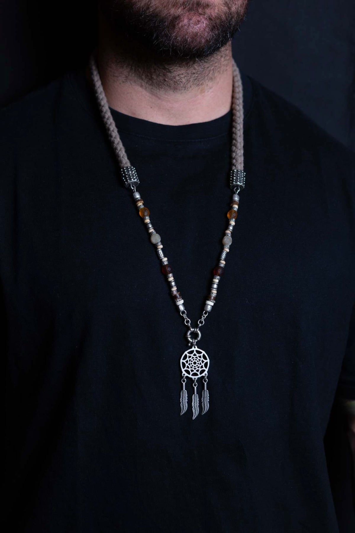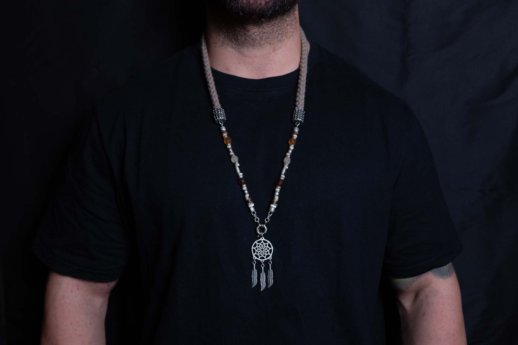"Navajo" è una collana dove i protagonisti sono i tre ciondoli intercambiali: il ciondolo con pietra color ambra, un cattura sogni e una moneta . Navajo è una collana realizzata con componenti in lega seminaturale (zinco, alluminio) e ottone. Il rivestimento è in argento brunito anallergico. Ad alternare gli elementi in metallo vi sono pietra in cristallo e rondelle in legno. Nella parte che appoggia sul collo vi è un cordone intrecciato in cotone color sabbia. La collana Navajo la puoi indossare da sola o assieme ad altri gioielli Cryady. Per uomo e per donna. Ogni creazione Cryady è realizzata artigianalmente con dedizione e passione. I materiali utilizzati sono tutti certificati in rispetto delle normative vigenti CEE.