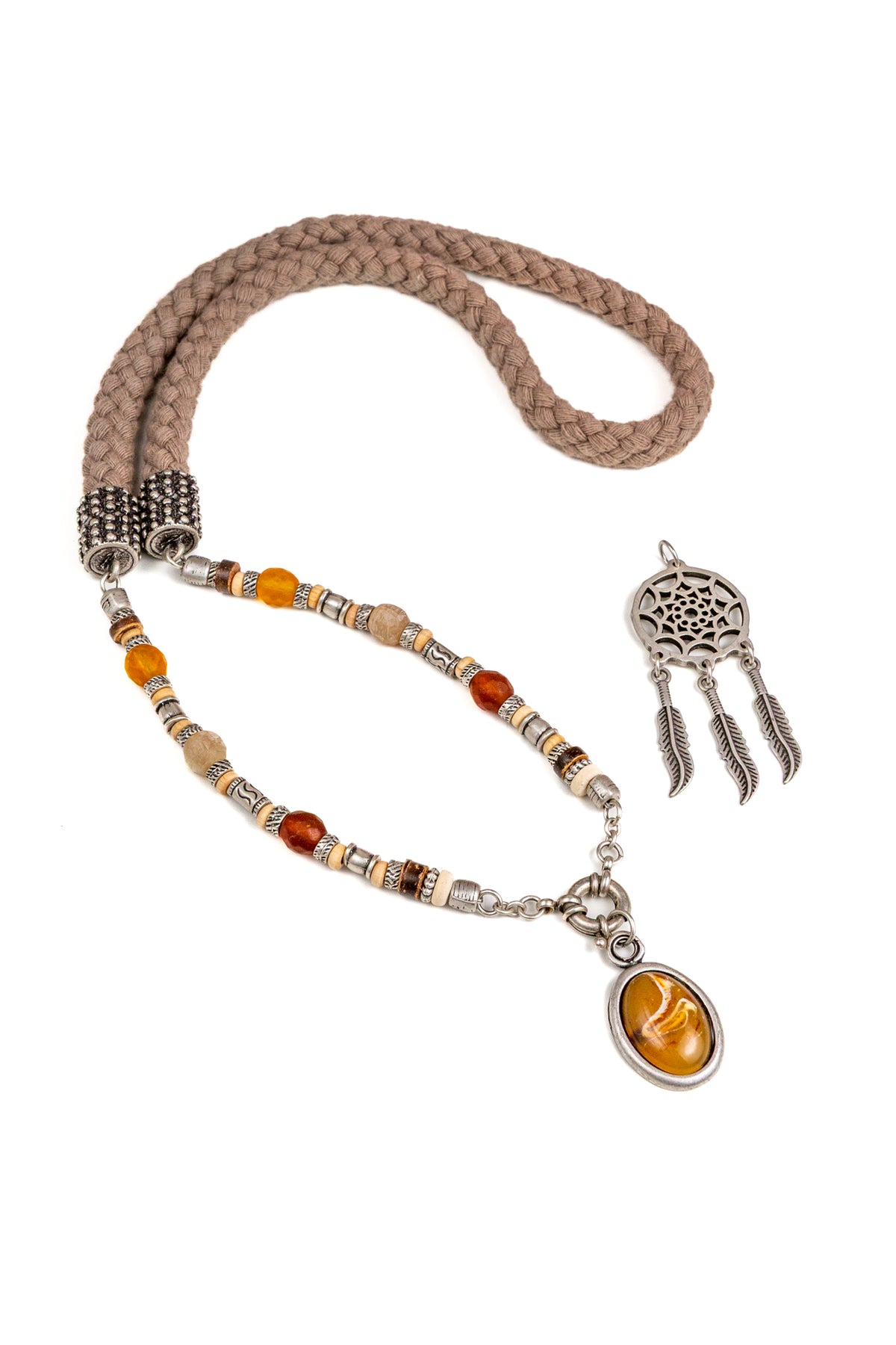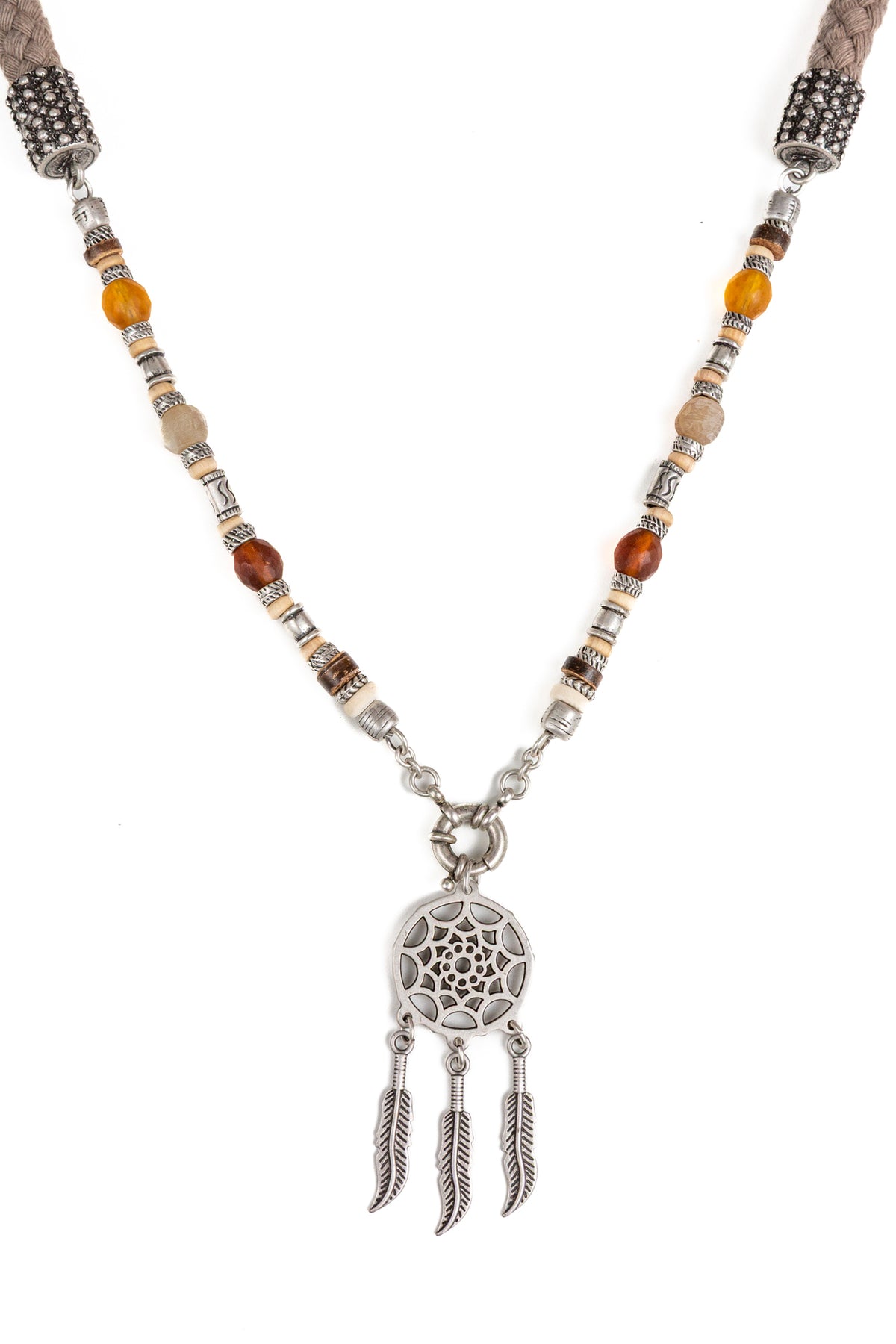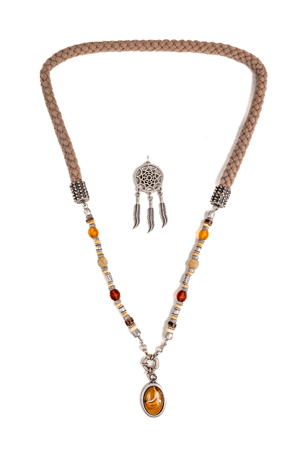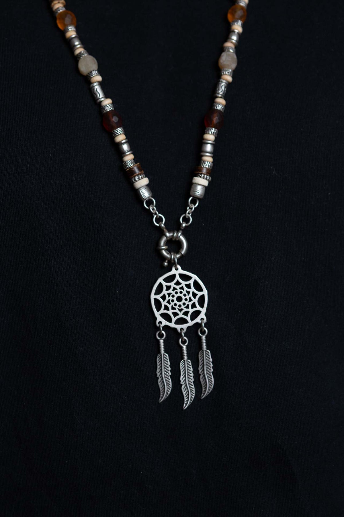 "Navajo" è una collana dove i protagonisti sono i tre ciondoli intercambiali: il ciondolo con pietra color ambra, un cattura sogni e una moneta . Navajo è una collana realizzata con componenti in lega seminaturale (zinco, alluminio) e ottone. Il rivestimento è in argento brunito anallergico. Ad alternare gli elementi in metallo vi sono pietra in cristallo e rondelle in legno. Nella parte che appoggia sul collo vi è un cordone intrecciato in cotone color sabbia. La collana Navajo la puoi indossare da sola o assieme ad altri gioielli Cryady. Per uomo e per donna. Ogni creazione Cryady è realizzata artigianalmente con dedizione e passione. I materiali utilizzati sono tutti certificati in rispetto delle normative vigenti CEE.
