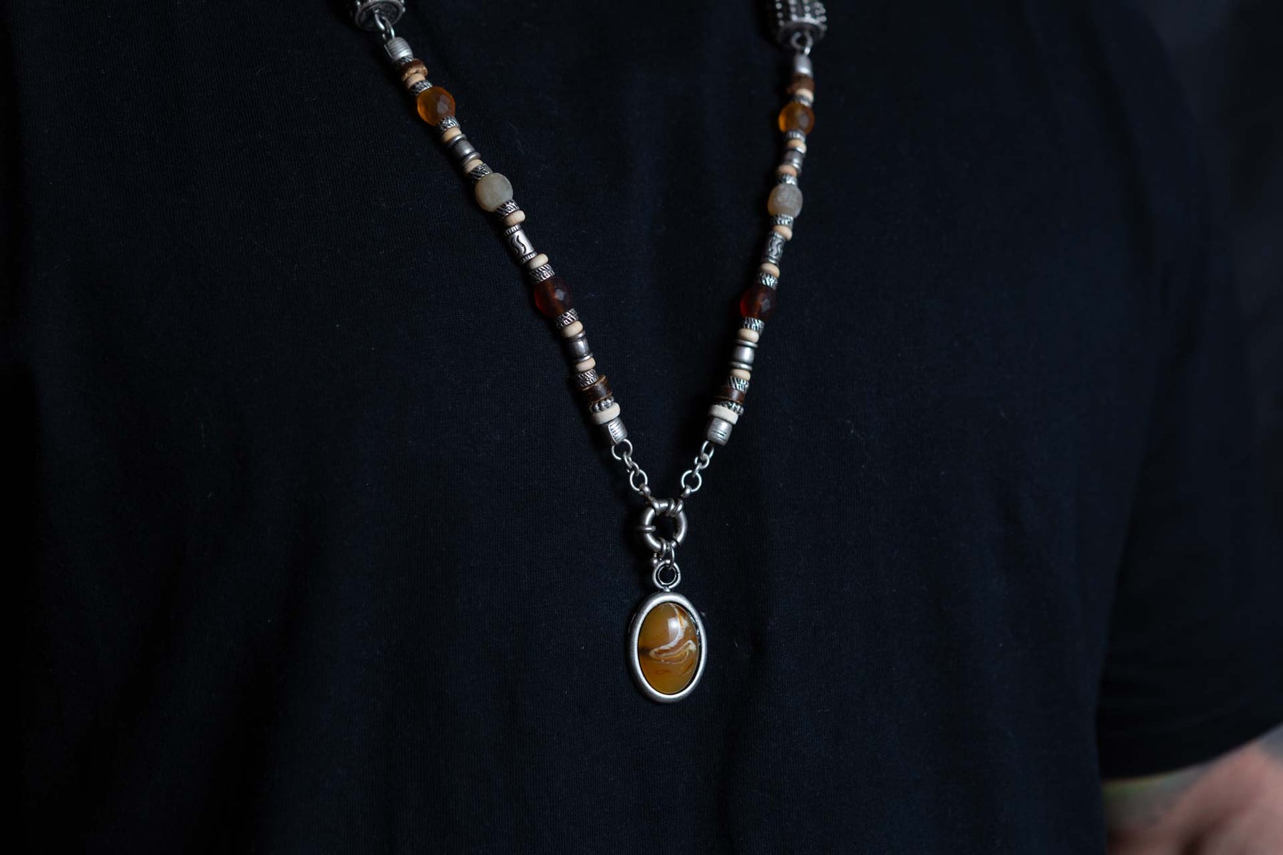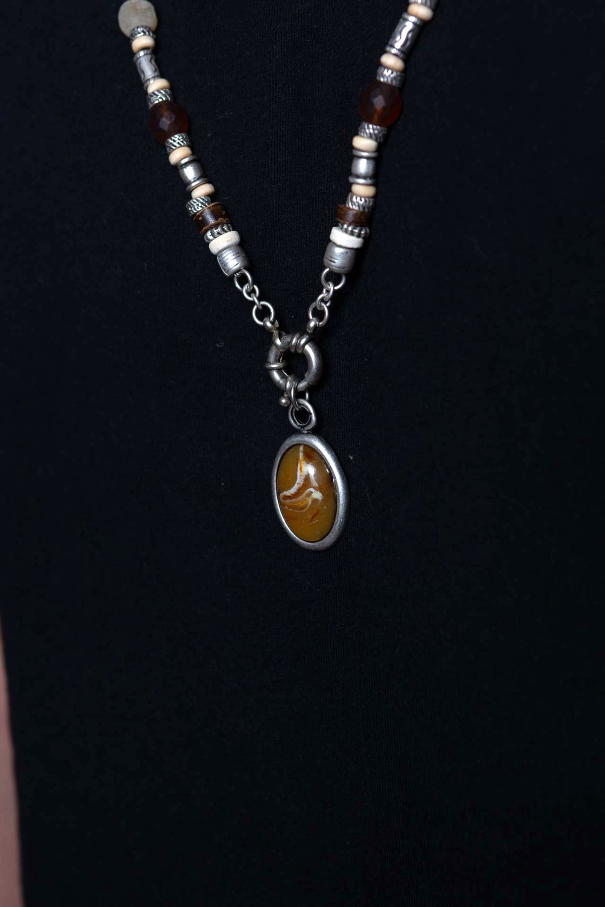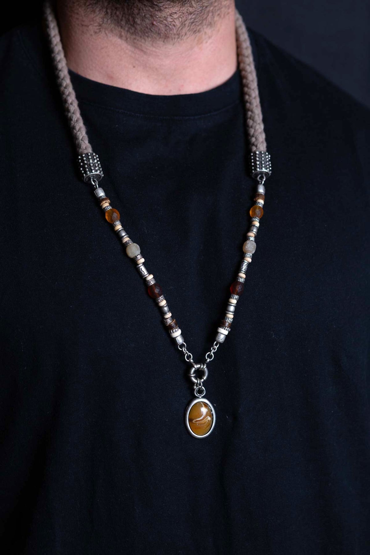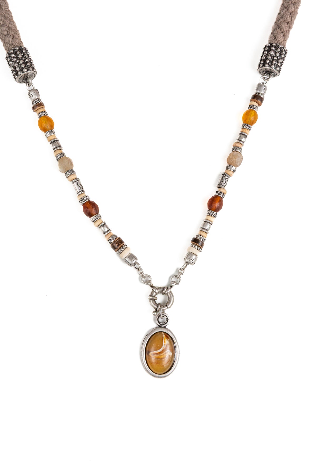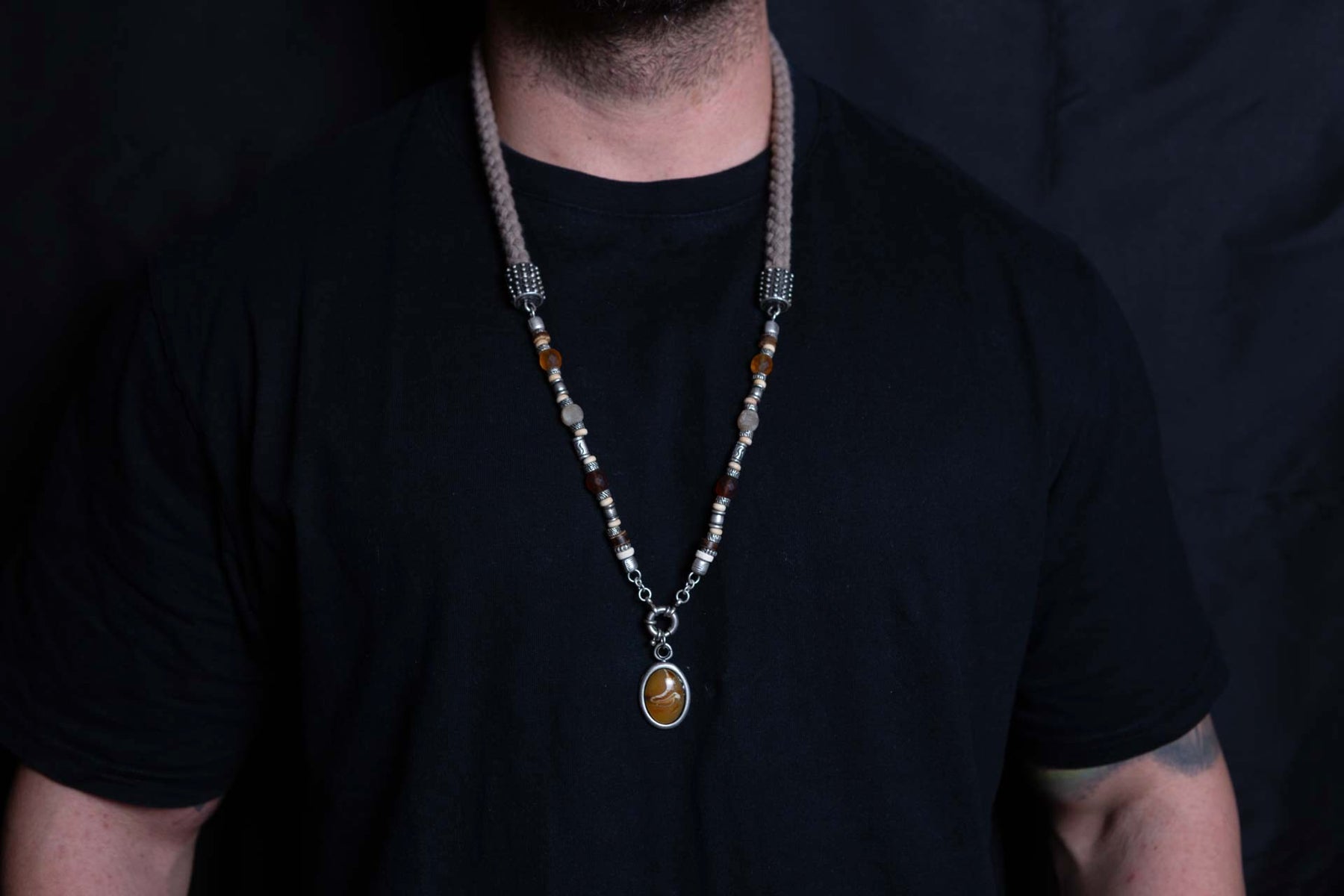 "Navajo" è una collana dove i protagonisti sono i tre ciondoli intercambiali: il ciondolo con pietra color ambra, un cattura sogni e una moneta . Navajo è una collana realizzata con componenti in lega seminaturale (zinco, alluminio) e ottone. Il rivestimento è in argento brunito anallergico. Ad alternare gli elementi in metallo vi sono pietra in cristallo e rondelle in legno. Nella parte che appoggia sul collo vi è un cordone intrecciato in cotone color sabbia. La collana Navajo la puoi indossare da sola o assieme ad altri gioielli Cryady. Per uomo e per donna. Ogni creazione Cryady è realizzata artigianalmente con dedizione e passione. I materiali utilizzati sono tutti certificati in rispetto delle normative vigenti CEE.