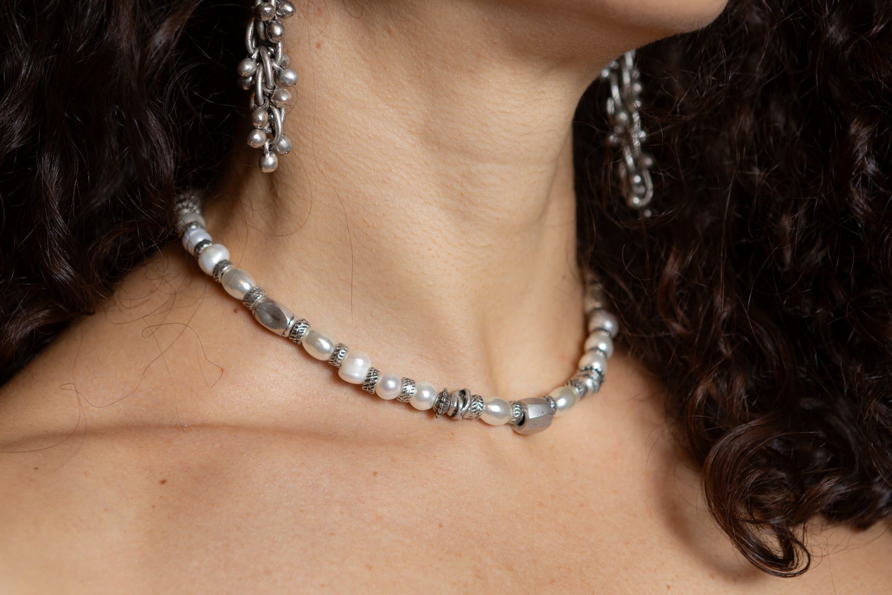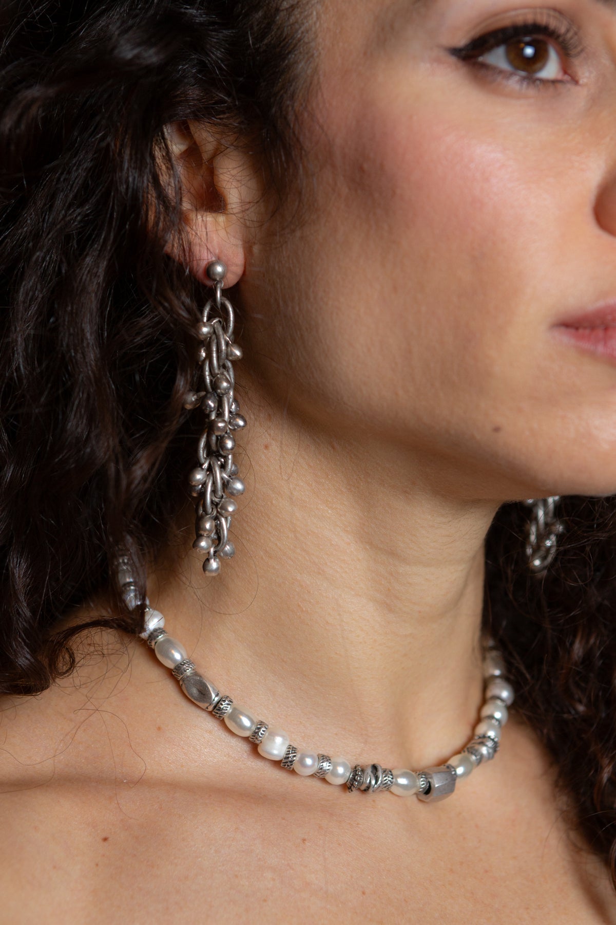 Materiale: lega di zinco e alluminio galvanizzato in argento brunito, ottone, perle di acqua dolce naturali,  cristallo. 100% Anallergico