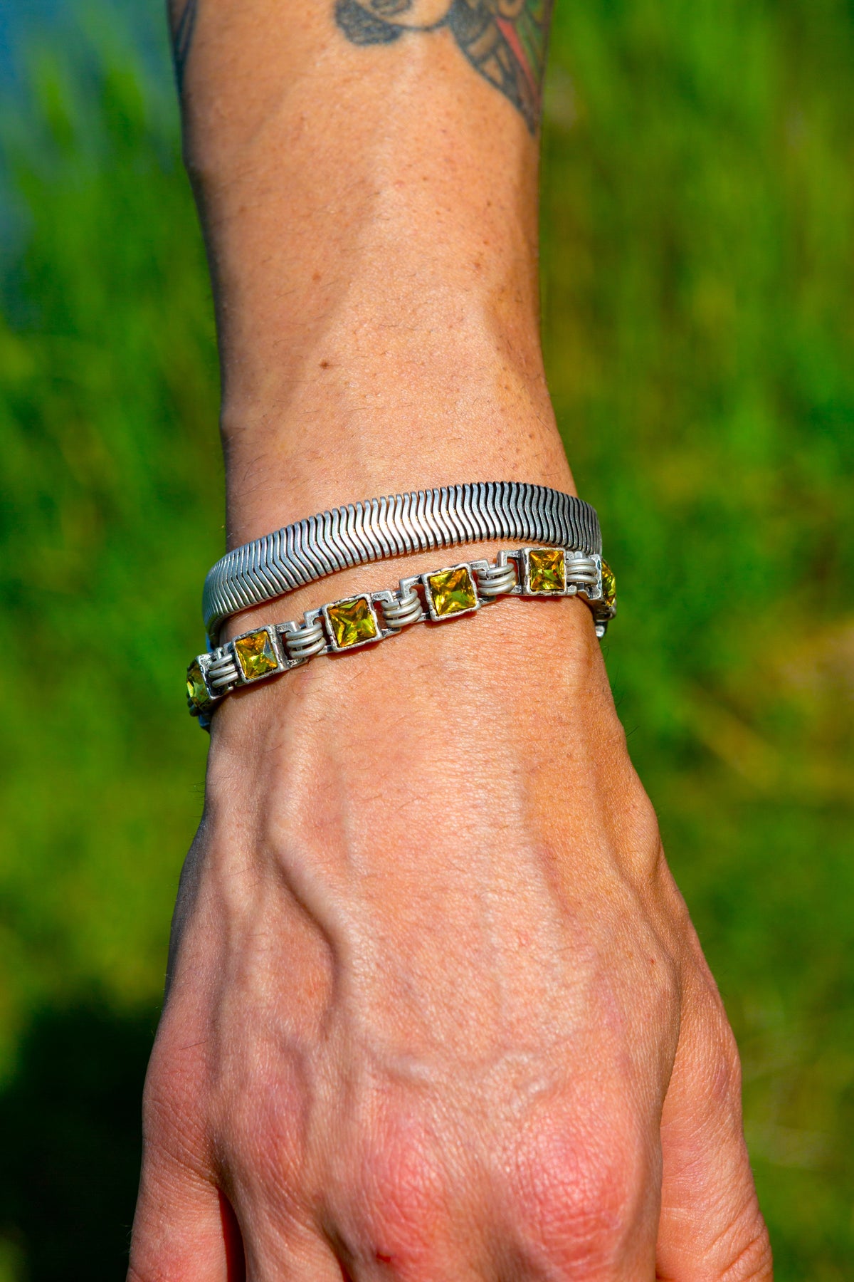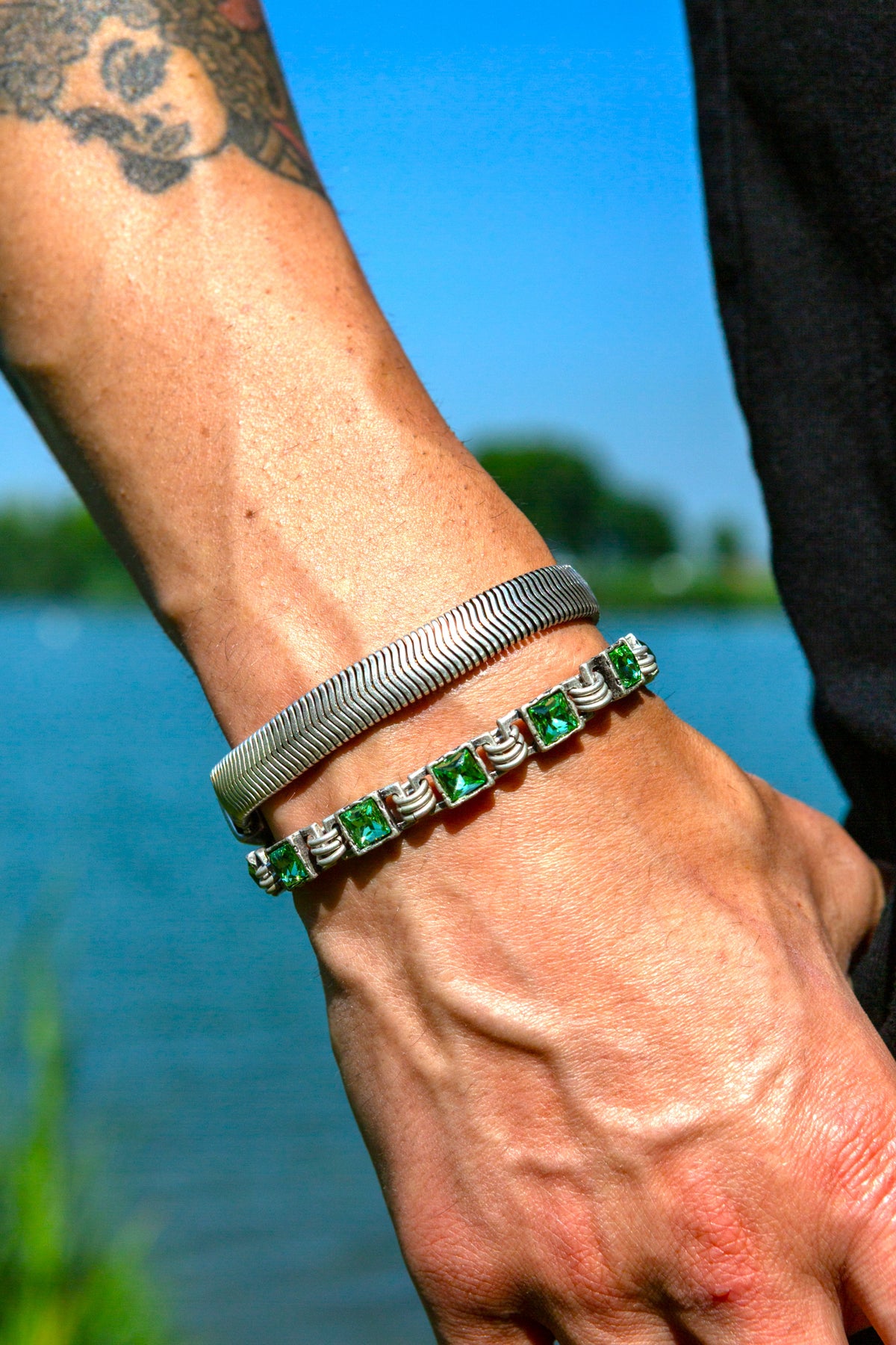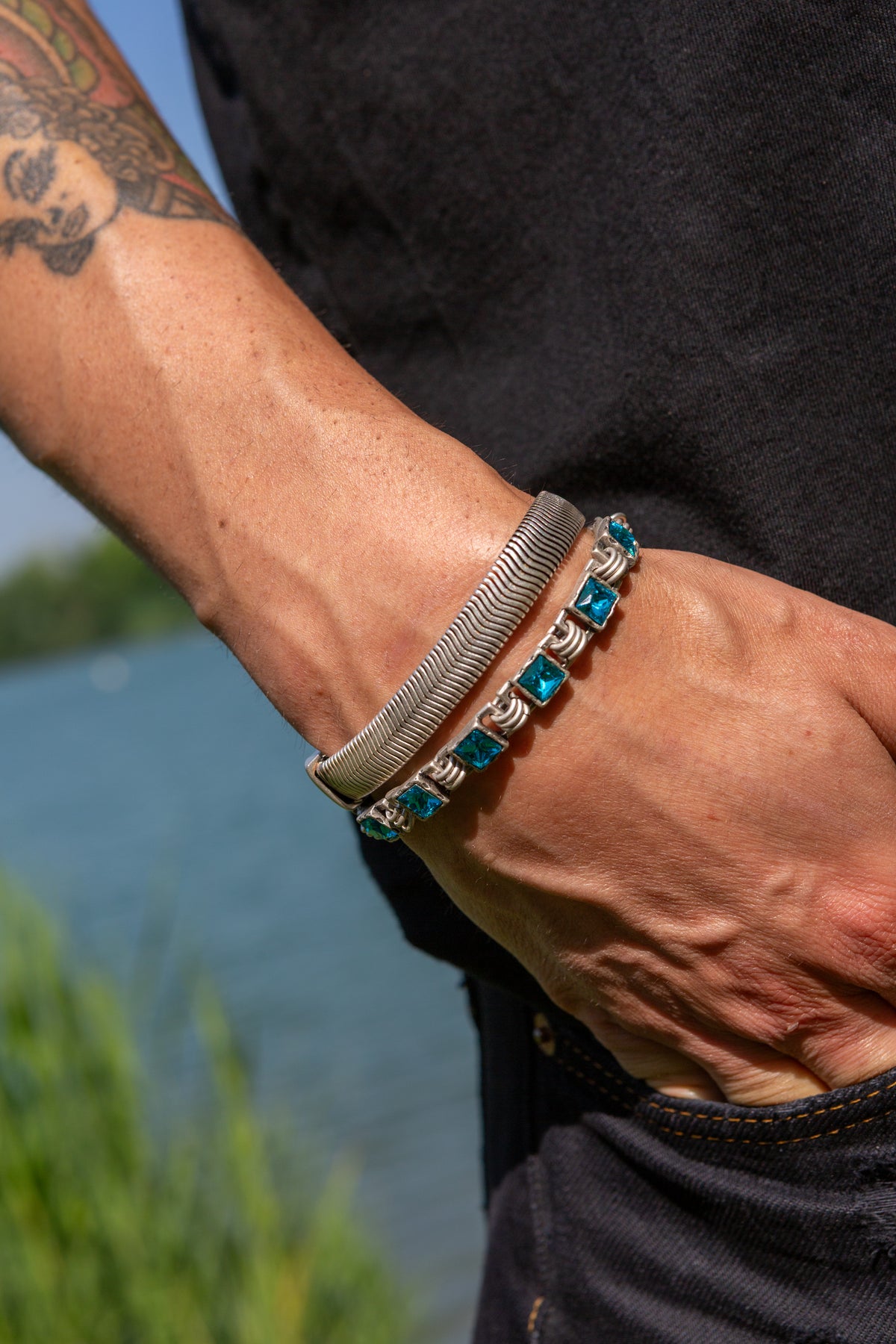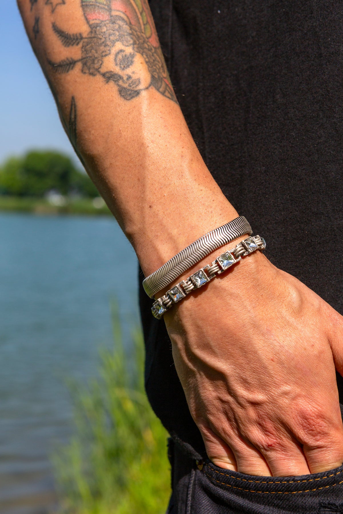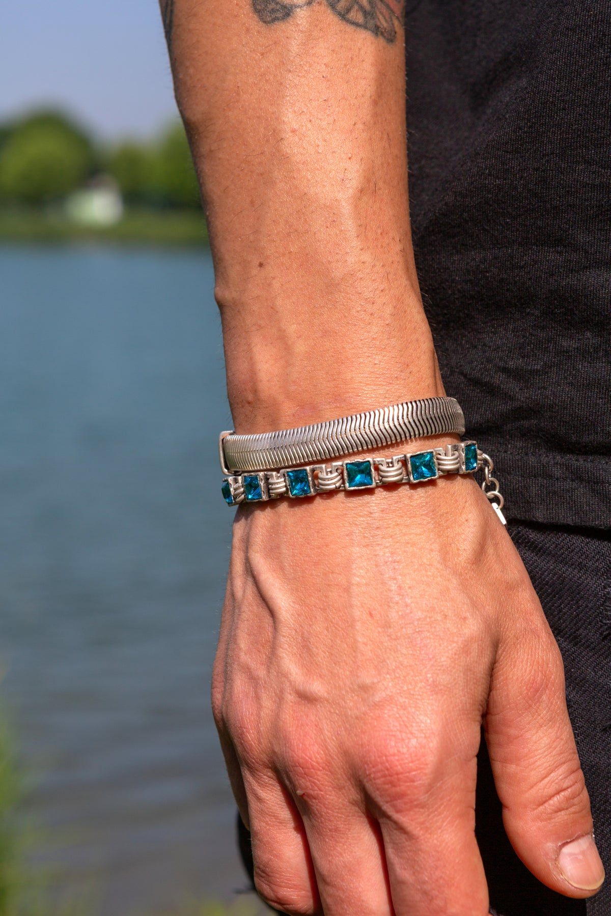 Material: aleación seminatural (magnesio zinc aluminio)Tratamiento: plata envejecida hipoalergénicaPulsera con cadena plana de latón bañada en plata envejecida hipoalergénica.