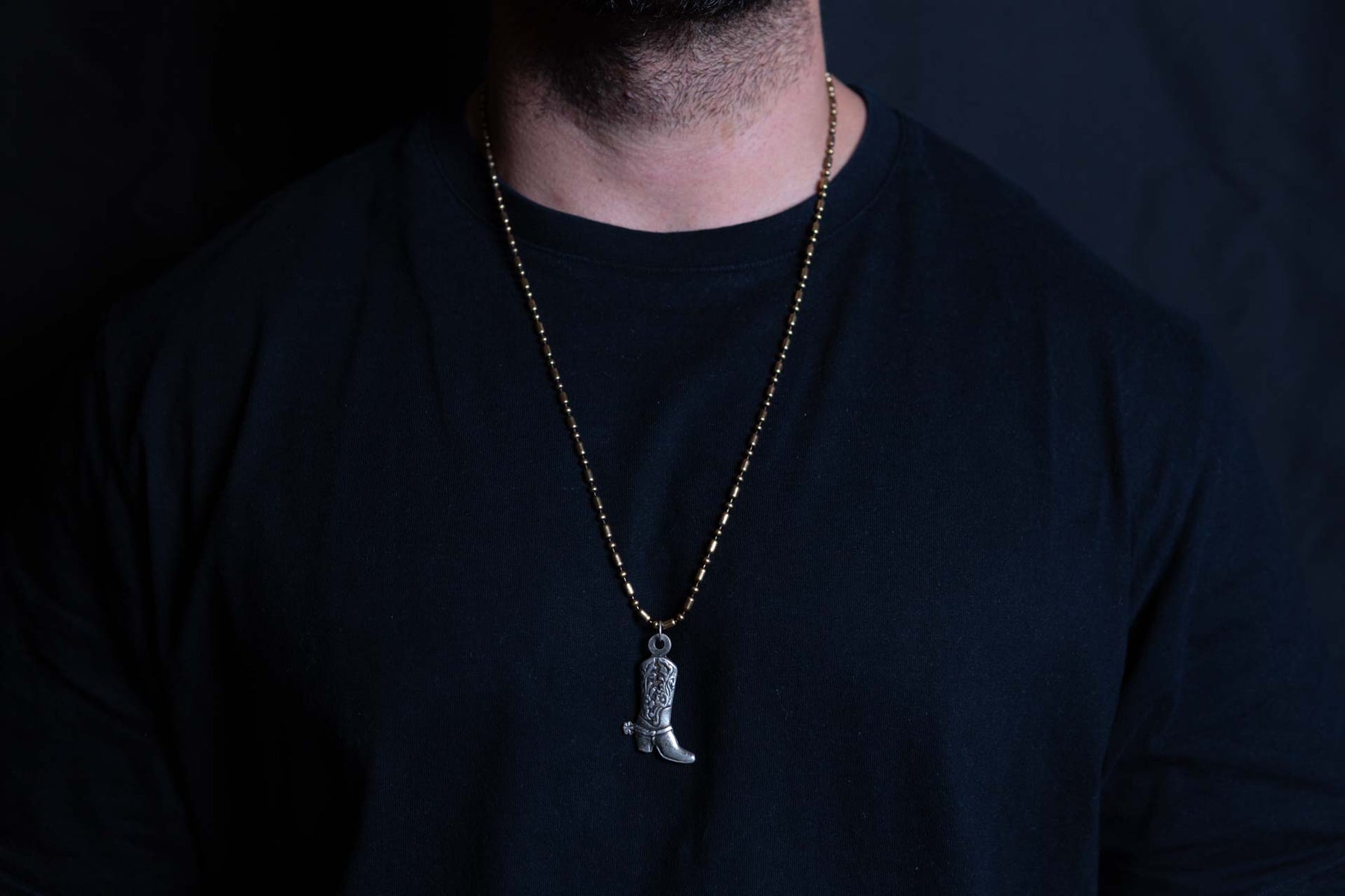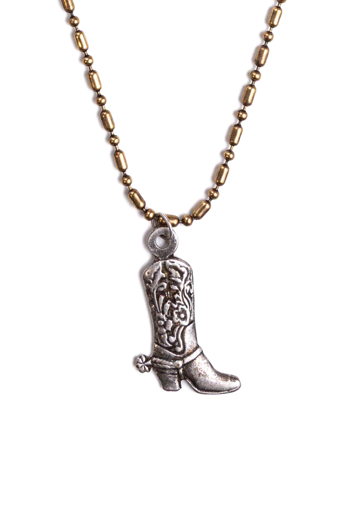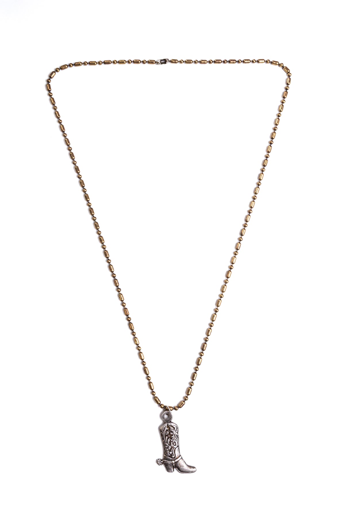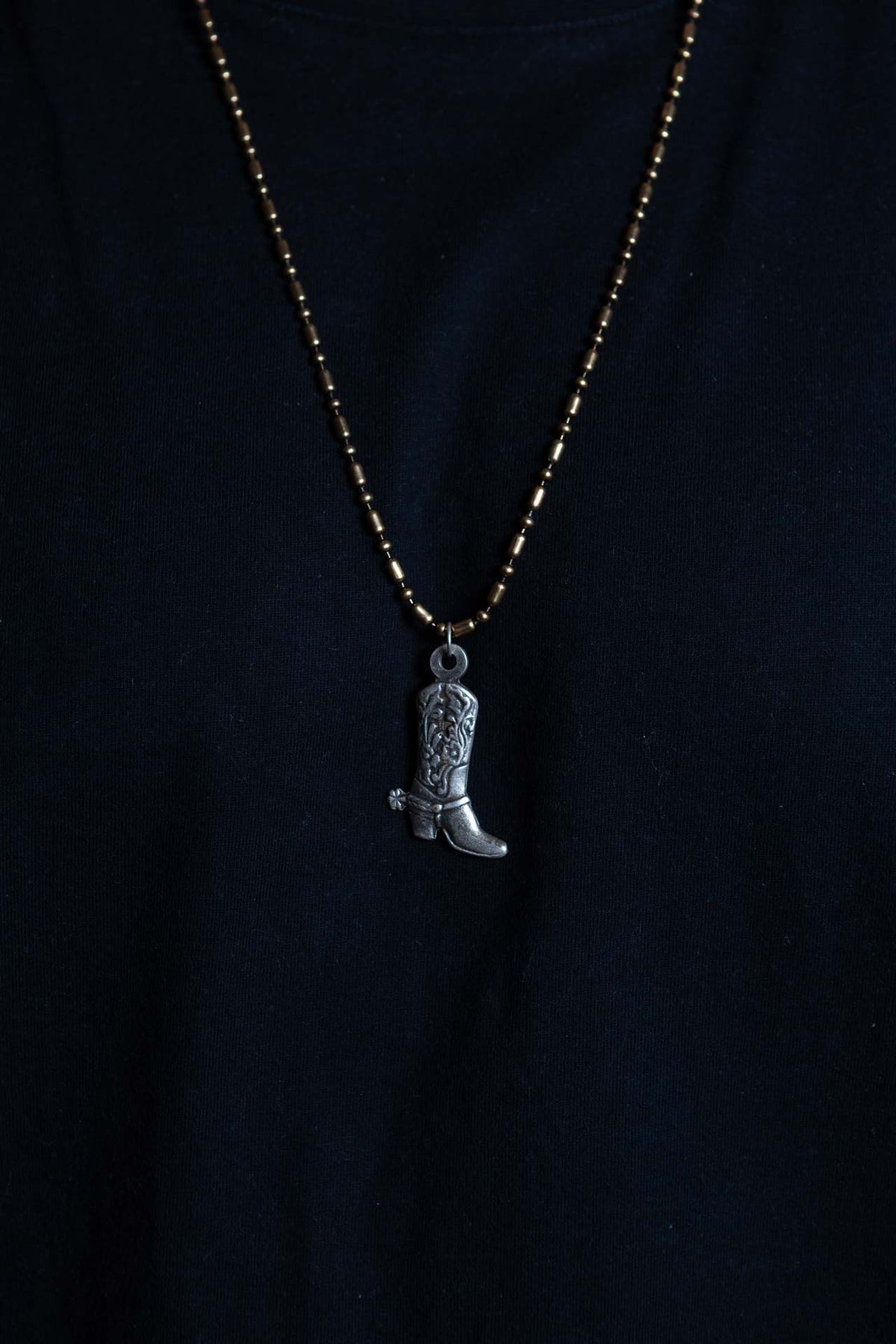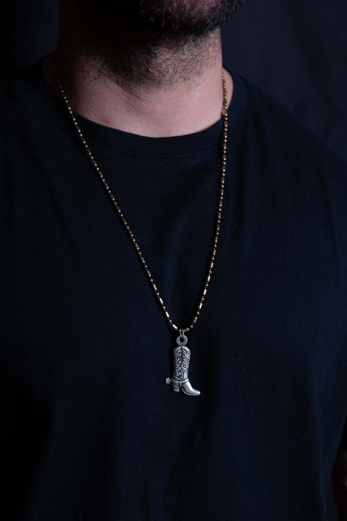 Collana con ciondolo a forma di stivale da cowboy, realizzato in lega seminaturale (alluminio e zinco) il cui rivestimento è in argento antico. La catena è in ottone galvanizzata in oro anticato. La collana Nevada la puoi indossare da sola o assieme ad altri gioielli Cryady. Per uomo e per donna. Ogni creazione Cryady è realizzata artigianalmente con dedizione e passione. I materiali utilizzati sono tutti certificati in rispetto delle normative vigenti CEE.