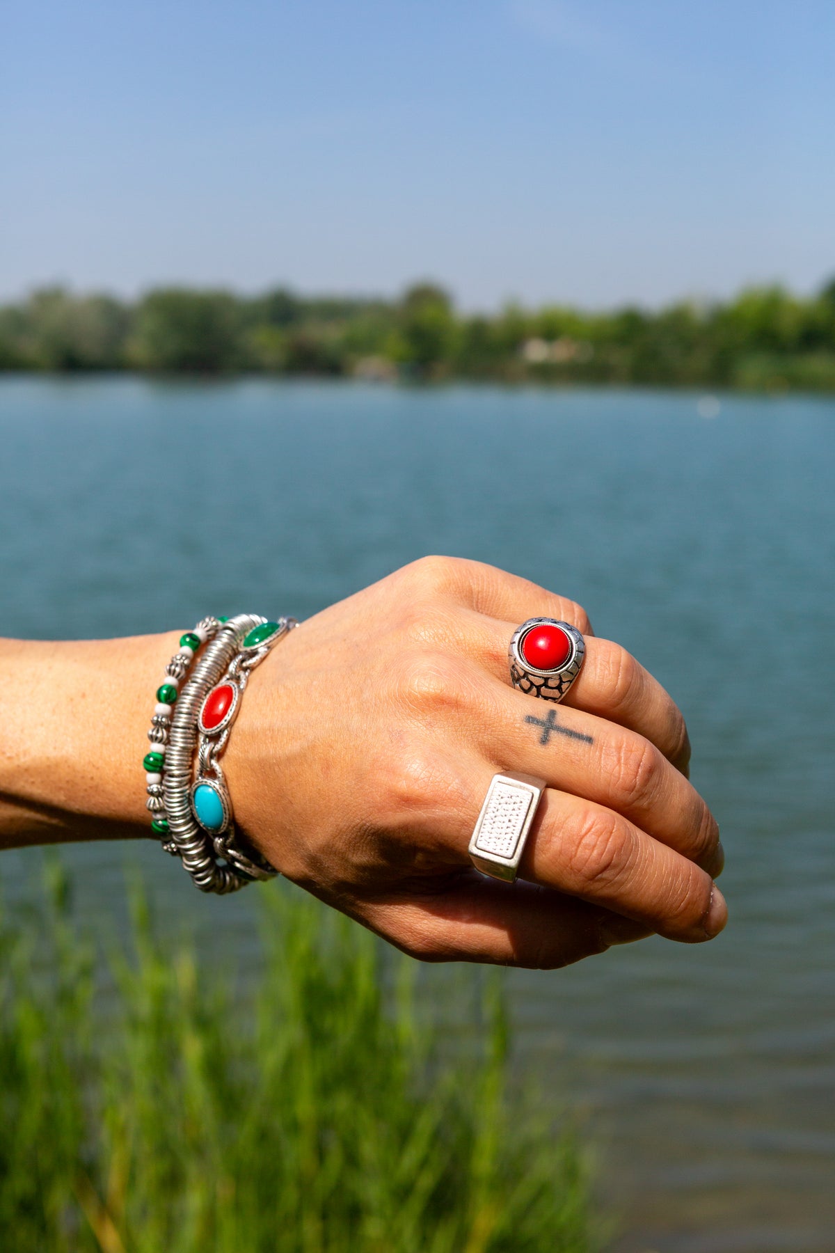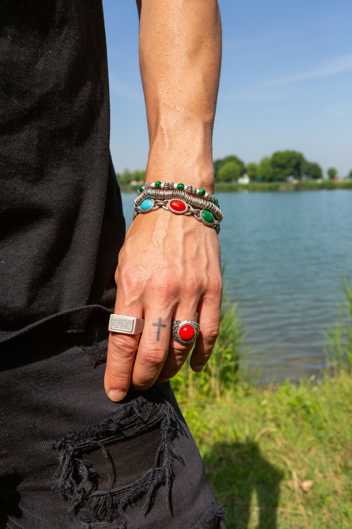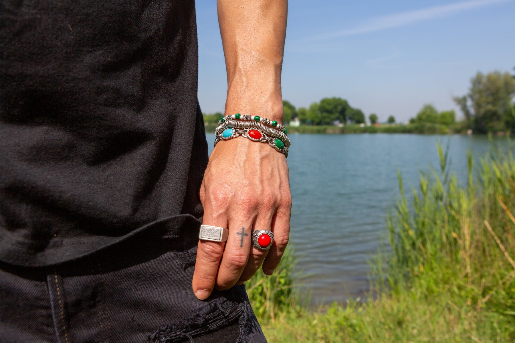 Material: aleación seminatural (magnesio zinc aluminio), piedras naturales de latón.Tratamiento: plata envejecida hipoalergénica (sin níquel), funda protectora antimanchas.