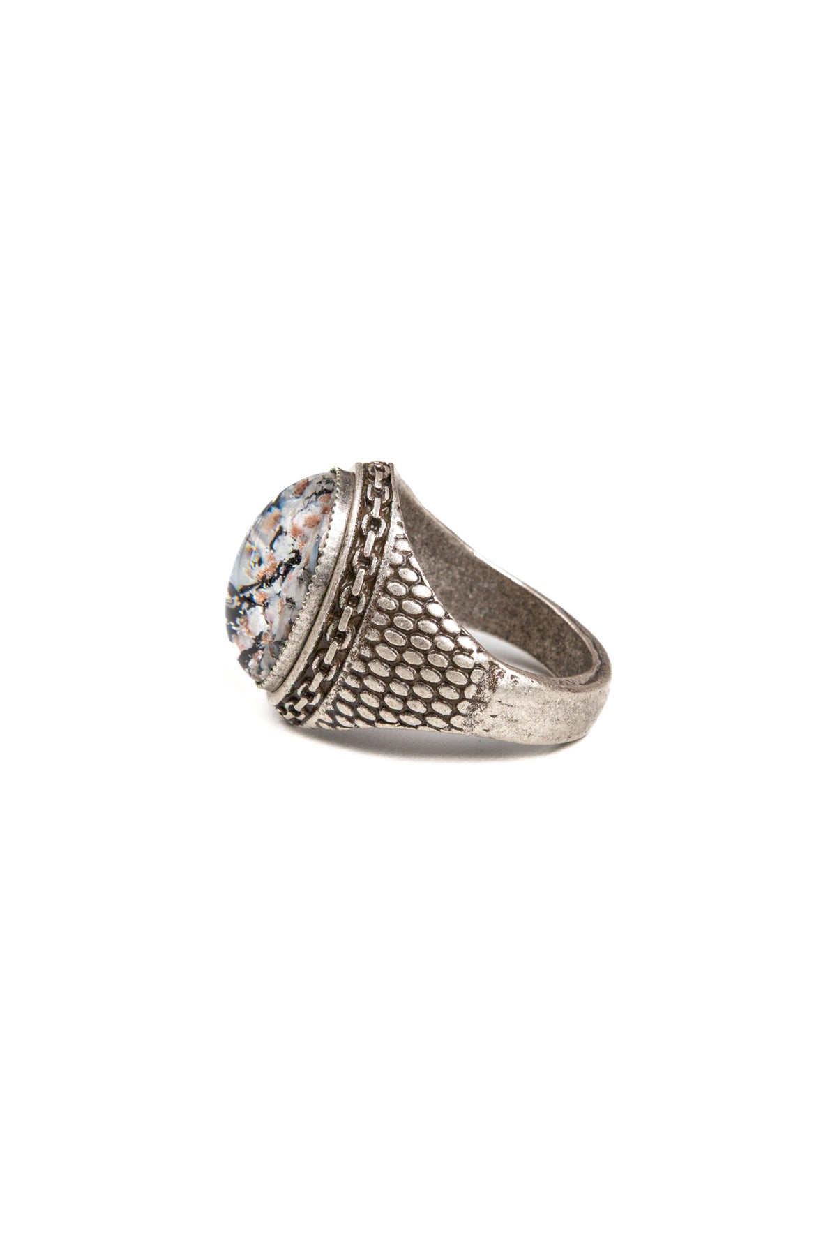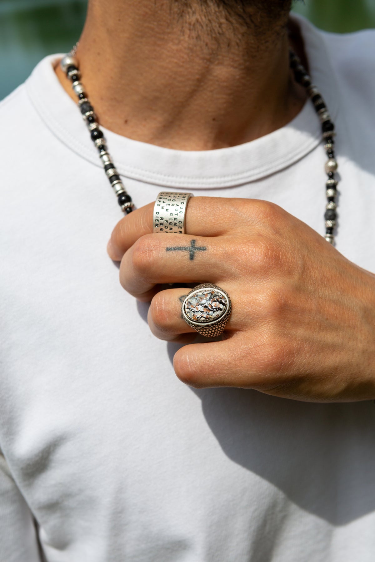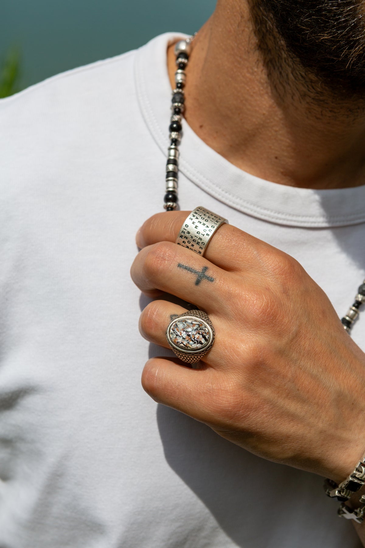 Anello in lega seminaturale di zinco e alluminio, rivestito in argento brunito. Al centro si trova una pietra incastonata in cristallo bianco con dettagli neri e beige. L'anello Hurricane lo puoi indossare da solo o assieme ad altre creazioni Cryady. Per uomo e per donna. Ogni creazione Cryady è realizzata artigianalmente con amore e passione, proprio per questo una non sarà mai perfettamente identica all’altra come se fosse un prodotto realizzato in serie.