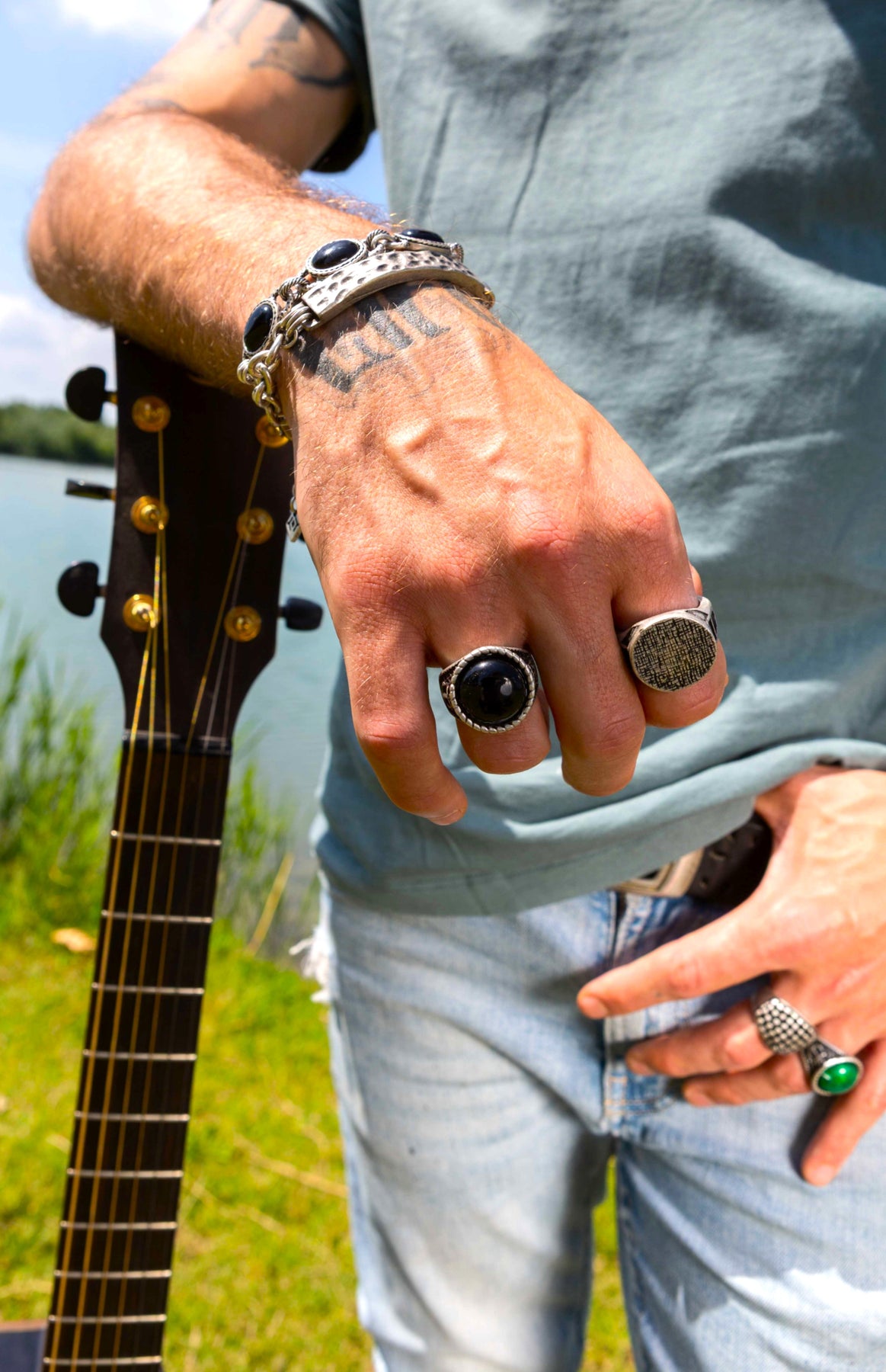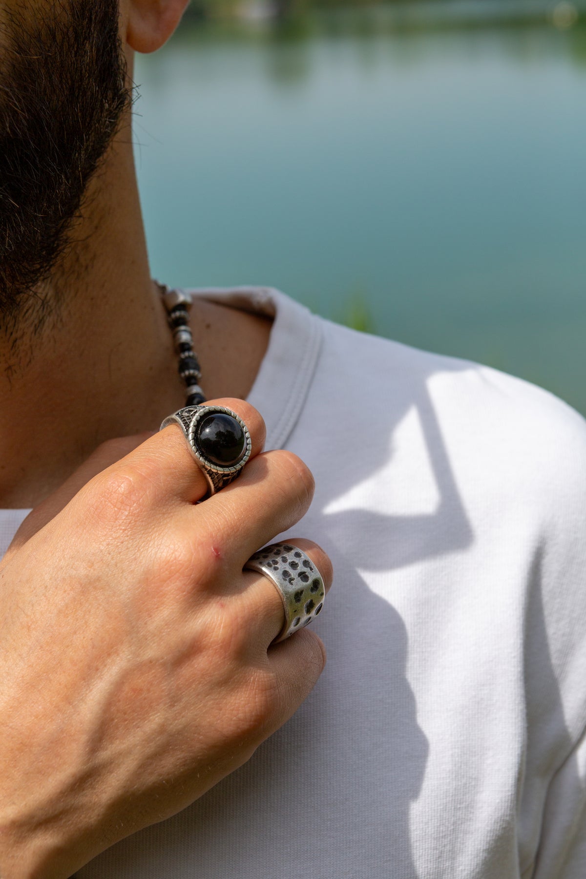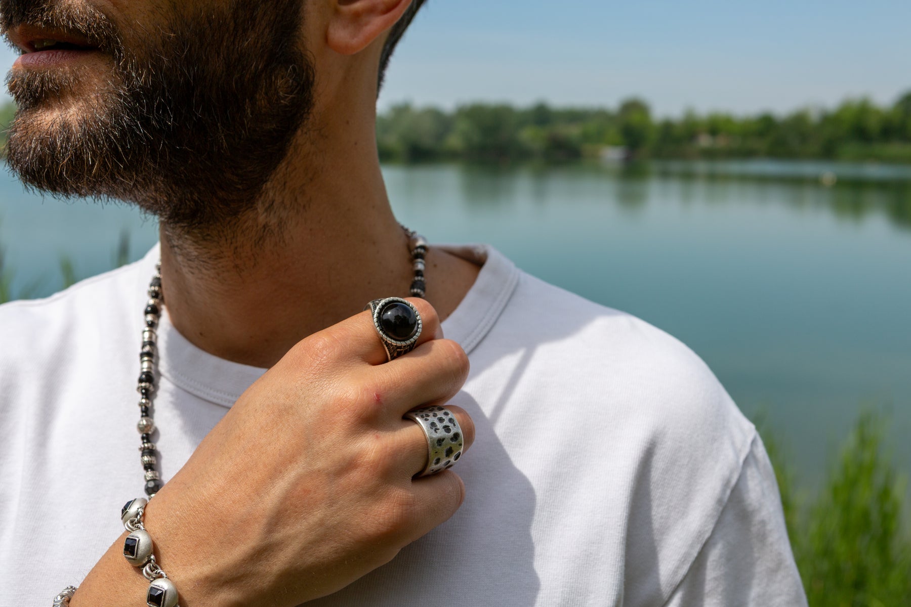 L'anello Tancredi è realizzato artigianalmente in lega seminaturale (zinco, magnesio, alluminio) rivestito in argento brunito anallergico. Al centro spicca una pietra tonda nera in 12 millimetri. L'anello Tancredi lo puoi indossare da solo o assieme ad altri gioielli Cryady. Per uomo e per donna. Ogni creazione Cryady è realizzata artigianalmente con amore e passione, proprio per questo una non sarà mai perfettamente identica all’altra come se fosse un prodotto realizzato in serie.