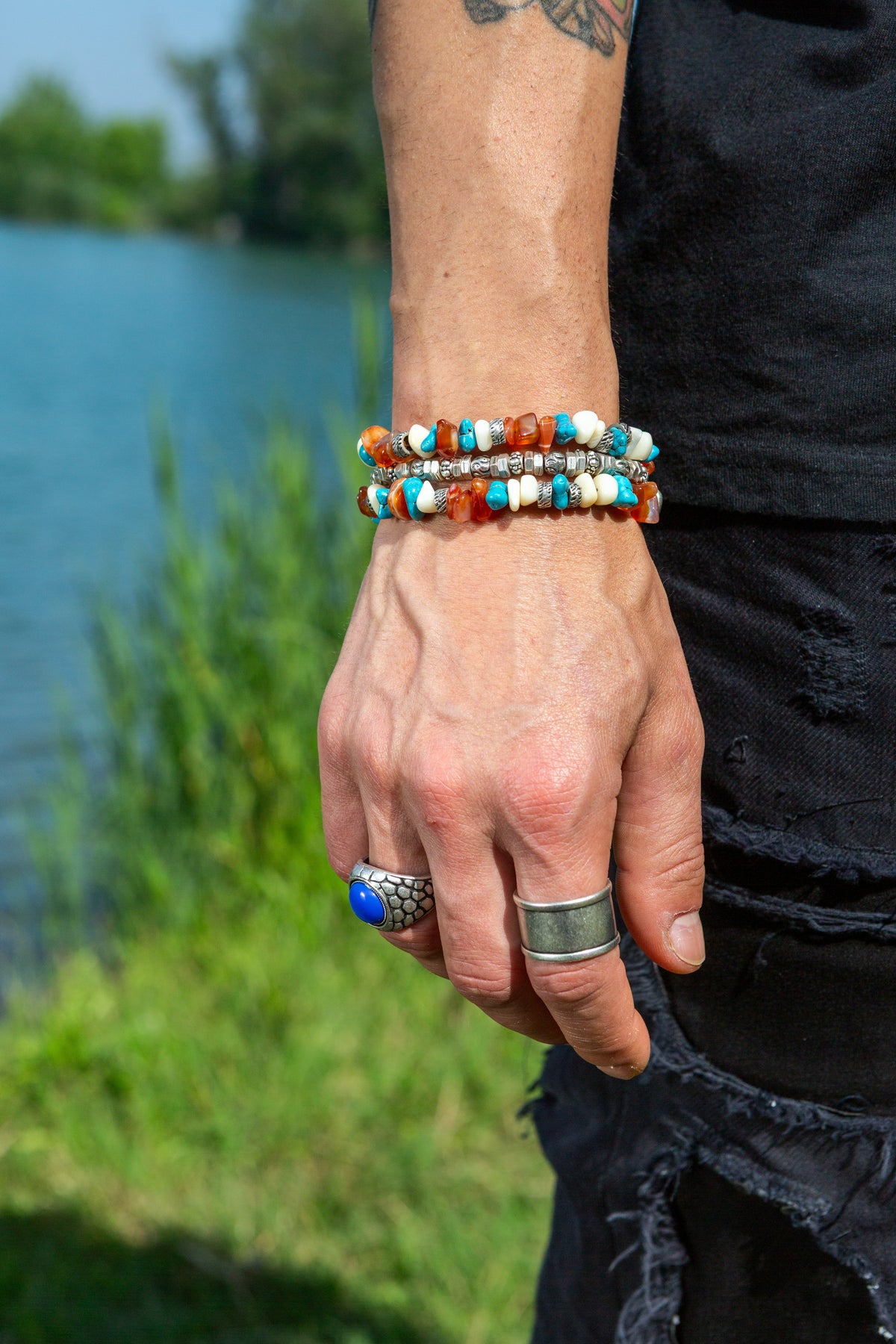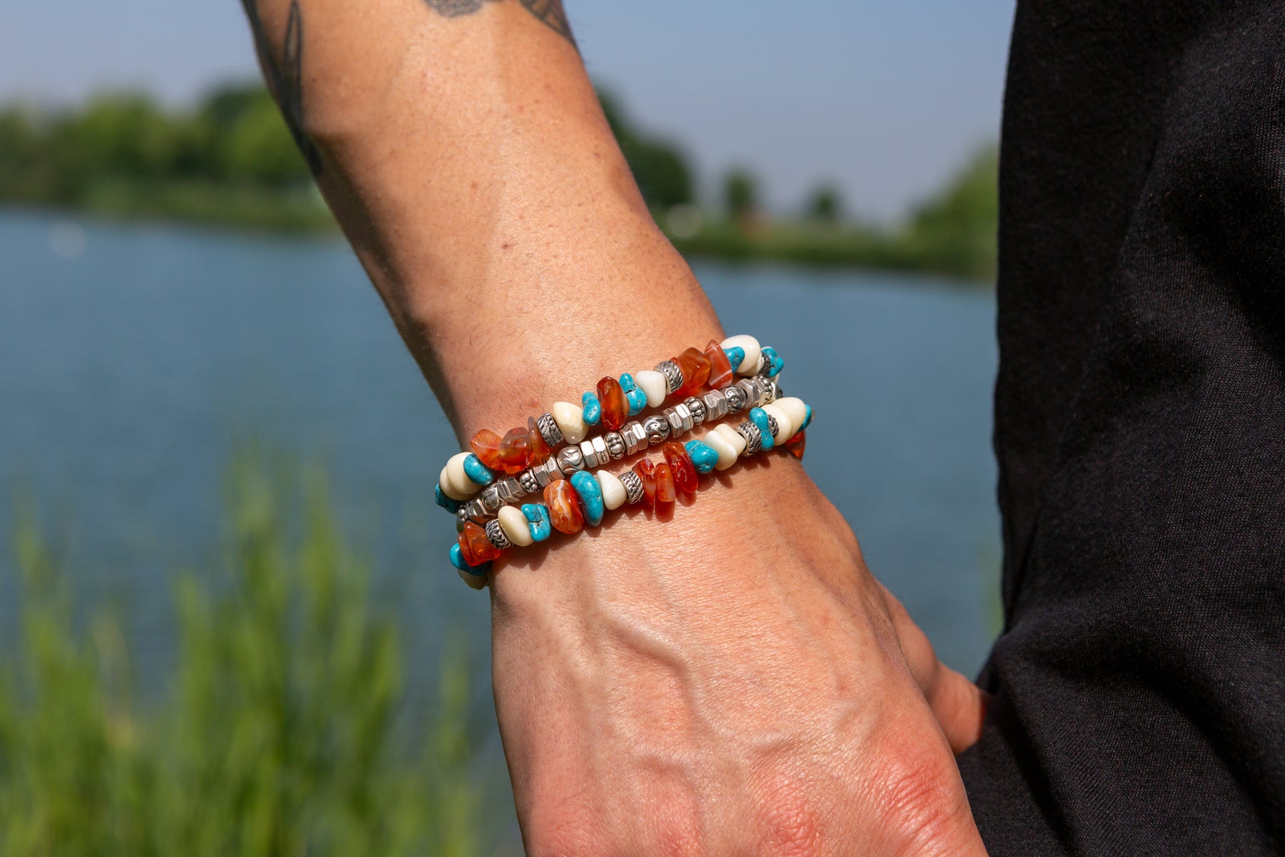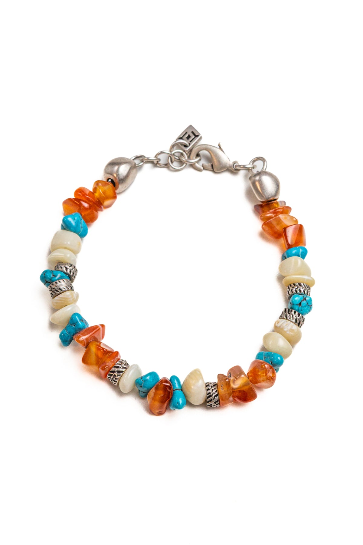 Il bracciale Balos è realizzato con corniola, corallo bianco, turchesi e componenti in  lega di zinco e alluminio rivestito in argento antico anallergico. Il bracciale Balos è unisex come tutte le altre nostre creazioni, da indossare da solo o insieme ad altri gioielli Cryady. Ogni creazione Cryady è realizzata artigianalmente con amore e passione. I materiali utilizzati sono certificati in rispetto delle normative vigenti CEE.