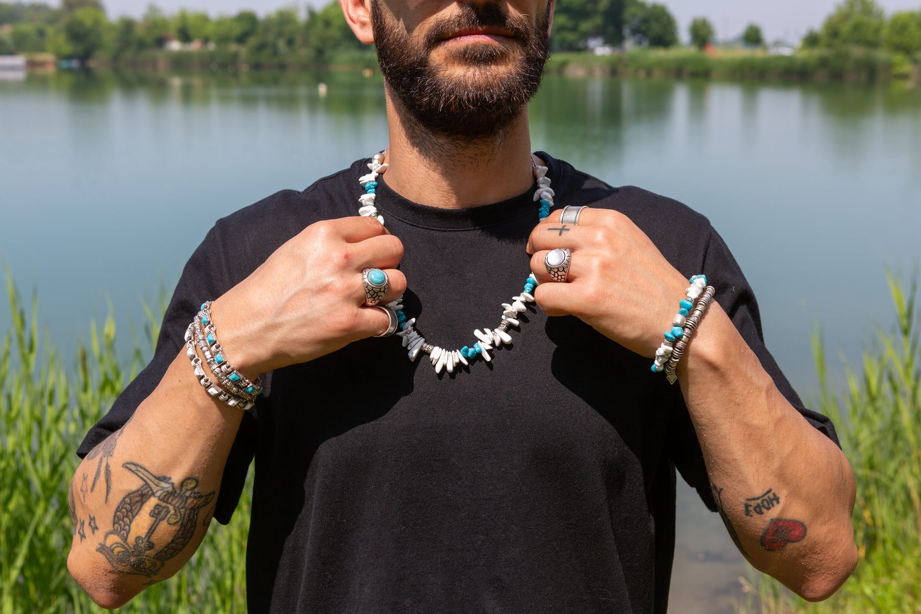 Materiale: cristallo turchese, lega di zinco e alluminio rivestito in argento brunito, ottone, cristallo.