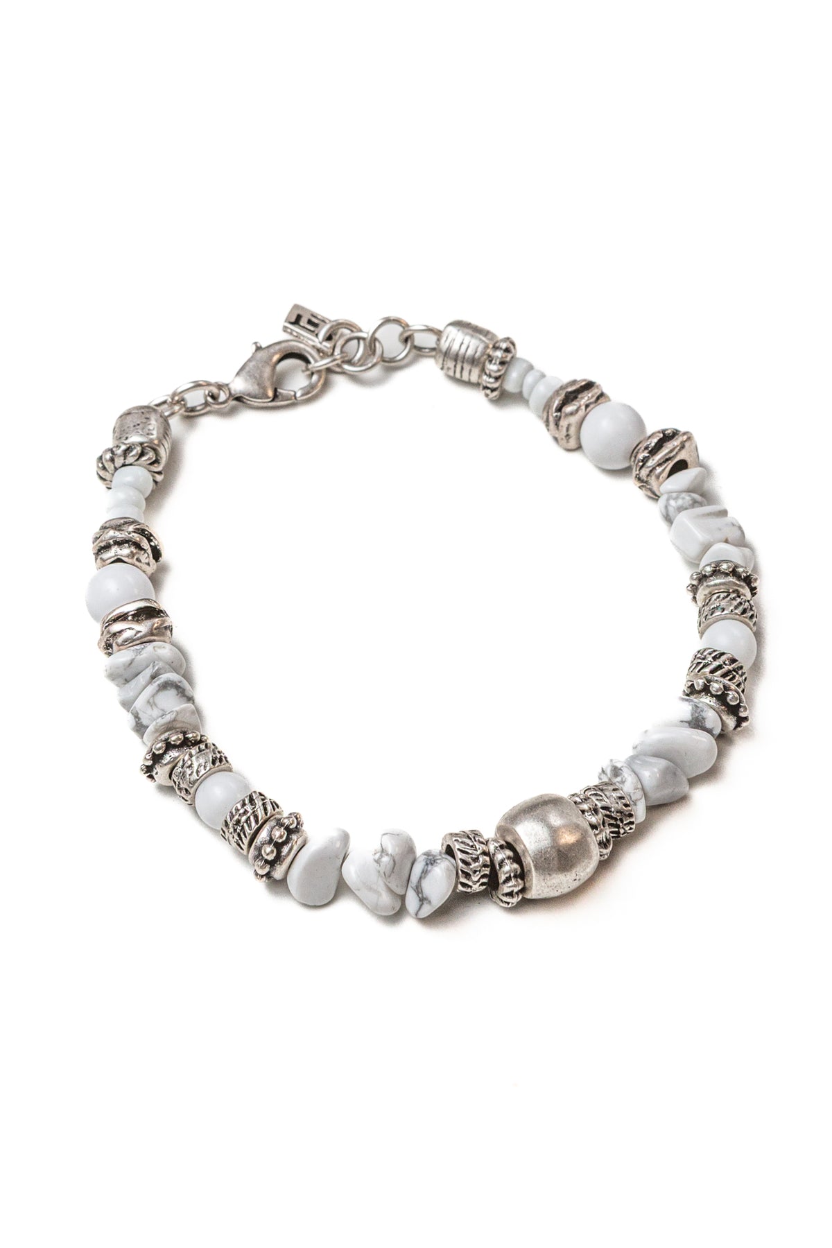 Materiale: howlite bianca, cristallo, lega di zinco e alluminio rivestito in argento brunito, ottone, cristallo.