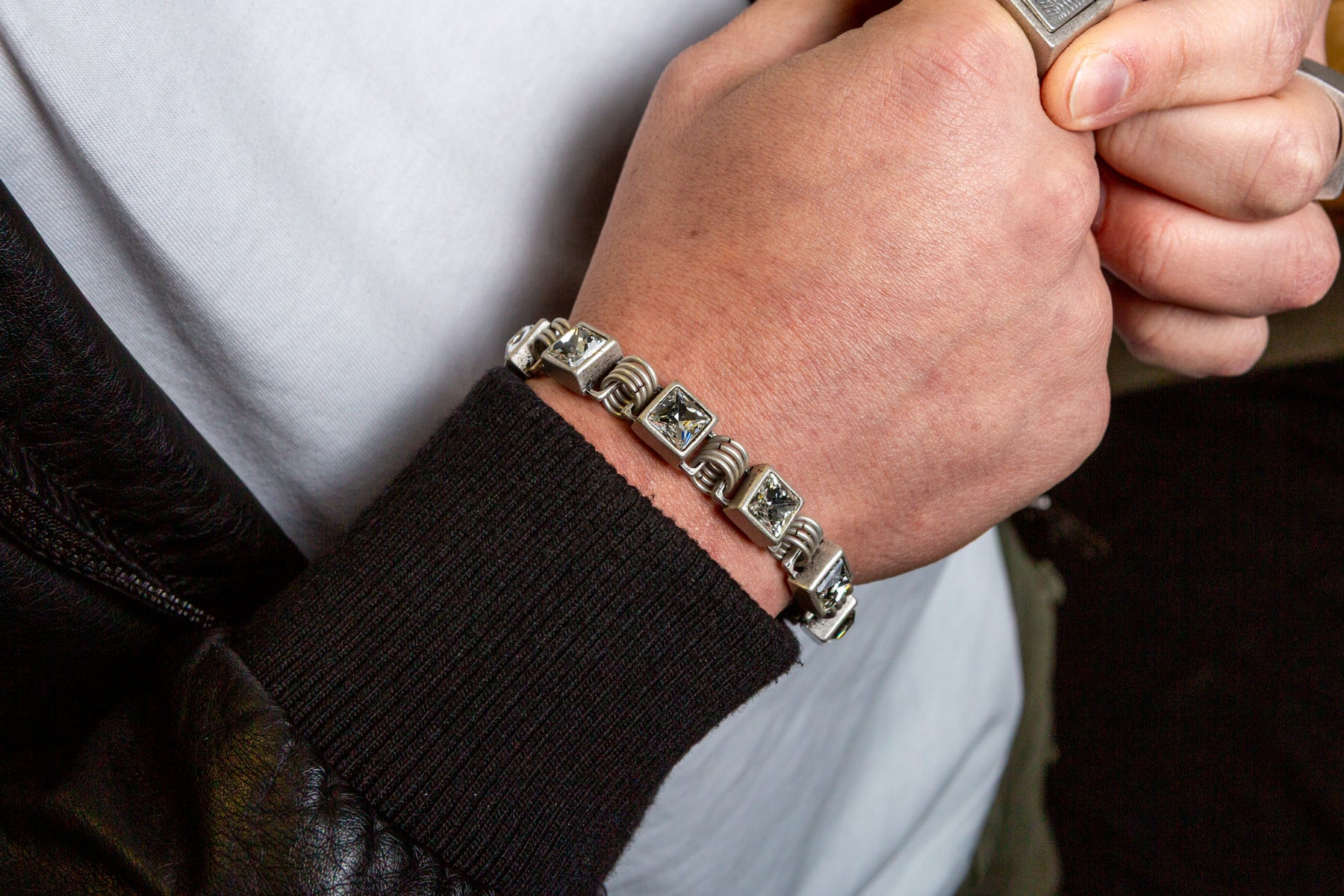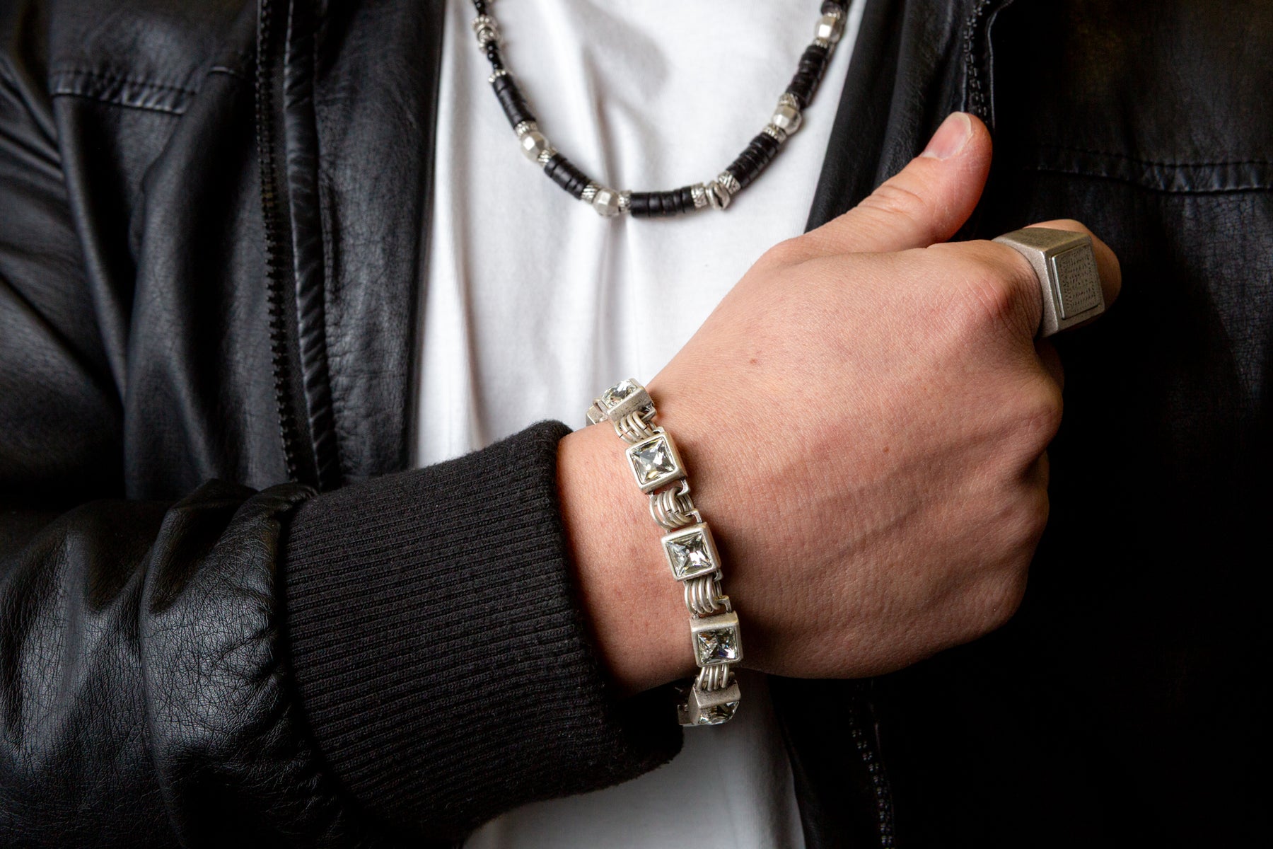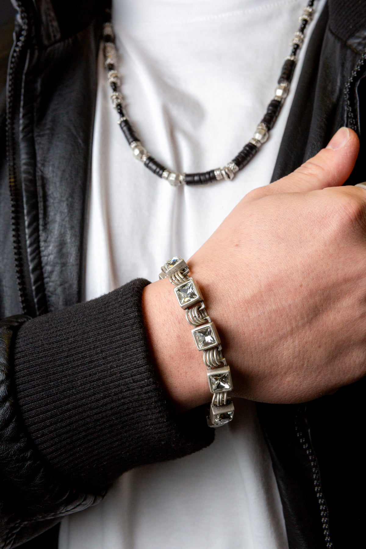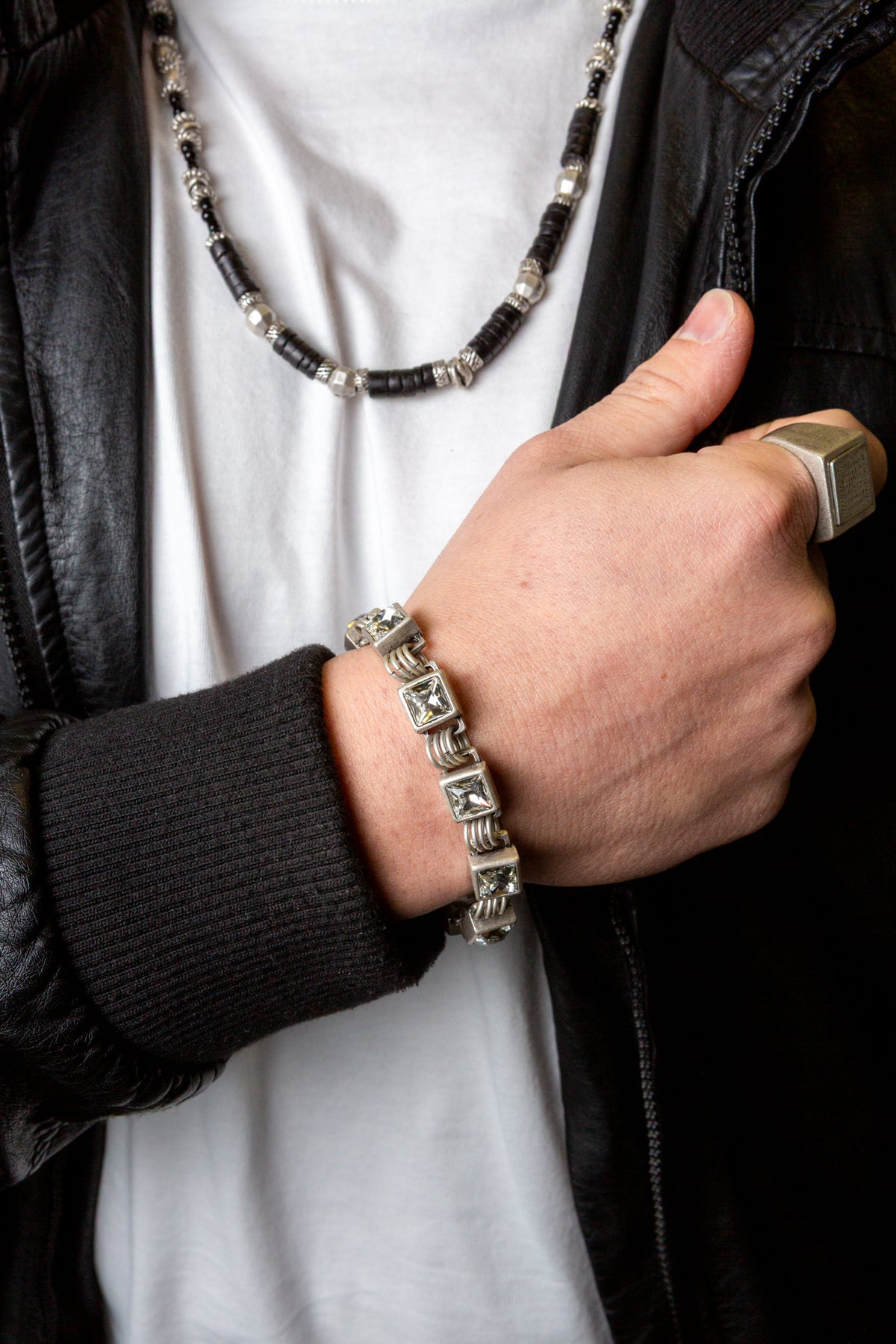 Il bracciale Eternity Cristallo deve la sua particolarità alle componenti quadrate realizzate a mano al cui centro è incastonata una pietra in cristallo quadrata sfaccettata. Il bracciale Eternity Cristallo è unisex come tutte le altre nostre creazioni, da indossare da solo o insieme ad altri gioielli Cryady. Ogni creazione Cryady è realizzata artigianalmente con amore e passione. I materiali utilizzati sono certificati in rispetto delle normative vigenti CEE.