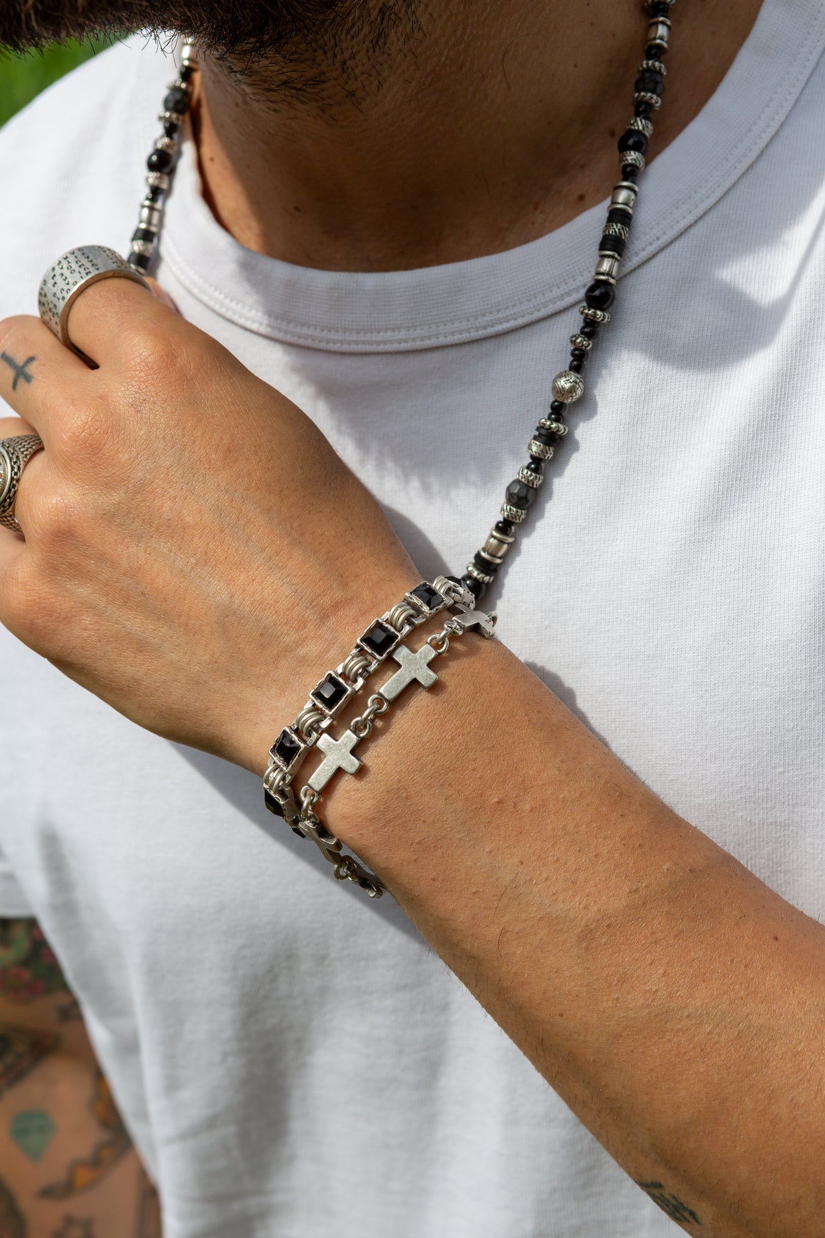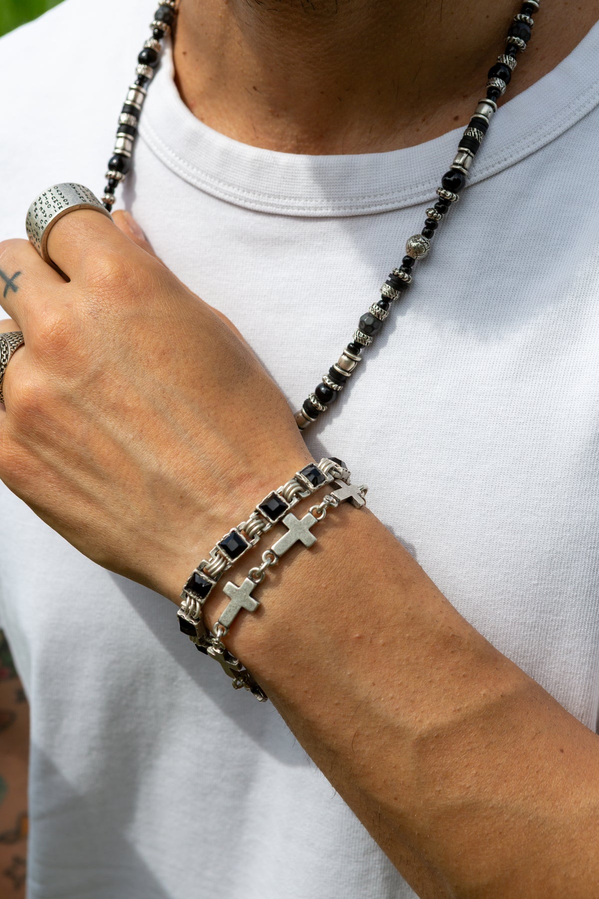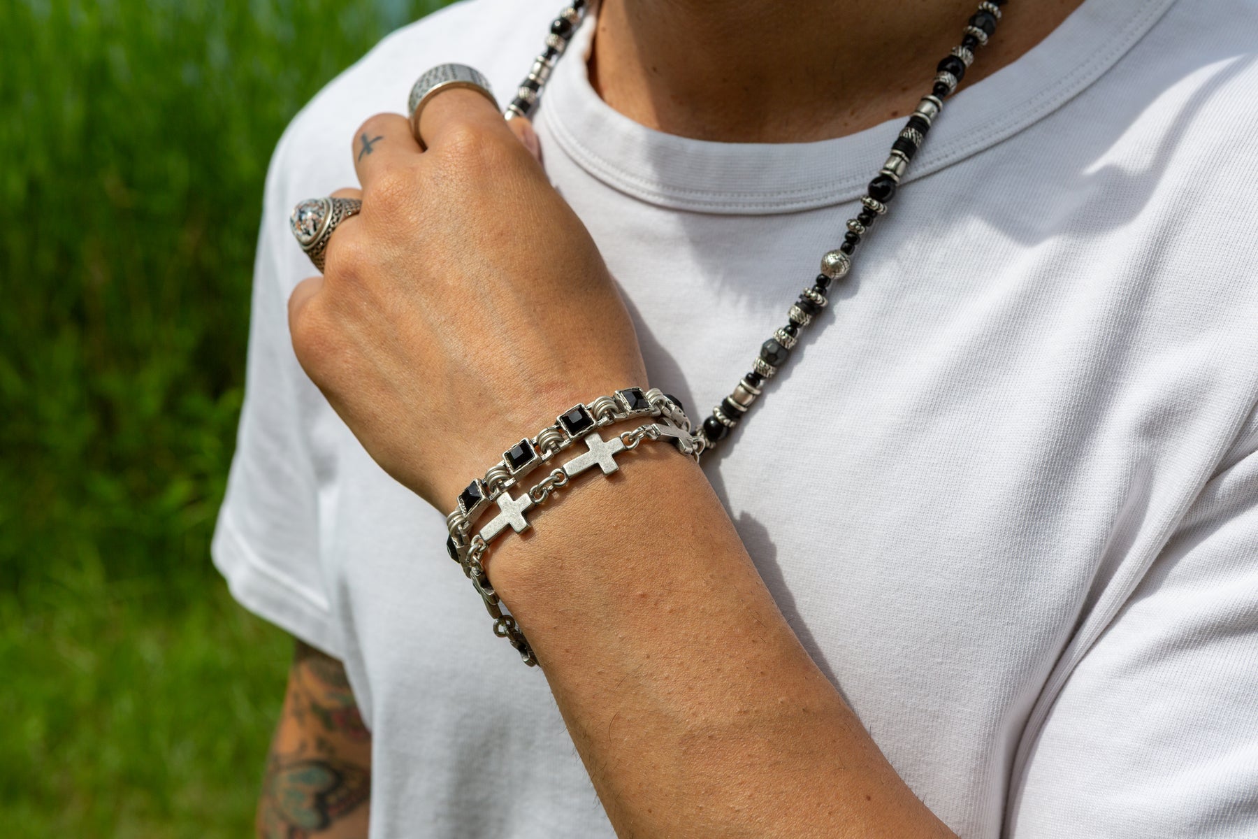Il bracciale Los Angeles deve la sua particolarità alle componenti quadrate realizzate a mano al cui centro è incastonata una pietra nera quadrata sfaccettata. Il bracciale Los Angeles è unisex come tutte le altre nostre creazioni, da indossare da solo o insieme ad altri gioielli Cryady. Ogni creazione Cryady è realizzata artigianalmente con amore e passione. I materiali utilizzati sono certificati in rispetto delle normative vigenti CEE.