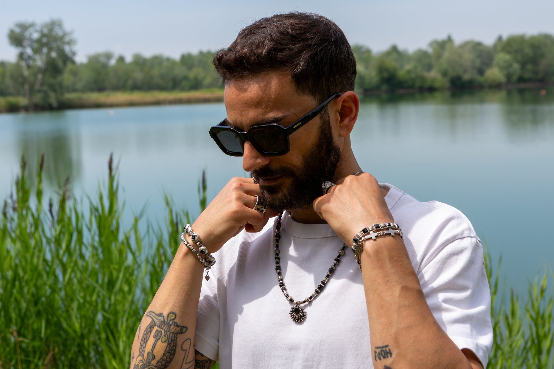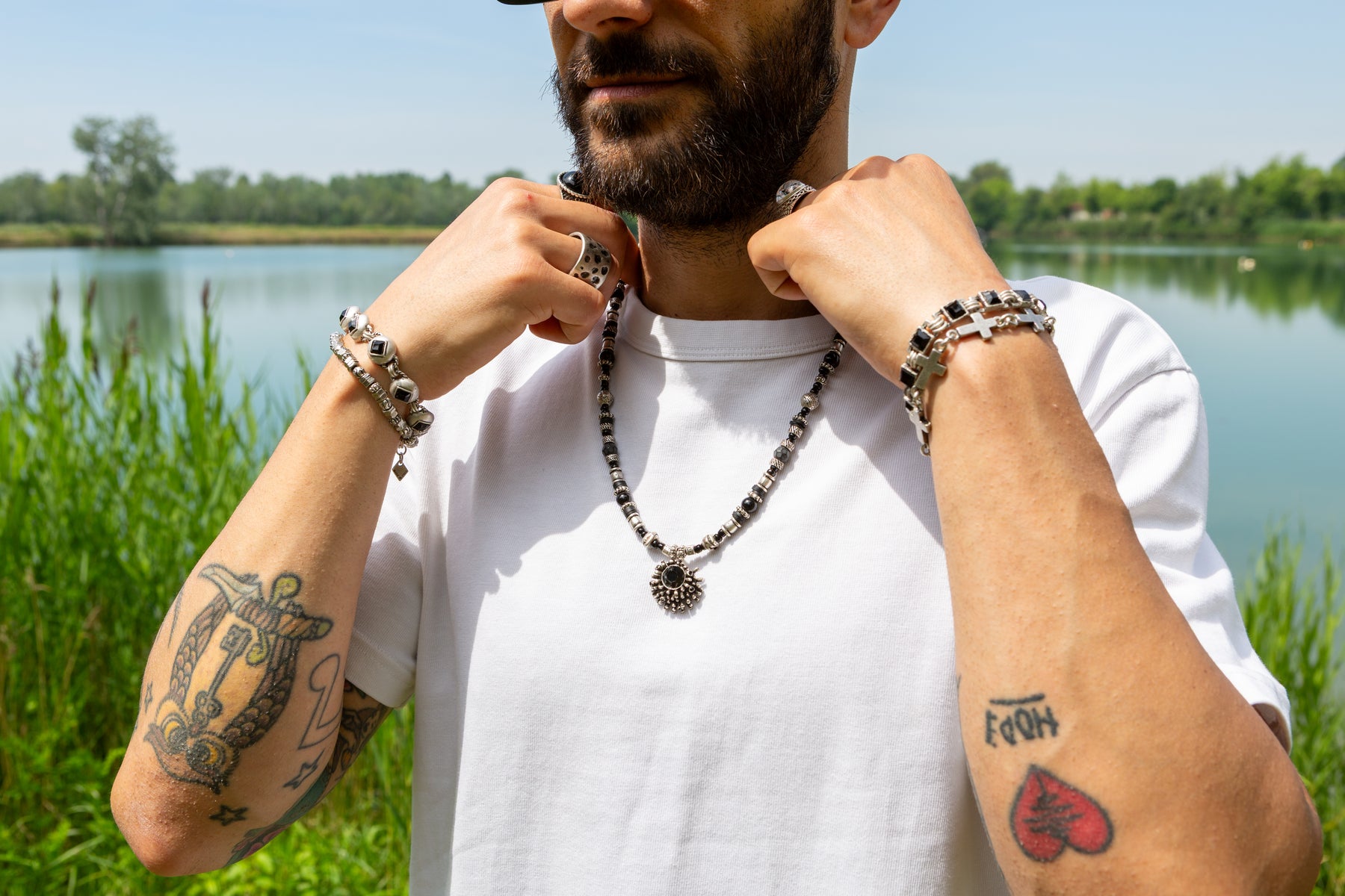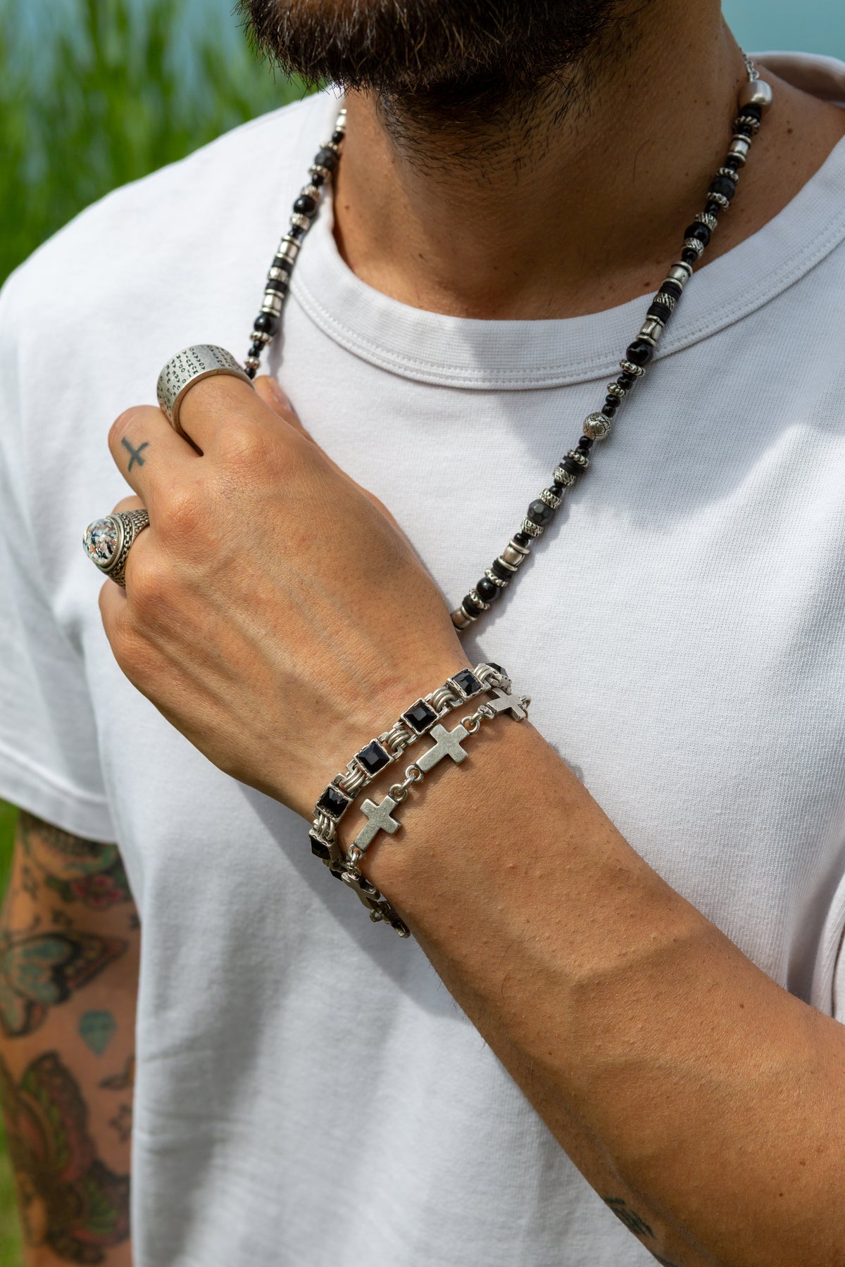 Il bracciale Los Angeles deve la sua particolarità alle componenti quadrate realizzate a mano al cui centro è incastonata una pietra nera quadrata sfaccettata. Il bracciale Los Angeles è unisex come tutte le altre nostre creazioni, da indossare da solo o insieme ad altri gioielli Cryady. Ogni creazione Cryady è realizzata artigianalmente con amore e passione. I materiali utilizzati sono certificati in rispetto delle normative vigenti CEE.