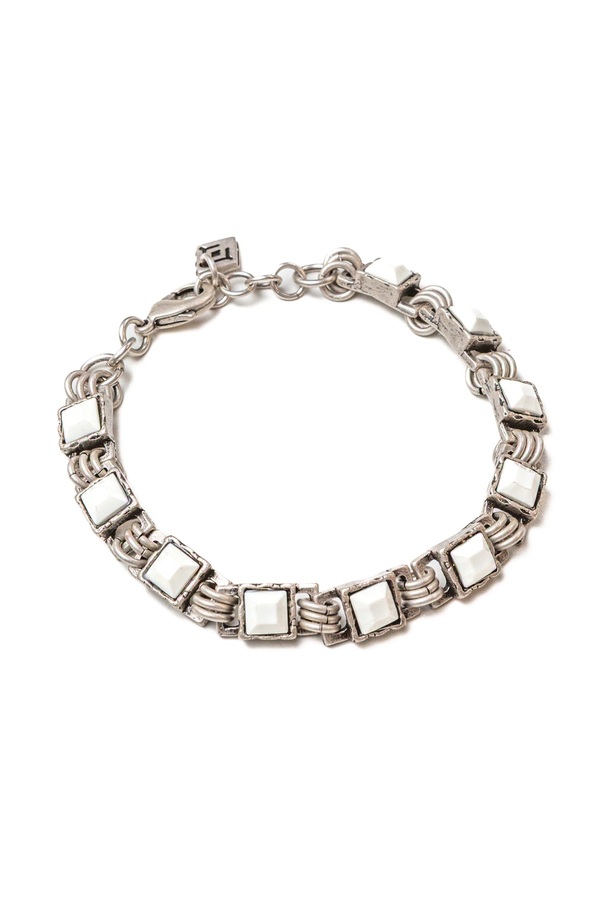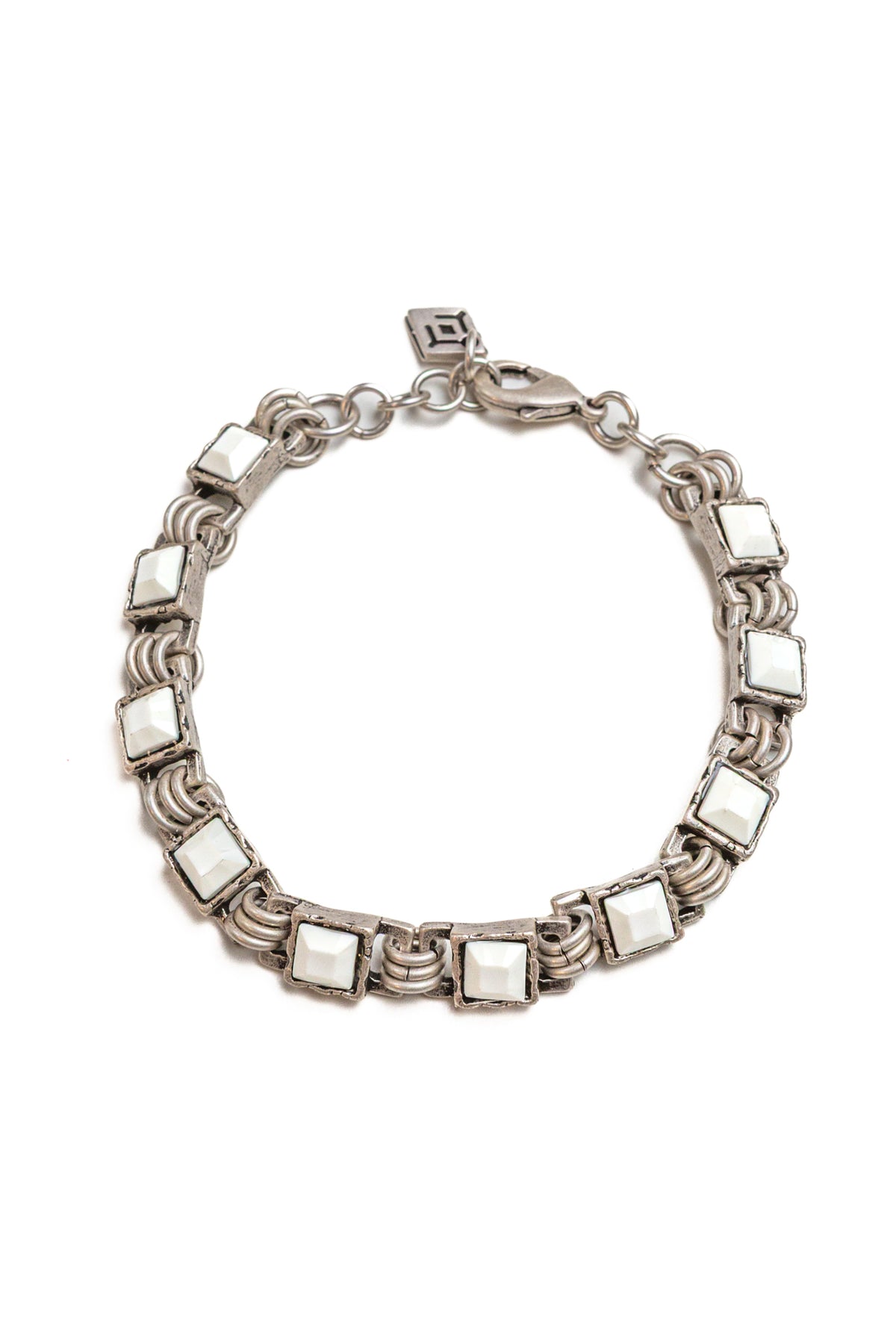Il bracciale Minorca deve la sua particolarità alle componenti quadrate realizzate a mano al cui centro è incastonata una pietra bianca quadrata sfaccettata. Il bracciale Minorca è unisex come tutte le altre nostre creazioni, da indossare da solo o insieme ad altri gioielli Cryady. Ogni creazione Cryady è realizzata artigianalmente con amore e passione. I materiali utilizzati sono certificati in rispetto delle normative vigenti CEE.