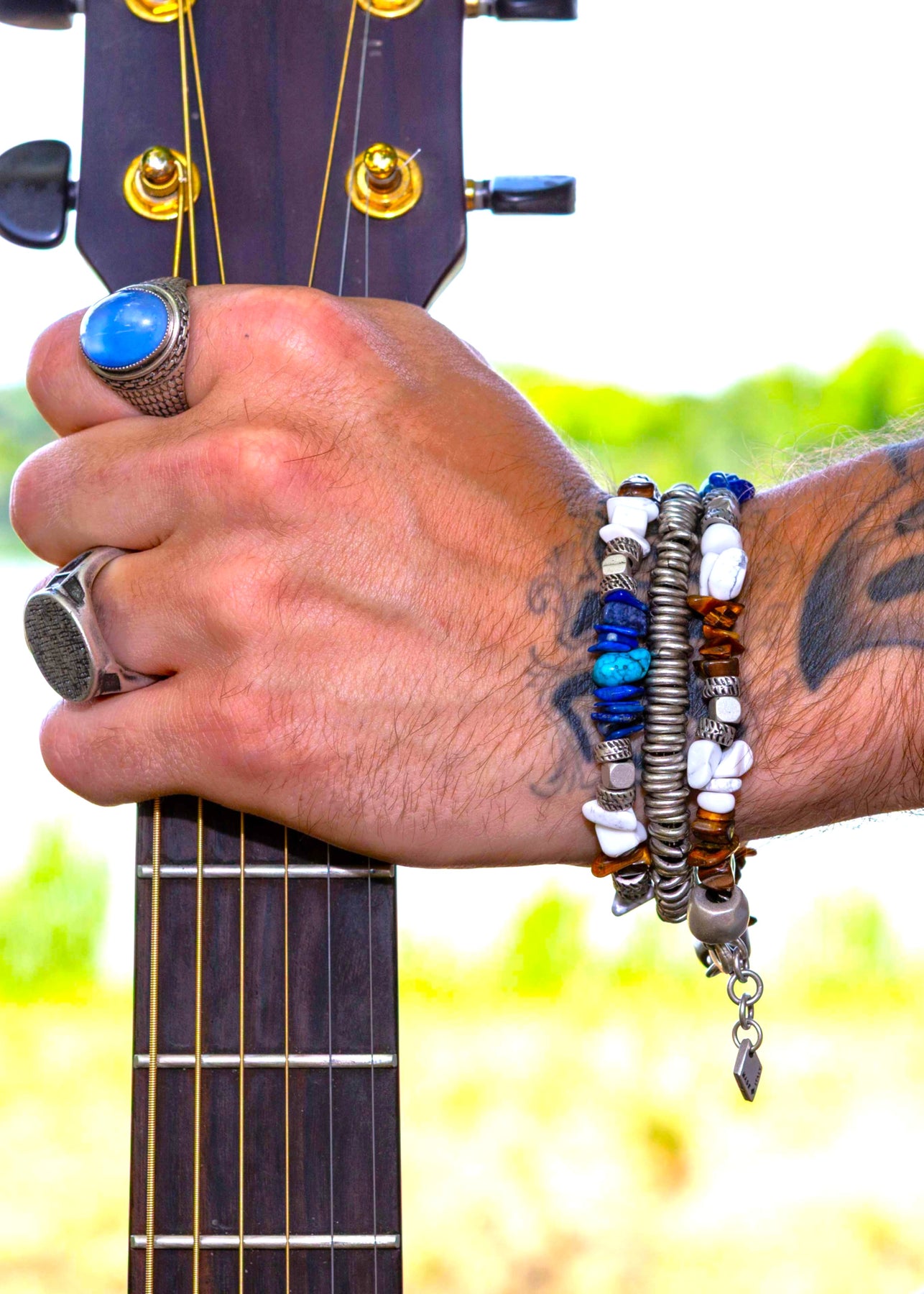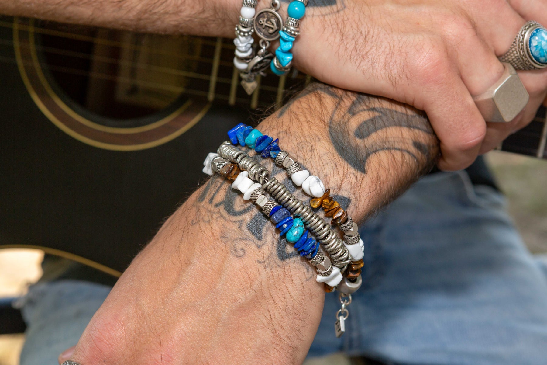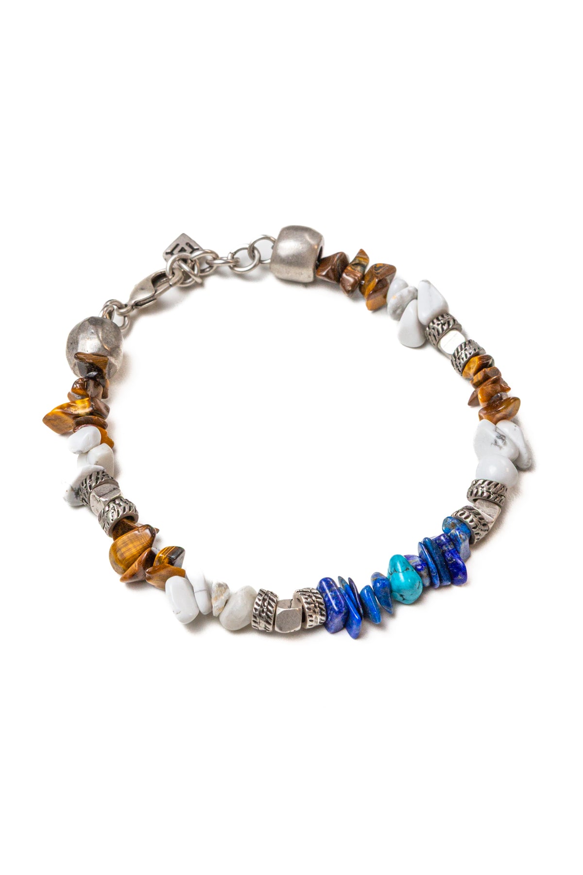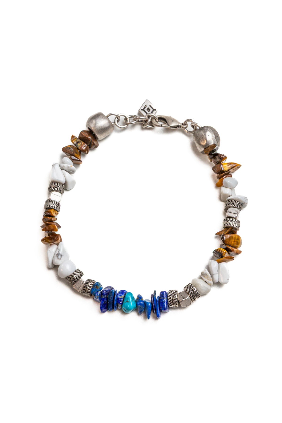 Il bracciale Mykonos è realizzato con occhio di tigre, howlite bianca, lapislazzulo blu, turchese centrale e componenti in  lega di zinco e alluminio rivestito in argento antico anallergico. Il bracciale Mykonos è unisex come tutte le altre nostre creazioni, da indossare da solo o insieme ad altri gioielli Cryady. Ogni creazione Cryady è realizzata artigianalmente con amore e passione. I materiali utilizzati sono certificati in rispetto delle normative vigenti CEE.