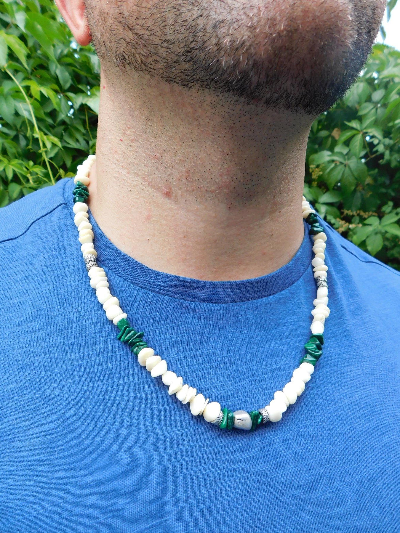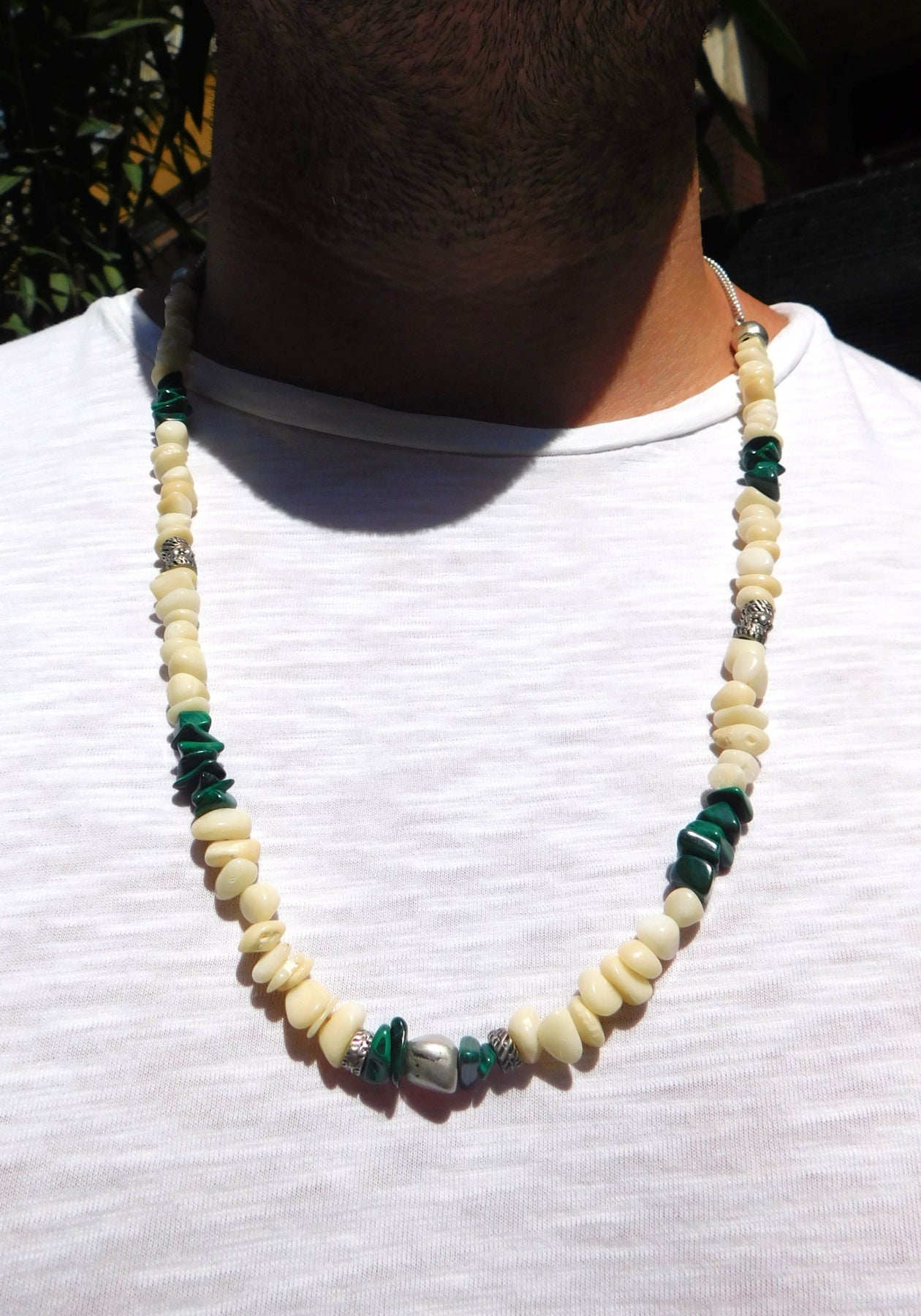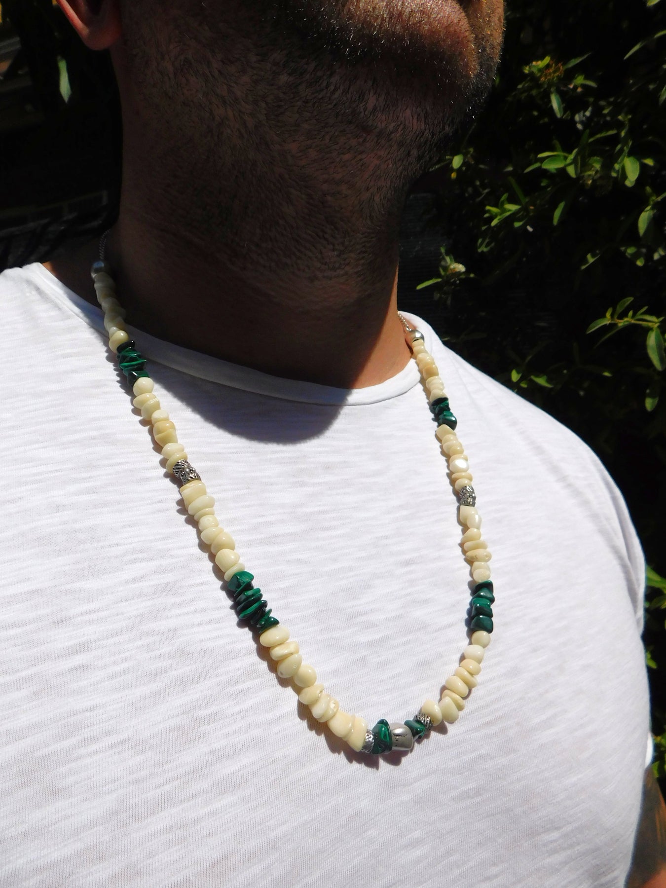 La collana Nardò è una collana realizzata con pietre naturale quali: corallo bianco e malachite verde. Il corallo bianco è spesso associato a proprietà calmanti e di protezione. La malachite è una pietra verde a cui sono attribuite diverse proprietà, tra cui: equilibrio mentale e protezione dalle energie negative. Insieme a queste pietre dure naturali sono alternate componenti in lega seminaturale (zinco, magnesio, alluminio) rivestite in argento brunito anallergico. La collana Nardò la puoi indossare da sola o assieme ad altri gioielli Cryady. Per uomo e per donna. Ogni creazione Cryady è realizzata artigianalmente con amore e passione, proprio per questo una non sarà mai perfettamente identica all’altra come se fosse un prodotto realizzato in serie.