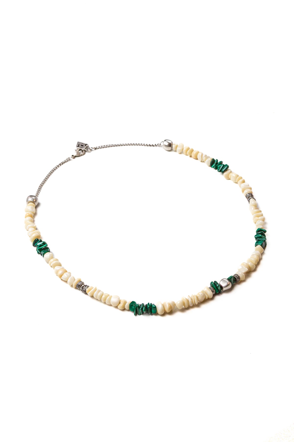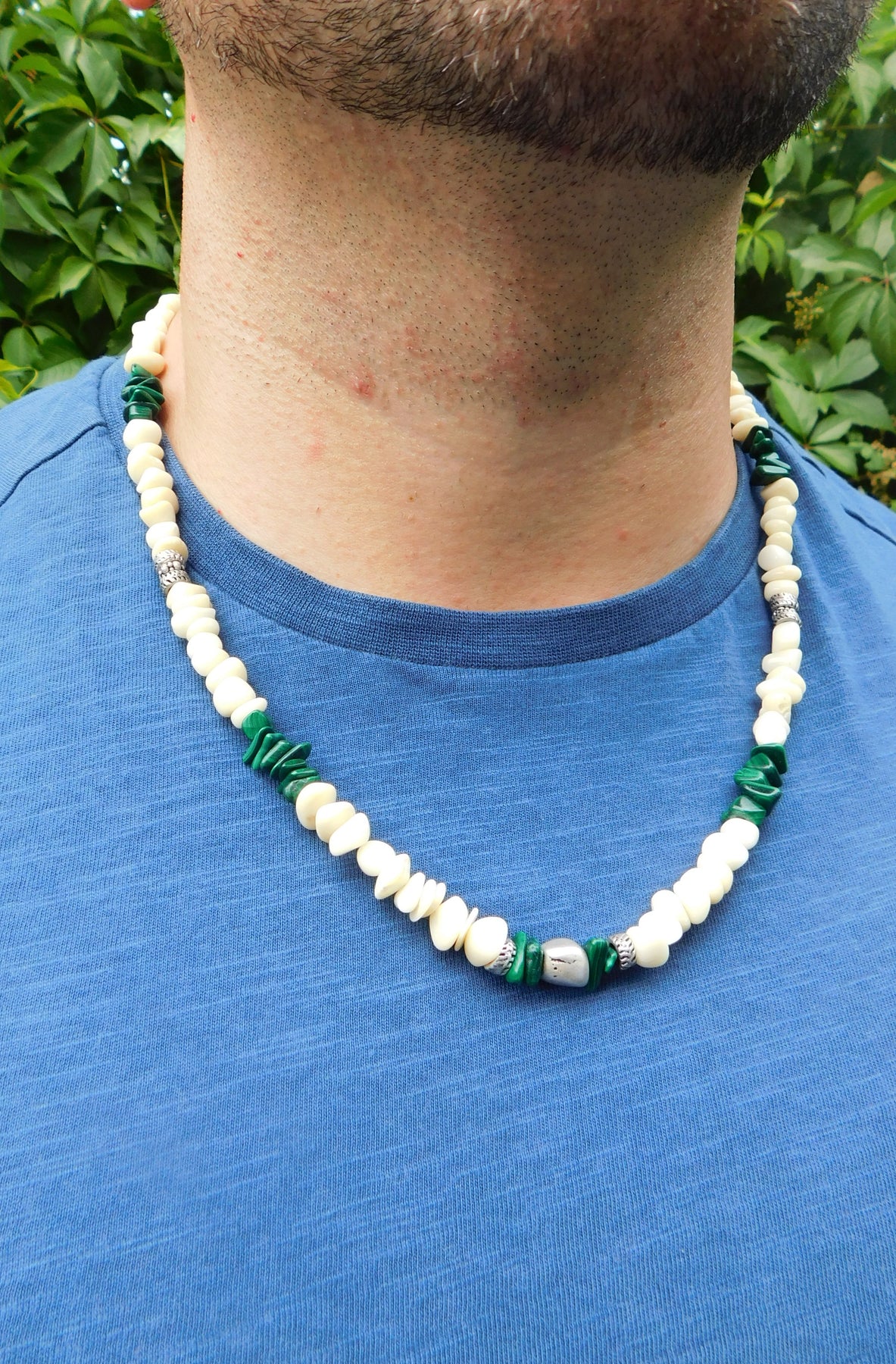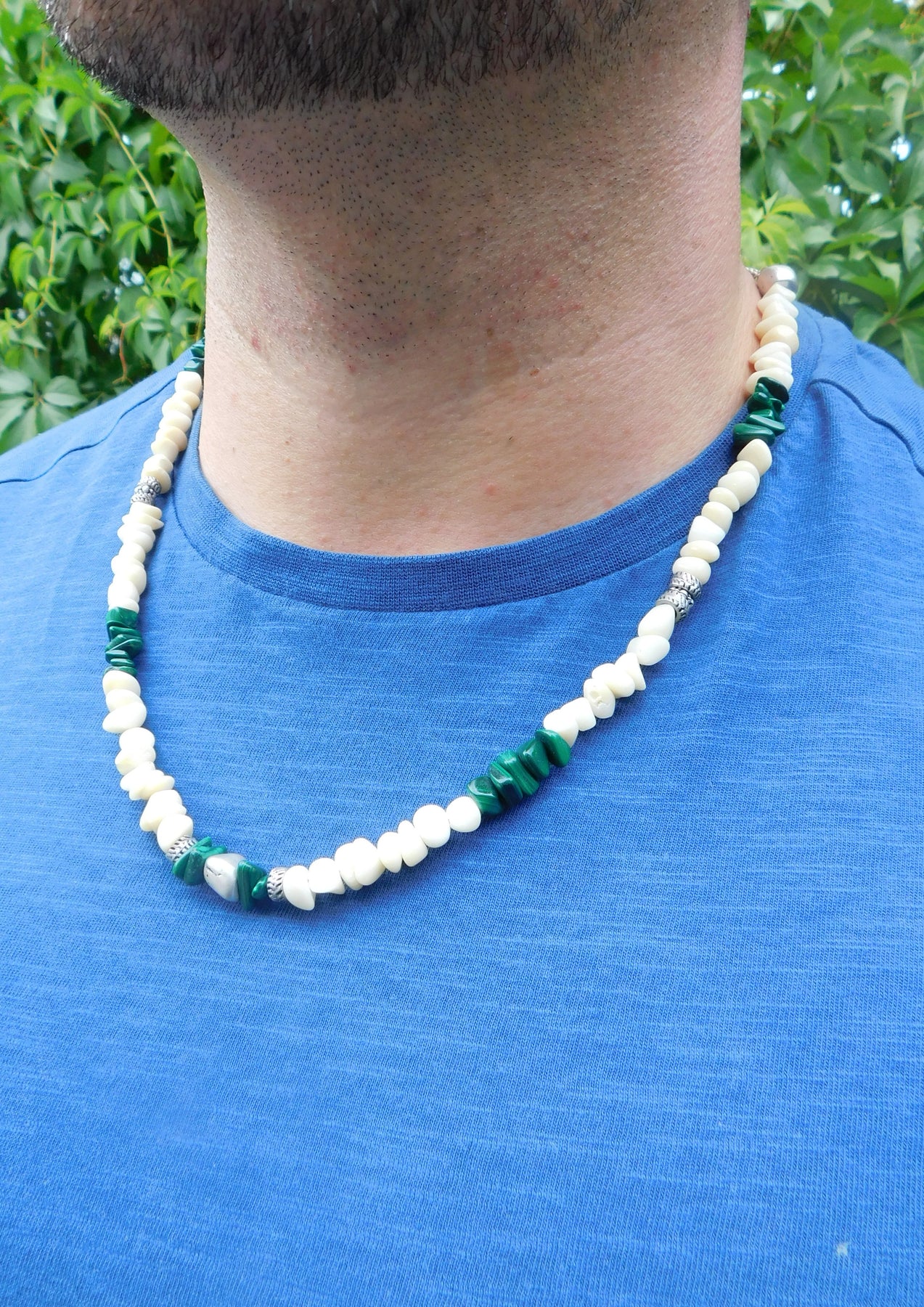 La collana Nardò è una collana realizzata con pietre naturale quali: corallo bianco e malachite verde. Il corallo bianco è spesso associato a proprietà calmanti e di protezione. La malachite è una pietra verde a cui sono attribuite diverse proprietà, tra cui: equilibrio mentale e protezione dalle energie negative. Insieme a queste pietre dure naturali sono alternate componenti in lega seminaturale (zinco, magnesio, alluminio) rivestite in argento brunito anallergico. La collana Nardò la puoi indossare da sola o assieme ad altri gioielli Cryady. Per uomo e per donna. Ogni creazione Cryady è realizzata artigianalmente con amore e passione, proprio per questo una non sarà mai perfettamente identica all’altra come se fosse un prodotto realizzato in serie.