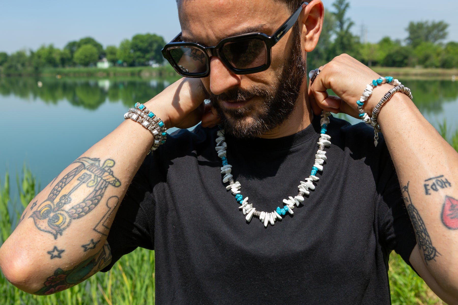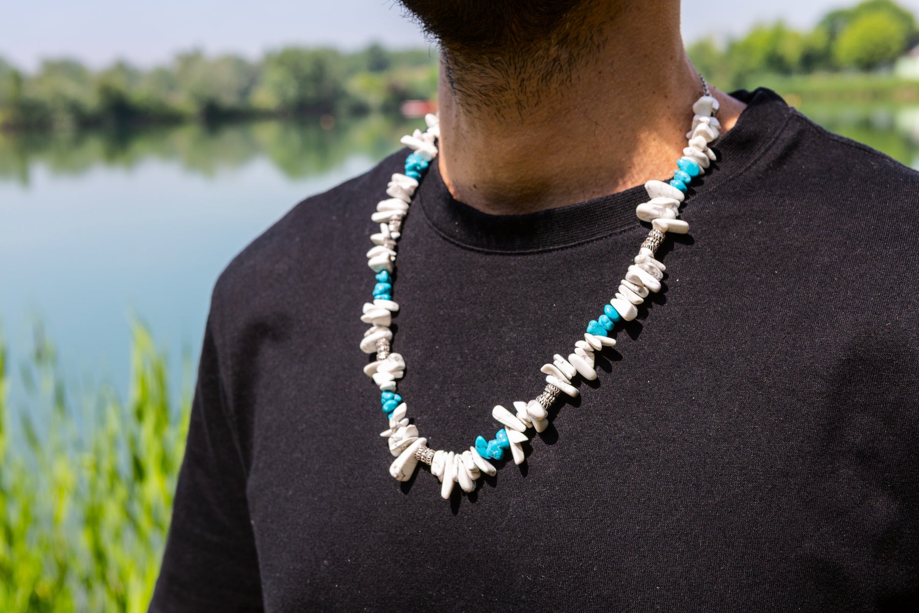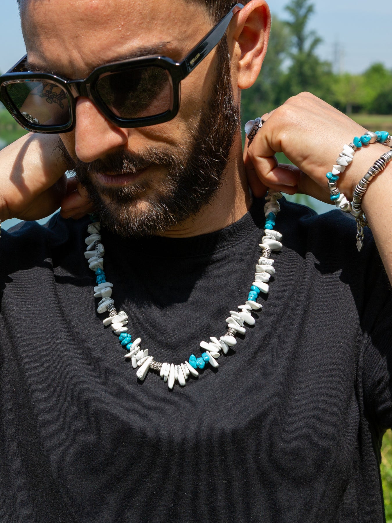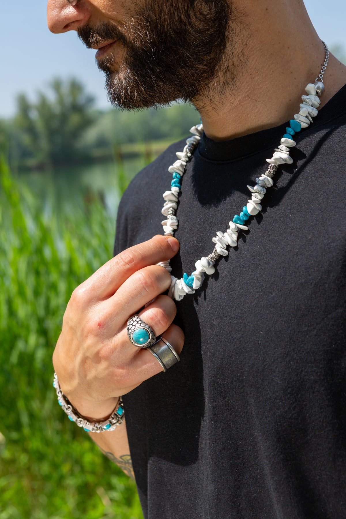 La collana Tremiti è una collana realizzata con pietre naturale in turchese bianco e turchese azzurro. Entrambi sono associati a proprietà di protezione, calma, serenità e comunicazione. Insieme a queste pietre dure naturali sono alternate componenti in lega seminaturale (zinco, magnesio, alluminio) rivestite in argento brunito anallergico. La collana Tremiti la puoi indossare da sola o assieme ad altri gioielli Cryady. Per uomo e per donna. Ogni creazione Cryady è realizzata artigianalmente con amore e passione, proprio per questo una non sarà mai perfettamente identica all’altra come se fosse un prodotto realizzato in serie.
