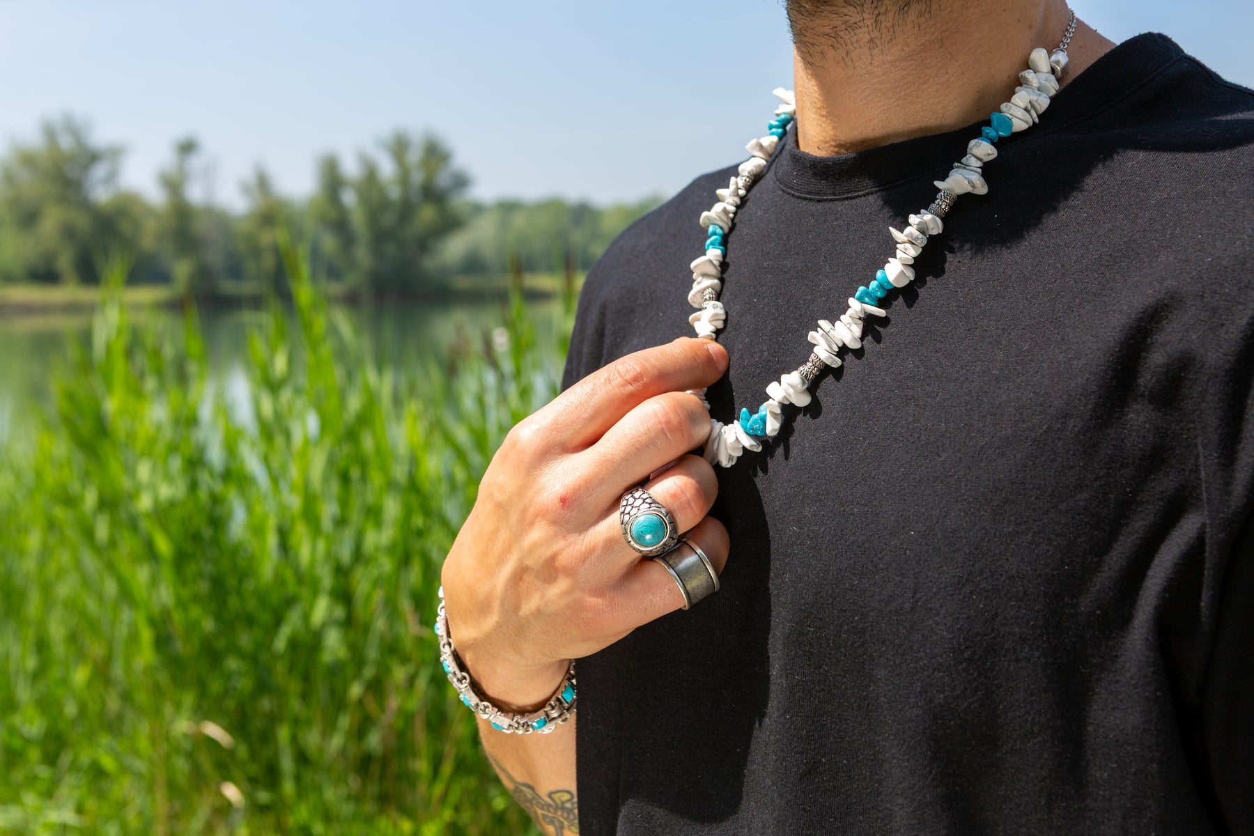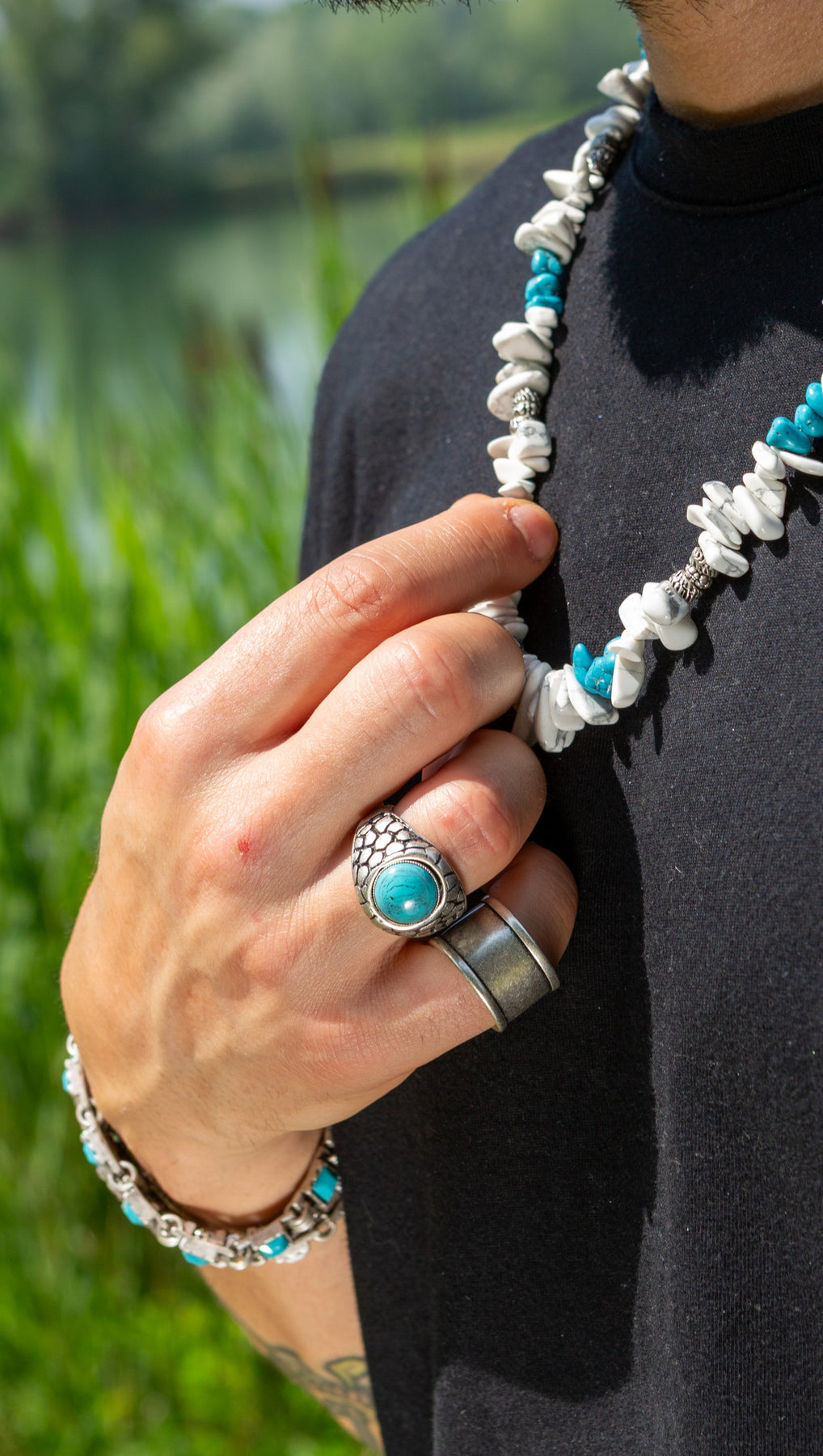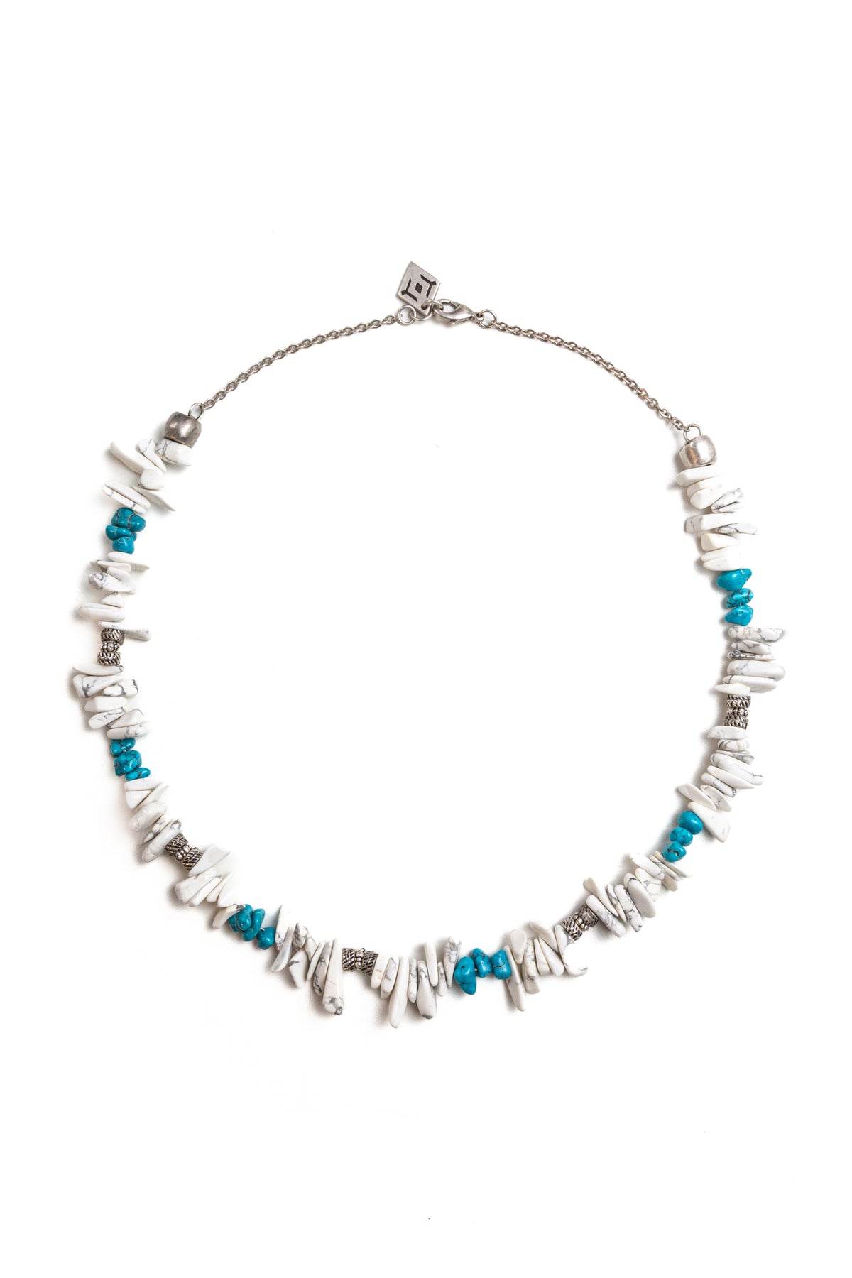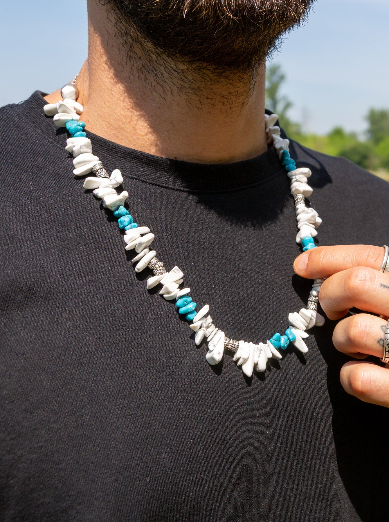 La collana Tremiti è una collana realizzata con pietre naturale in turchese bianco e turchese azzurro. Entrambi sono associati a proprietà di protezione, calma, serenità e comunicazione. Insieme a queste pietre dure naturali sono alternate componenti in lega seminaturale (zinco, magnesio, alluminio) rivestite in argento brunito anallergico. La collana Tremiti la puoi indossare da sola o assieme ad altri gioielli Cryady. Per uomo e per donna. Ogni creazione Cryady è realizzata artigianalmente con amore e passione, proprio per questo una non sarà mai perfettamente identica all’altra come se fosse un prodotto realizzato in serie.