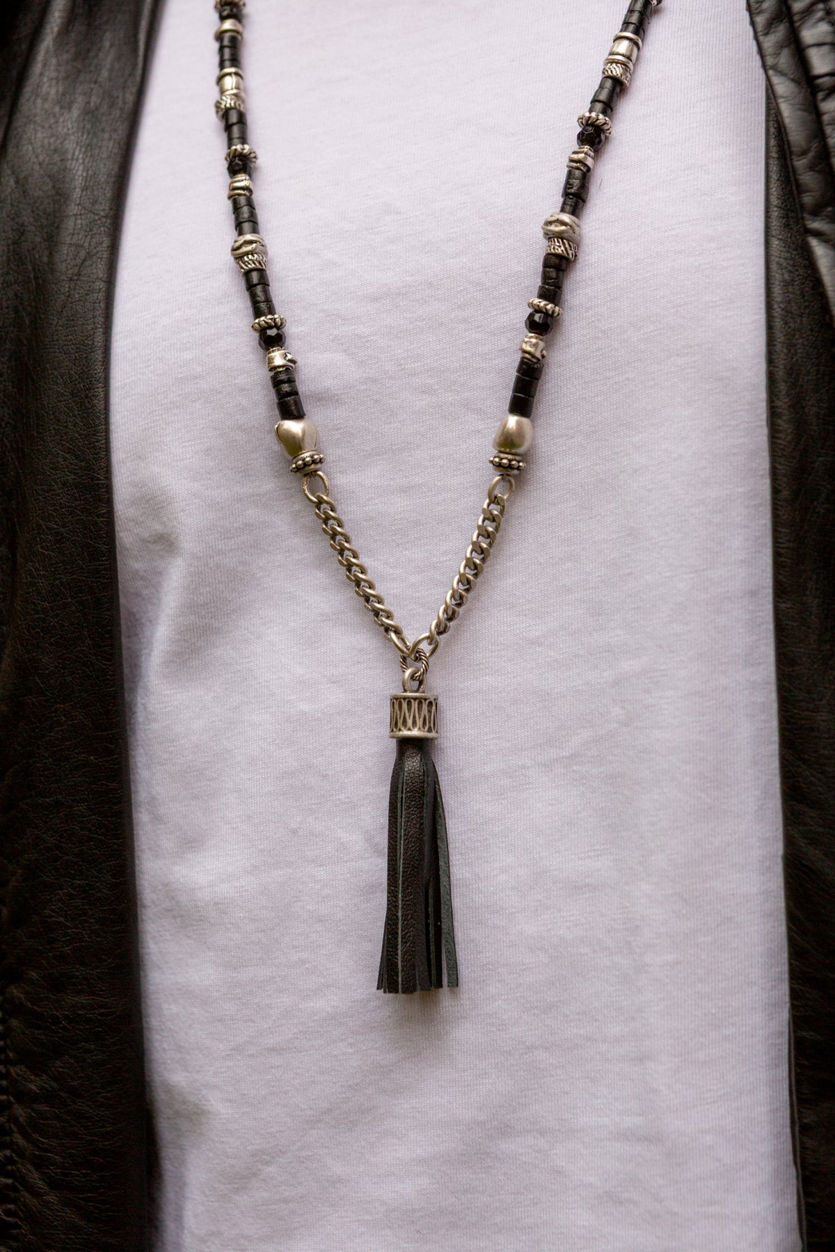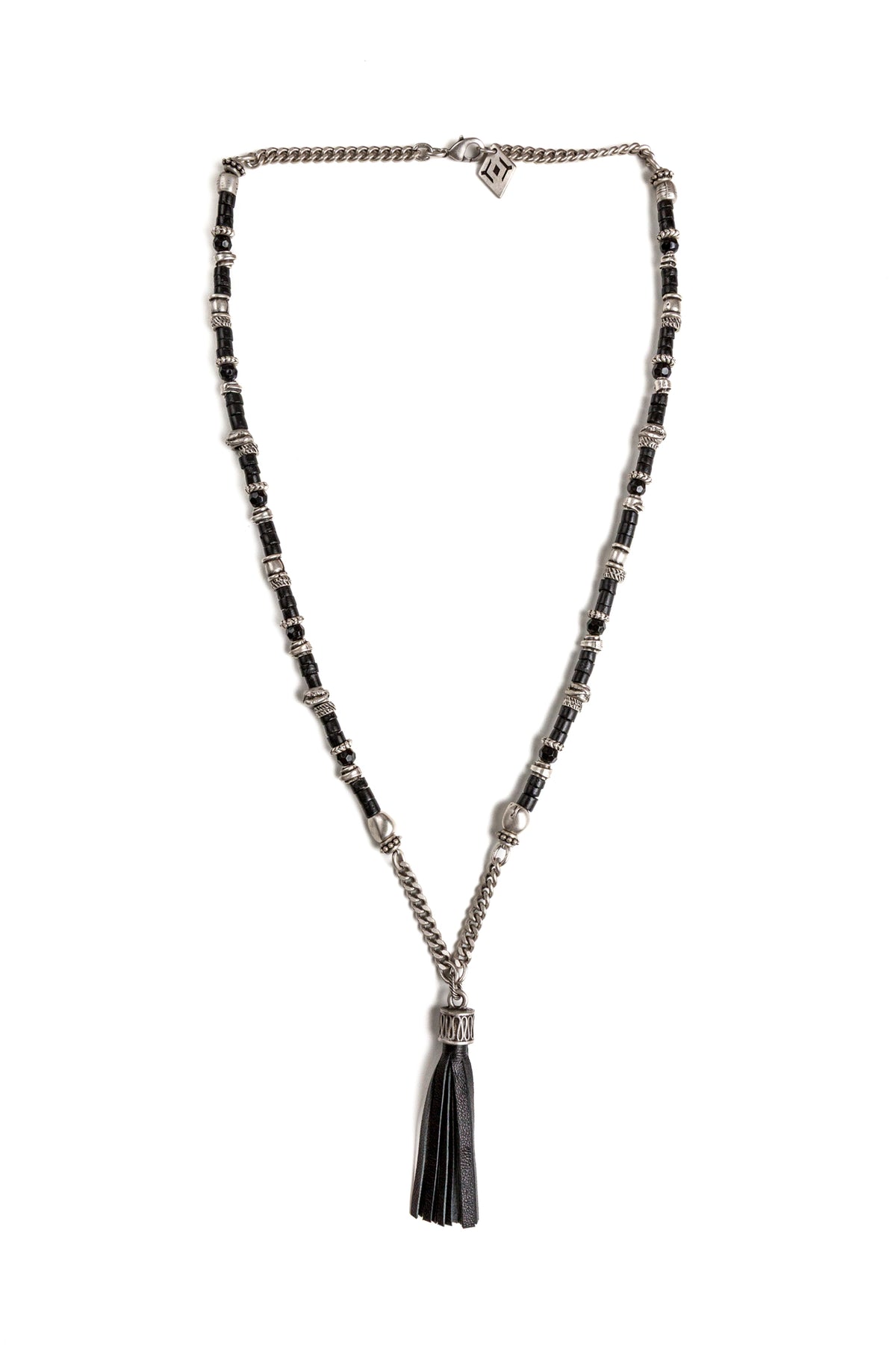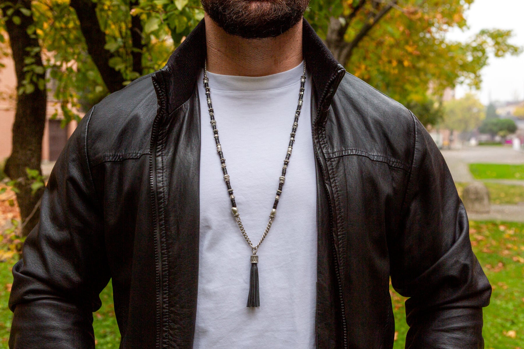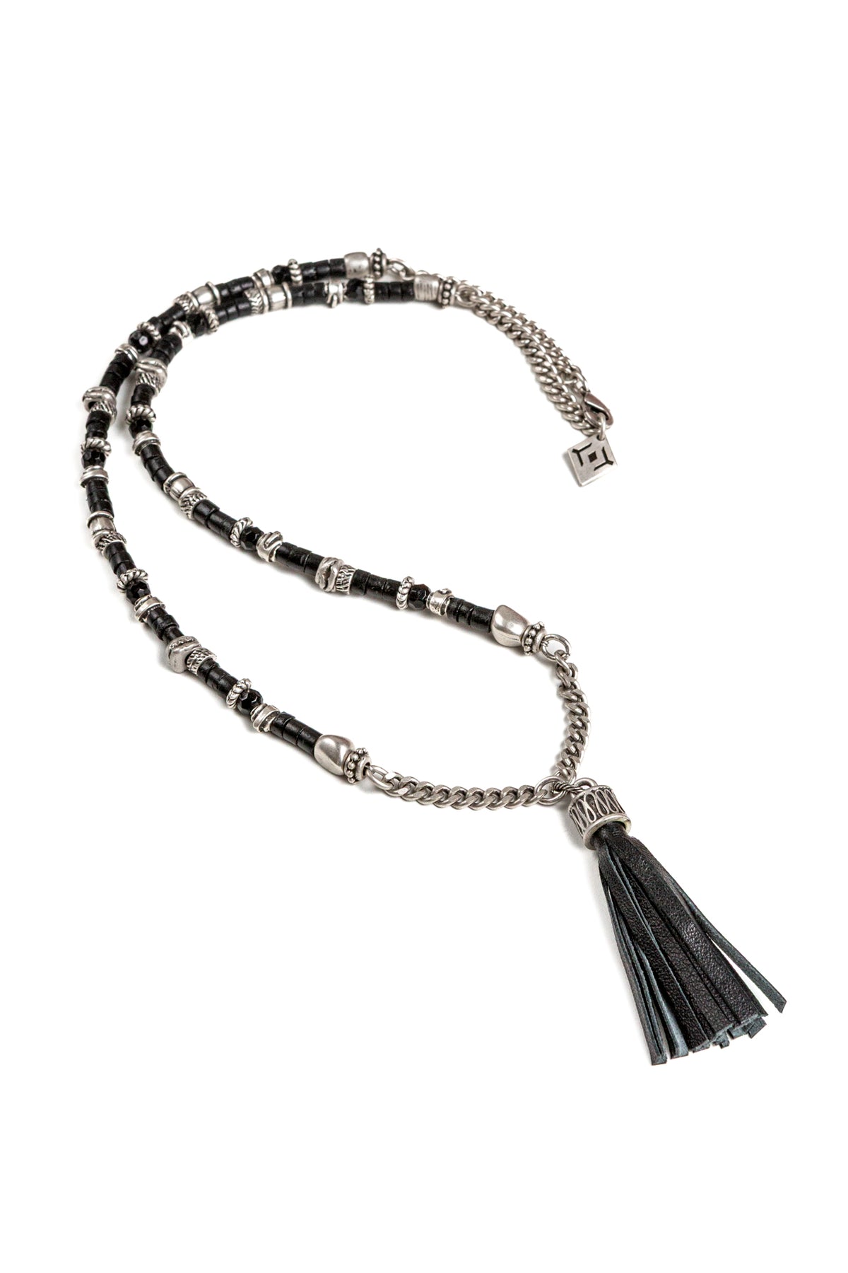 "Urban" è una collana realizzata con componenti in lega seminaturale (zinco, alluminio) e ottone. Il rivestimento è in argento brunito anallergico. La collana Urban ha elementi in metallo alternati a rondelle in legno nero e piccoli cristalli neri. Al centro una nappa in cuoio nero. La collana Urban la puoi indossare da sola o assieme ad altri gioielli Cryady. Per uomo e per donna. Ogni creazione Cryady è realizzata artigianalmente con dedizione e passione.