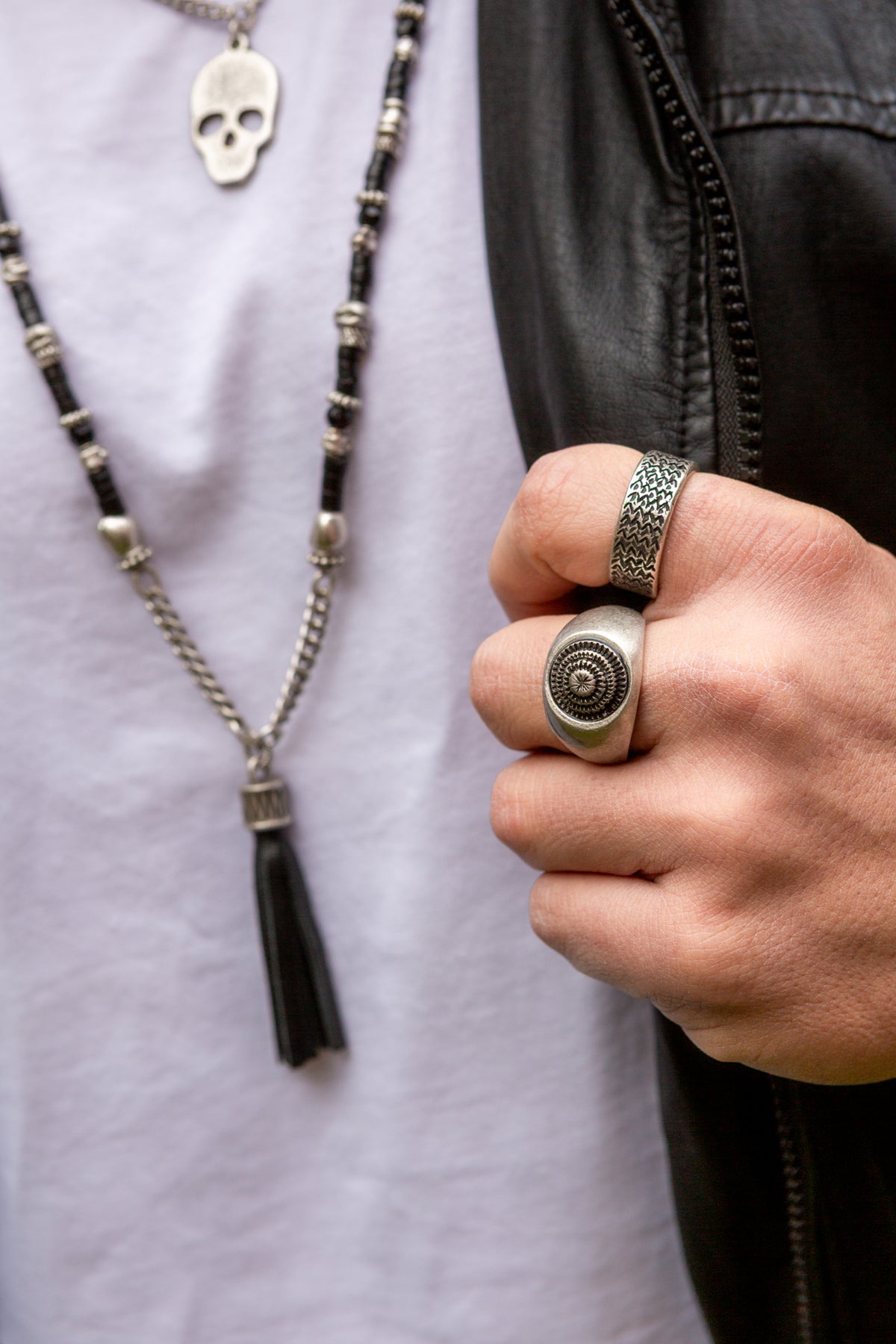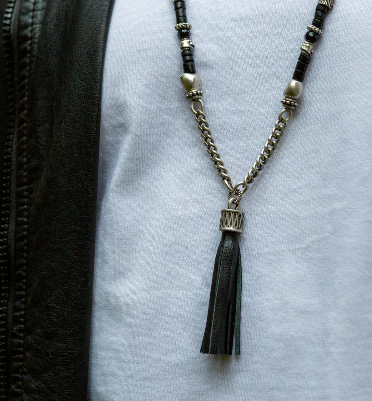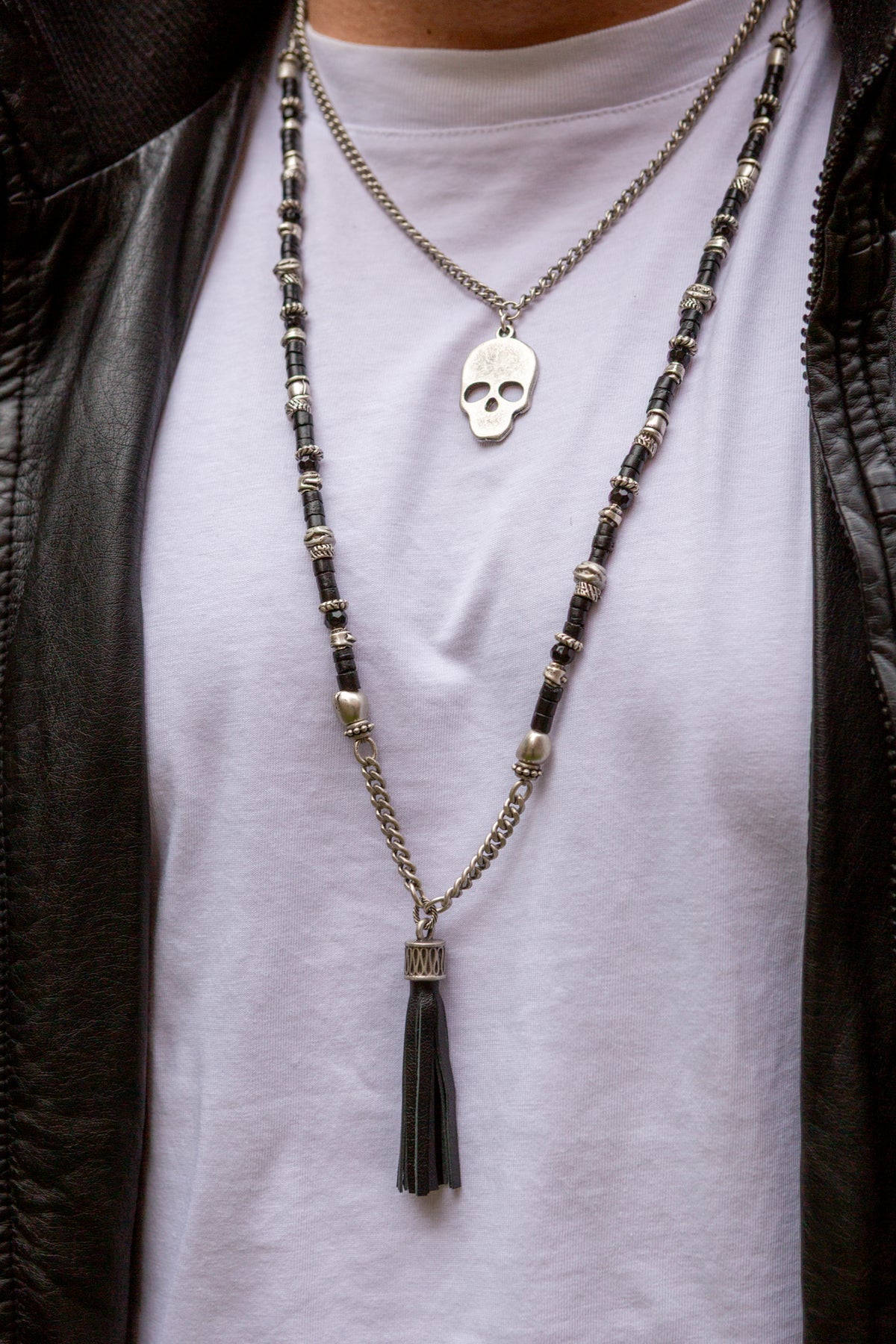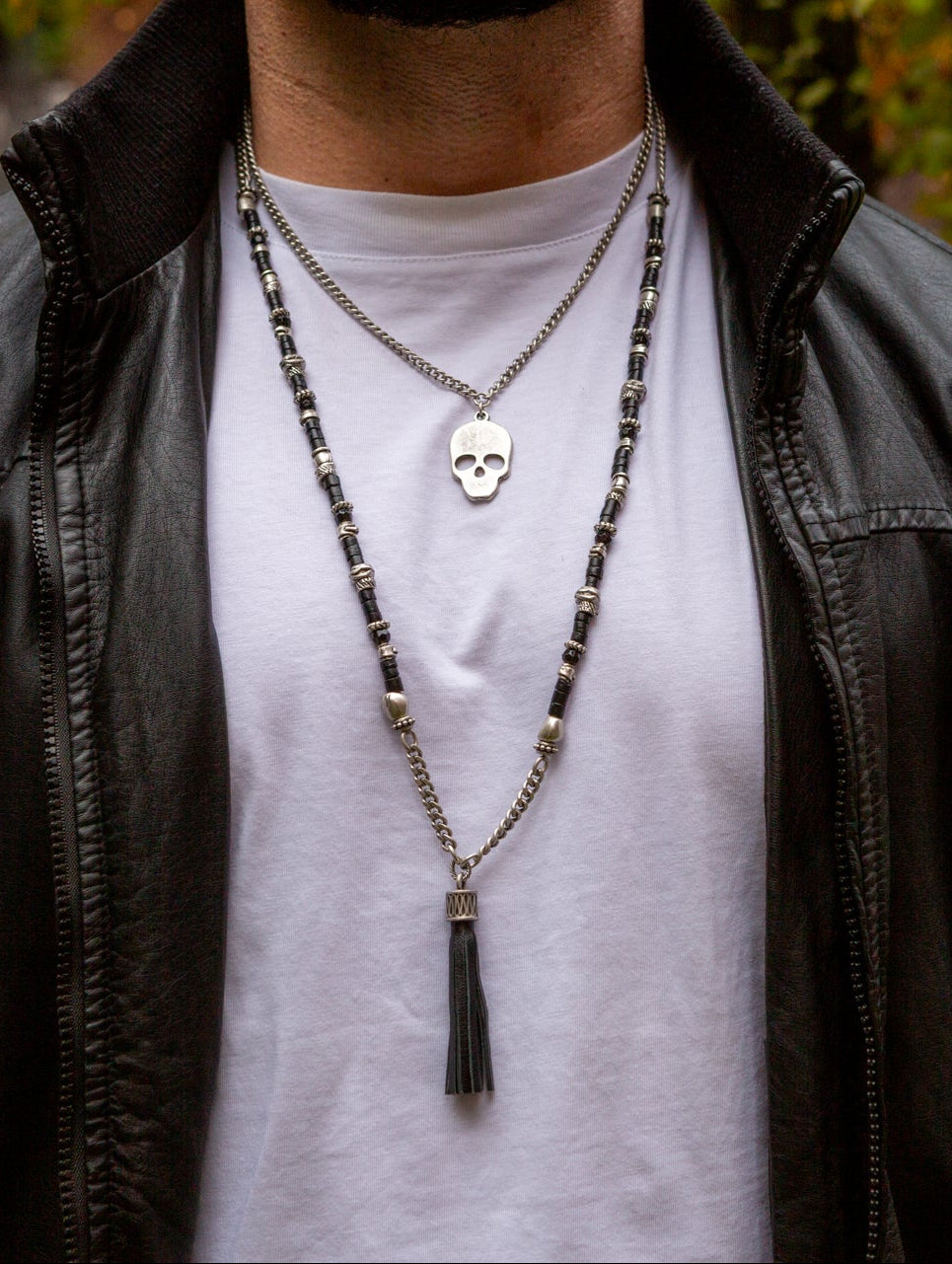 "Urban" è una collana realizzata con componenti in lega seminaturale (zinco, alluminio) e ottone. Il rivestimento è in argento brunito anallergico. La collana Urban ha elementi in metallo alternati a rondelle in legno nero e piccoli cristalli neri. Al centro una nappa in cuoio nero. La collana Urban la puoi indossare da sola o assieme ad altri gioielli Cryady. Per uomo e per donna. Ogni creazione Cryady è realizzata artigianalmente con dedizione e passione.